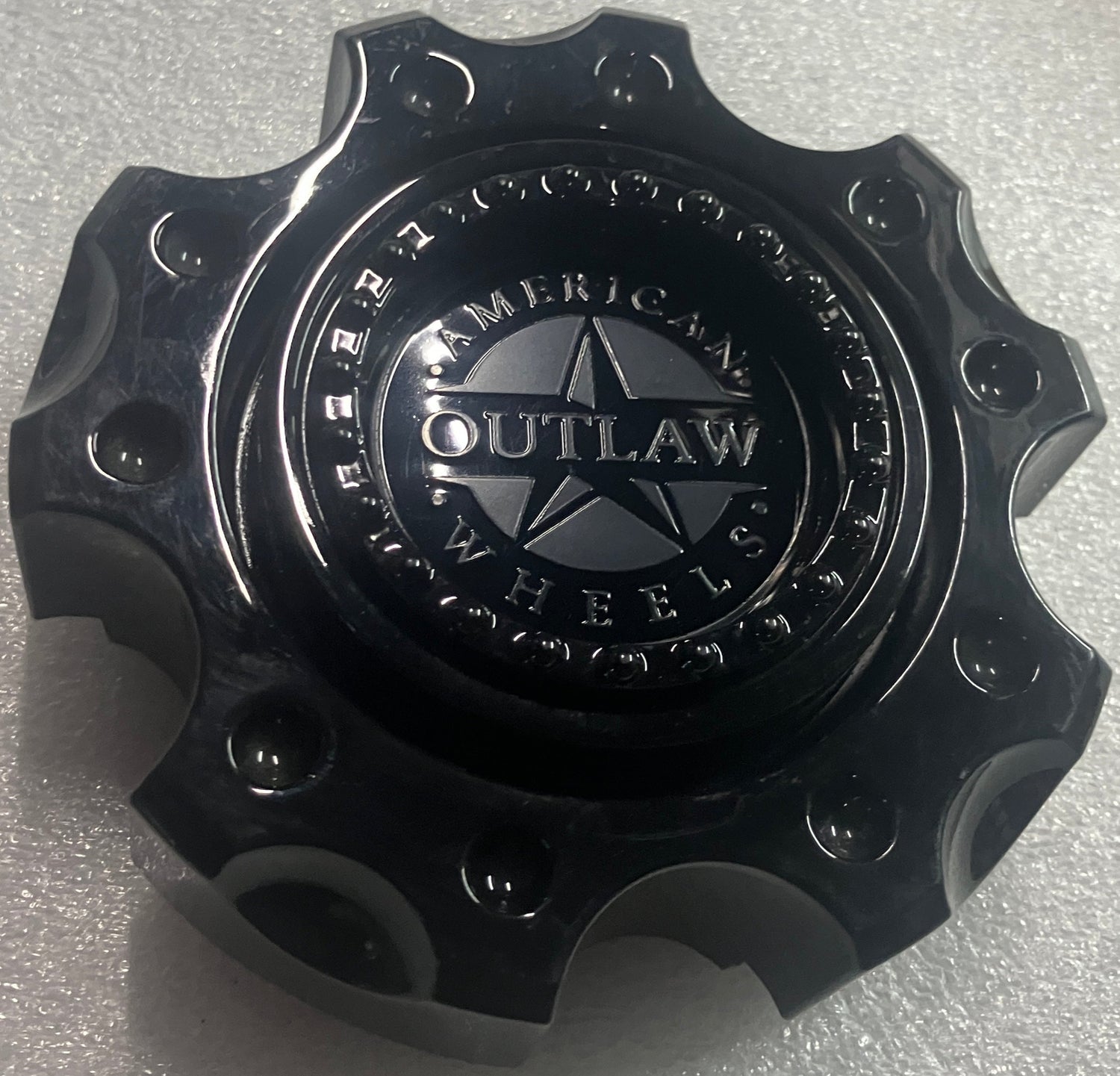 Single American Outlaw center cap. This is a new cap. All the retention clips are intact and in good condition. The cap is the gloss black finish. American Outlaw part number C143-55V
