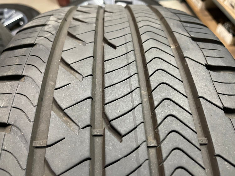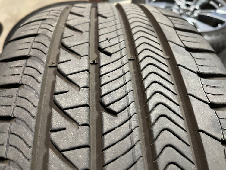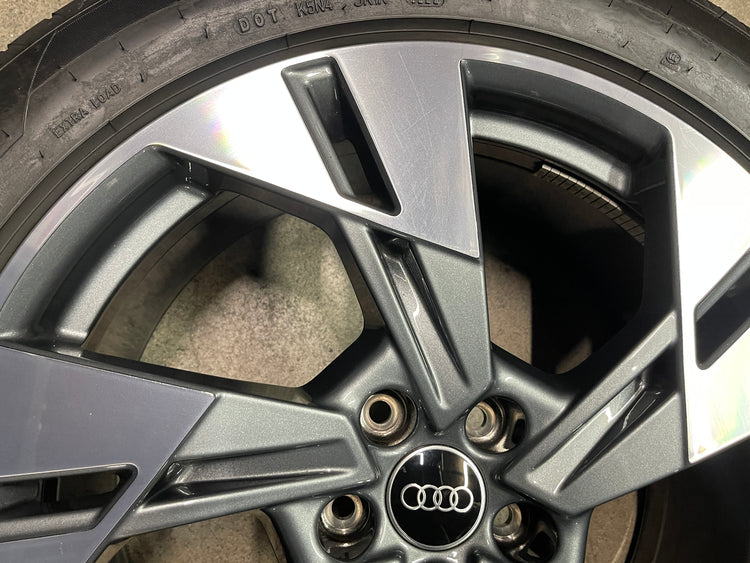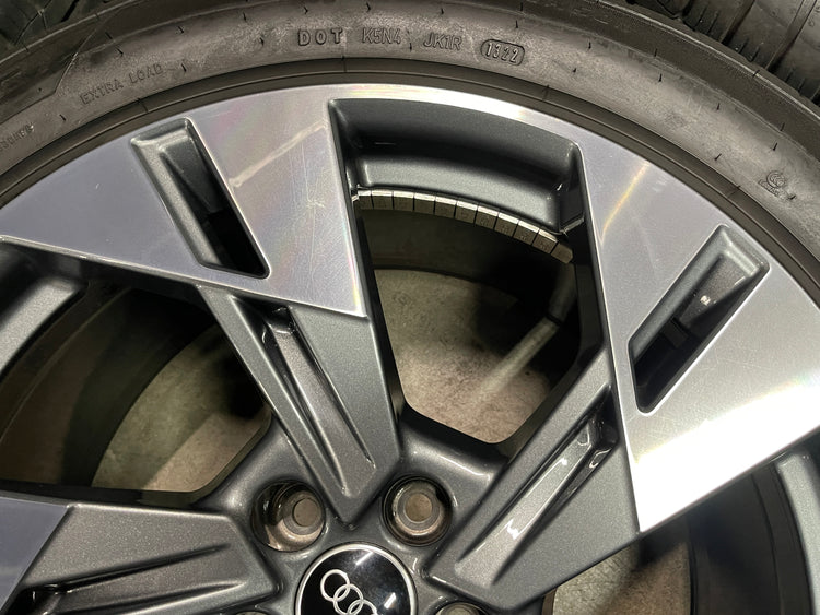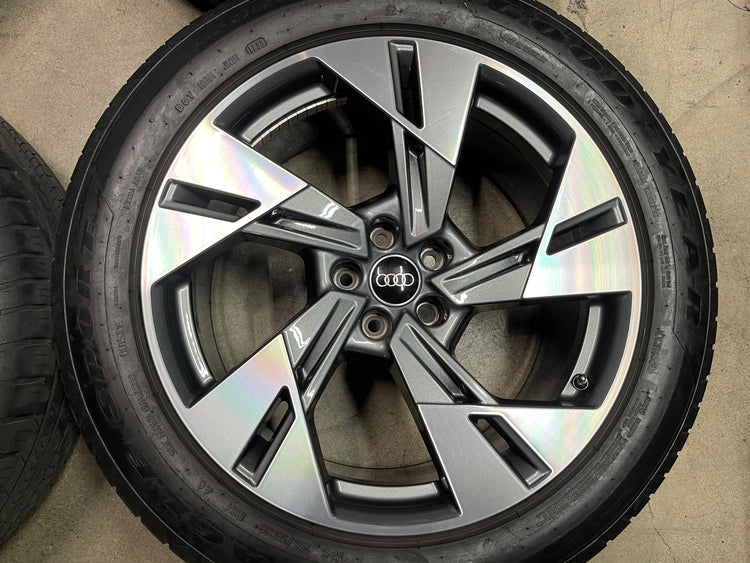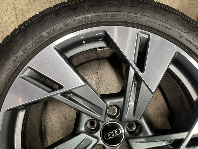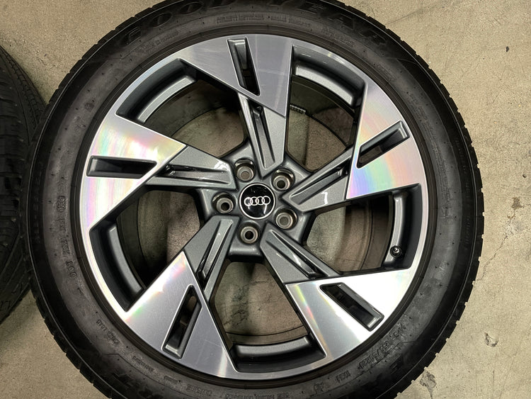 This is a clean used set of factory 2021 2022 2023 Audi E-tron Quattro 20 inch wheels and tires. Has light surface scratches, as shown in pictures. The Goodyear Eagle Sport A/S AO 255/50HR20 have 90% & 80% tread remaining (9/32nd & 8/32nd out of 10/32nd with a 1322 DOT). Caps included, No sensors.