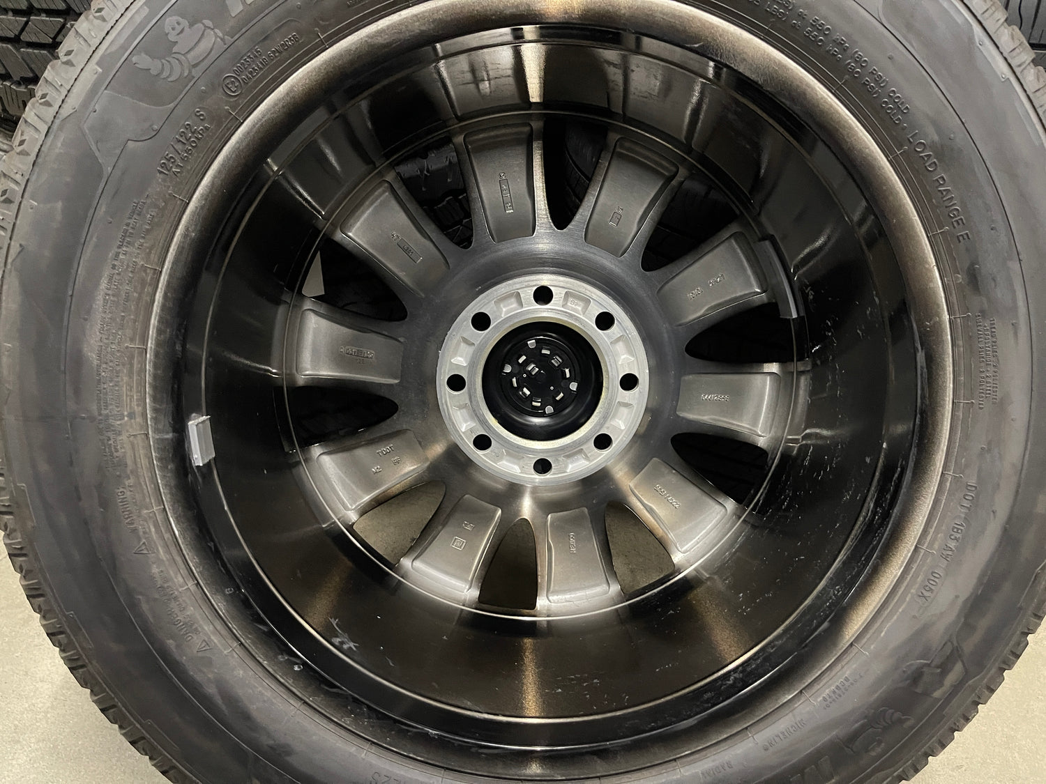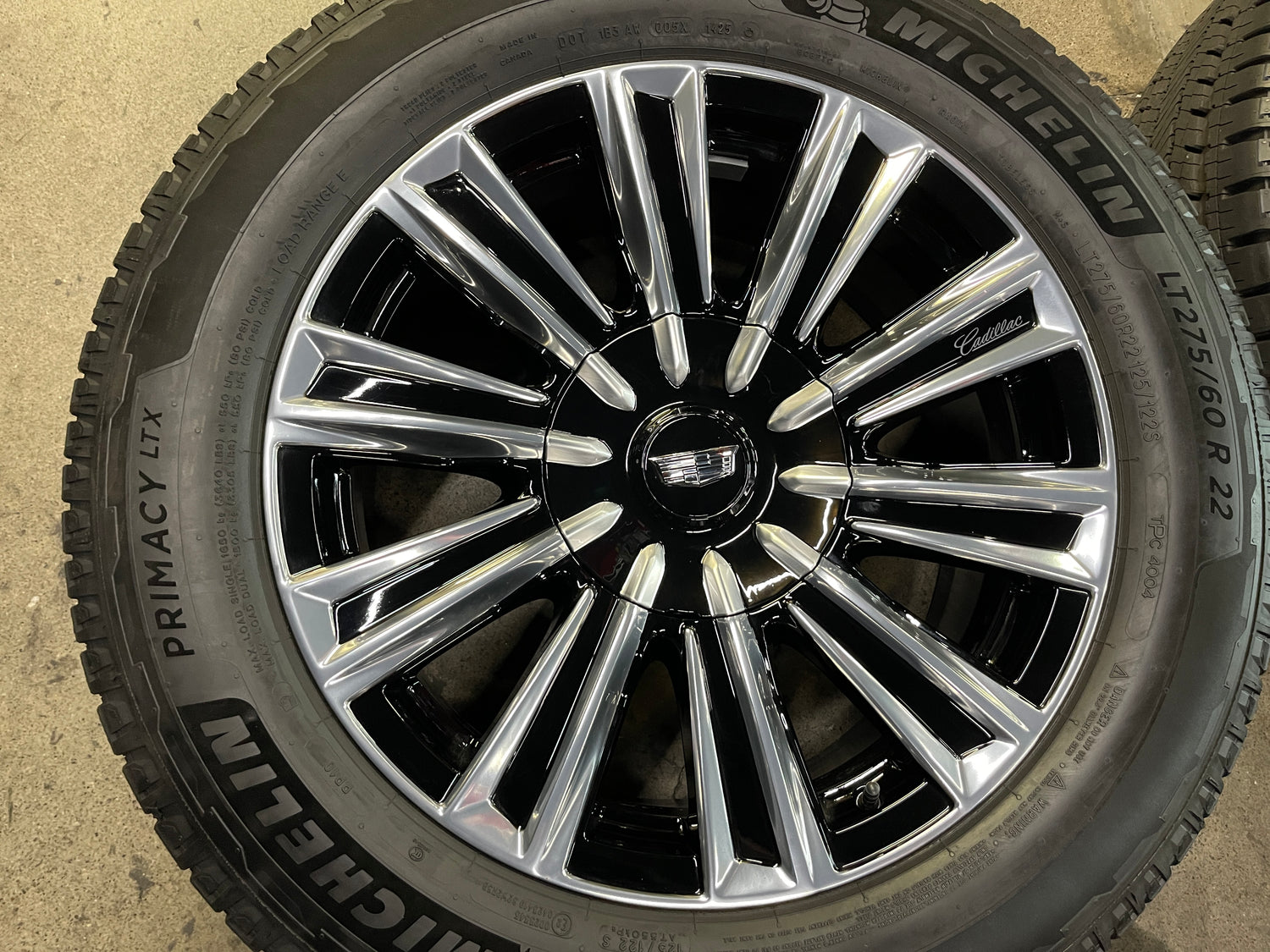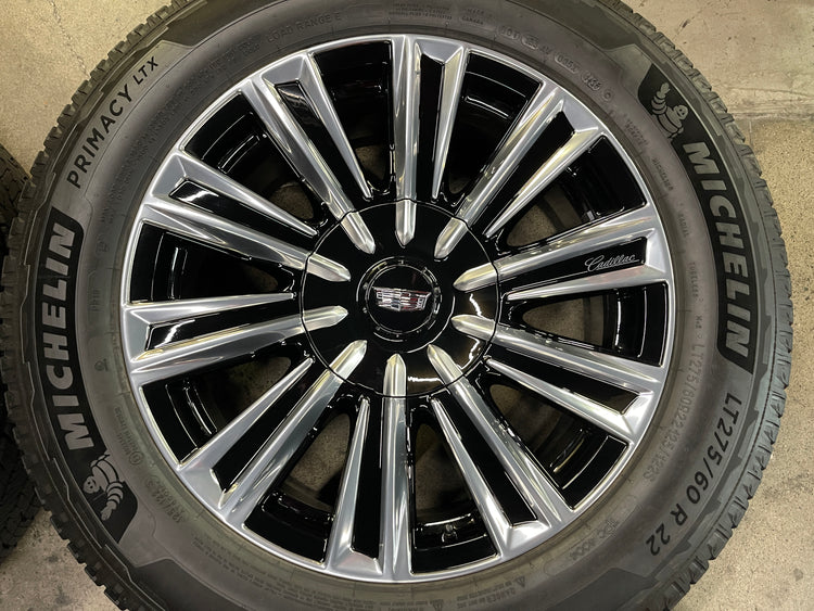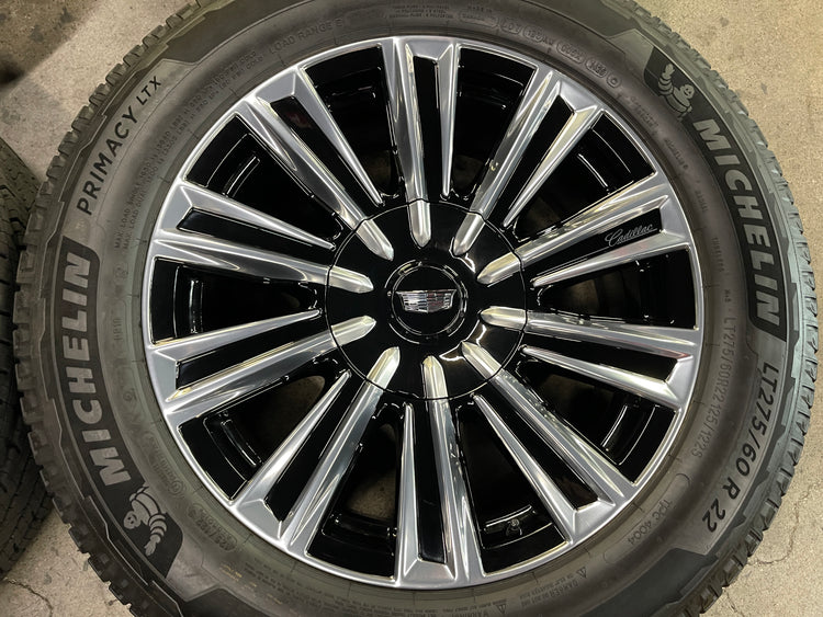 This is a clean Take Off set of factory 2025 Cadillac Escalade IQ 22 inch wheels and tires. OEM black and machined finish. The Michelin Primacy LTX 10 ply LT275/60R22 tires have 99% tread remaining with a 1425 DOT. Caps included. Sensors included. Note: The Escalade IQ (EV) is an 8 lug vehicle, will NOT fit your Escalade 6 lug.... (Note: light scuffs not visible in pictures are possible when looking up close) Note: The sensors are free, no cash value, no guarantee they will be compatible with your vehicle.