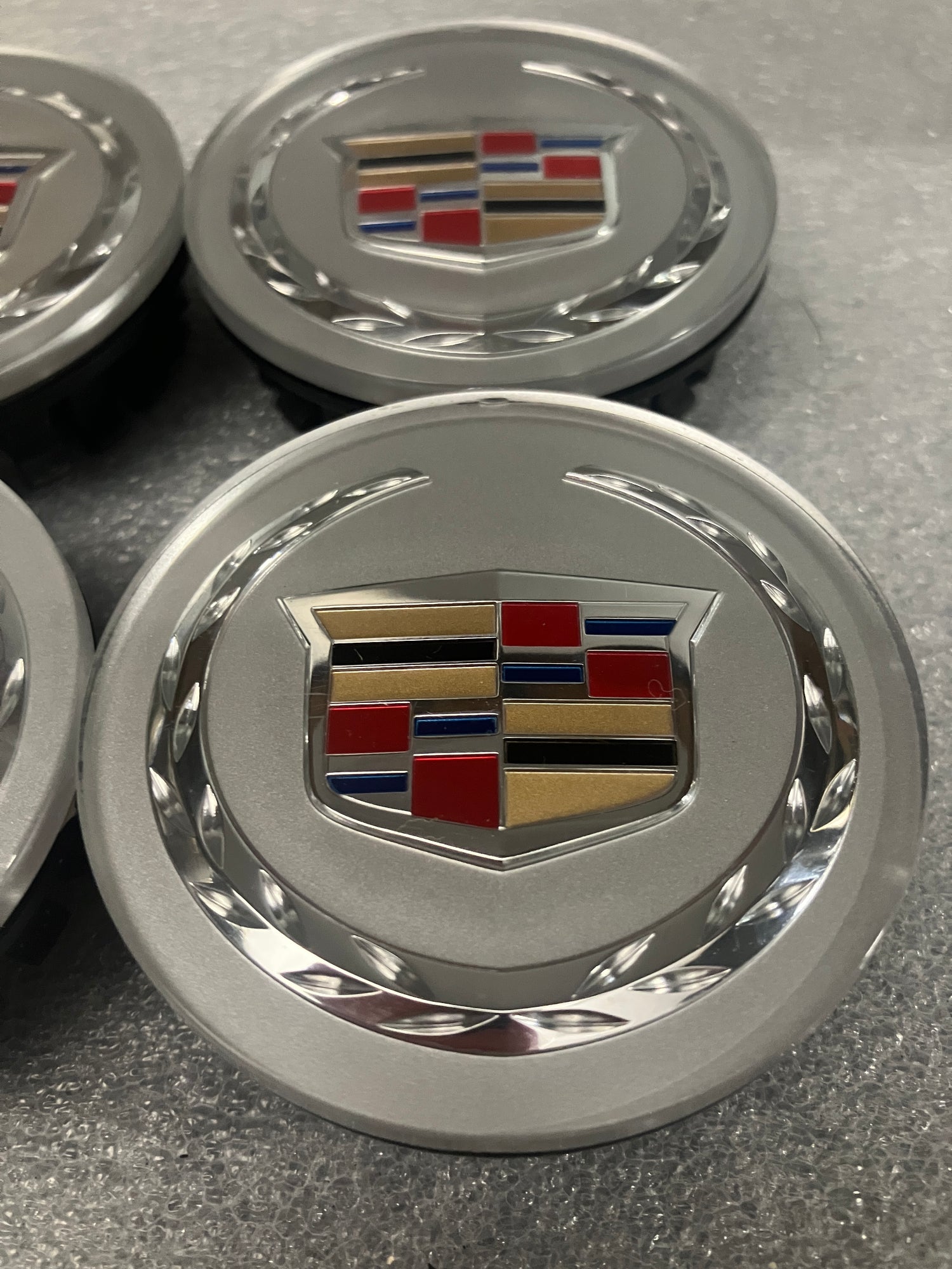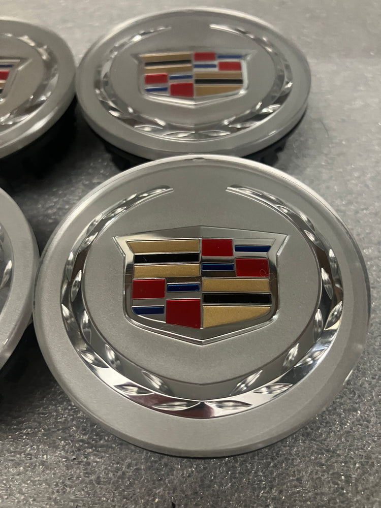 This is a set of Authentic, OEM, Cadillac center caps in take off condition. These are in excellent condition, they are REAL Cadillac parts. They fit numerous Cadillacs from 2004-2020. All the retention clips are intact and in good condition. They are 2&5/8" diameter. Cadillac/GM part number 9597375.
