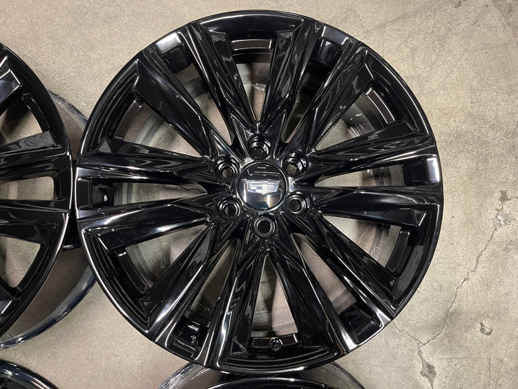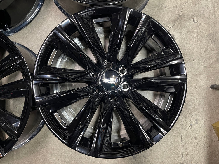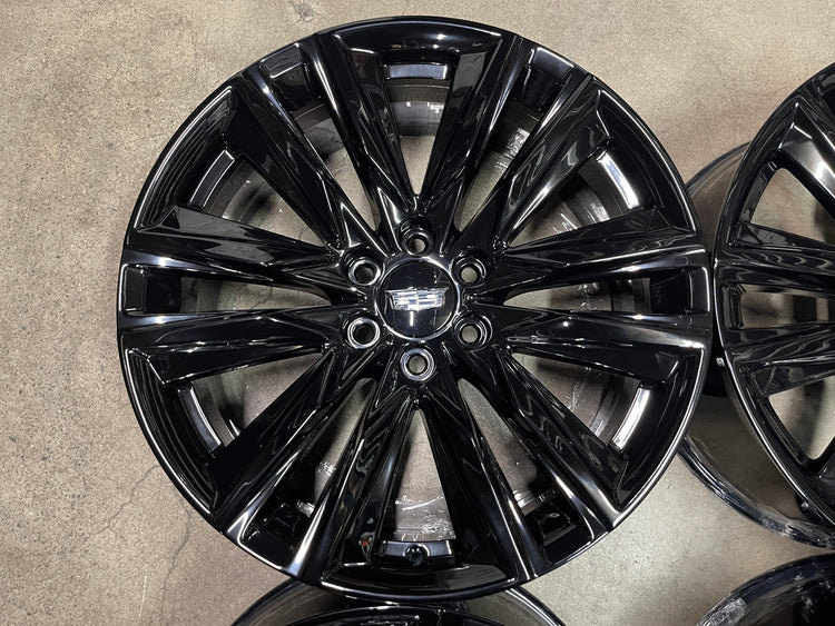 This is a set of factory 2024 Cadillac Escalade 22 inch wheels. Refinished with a Gloss black powder coating. OEM Caps included. NO sensors.