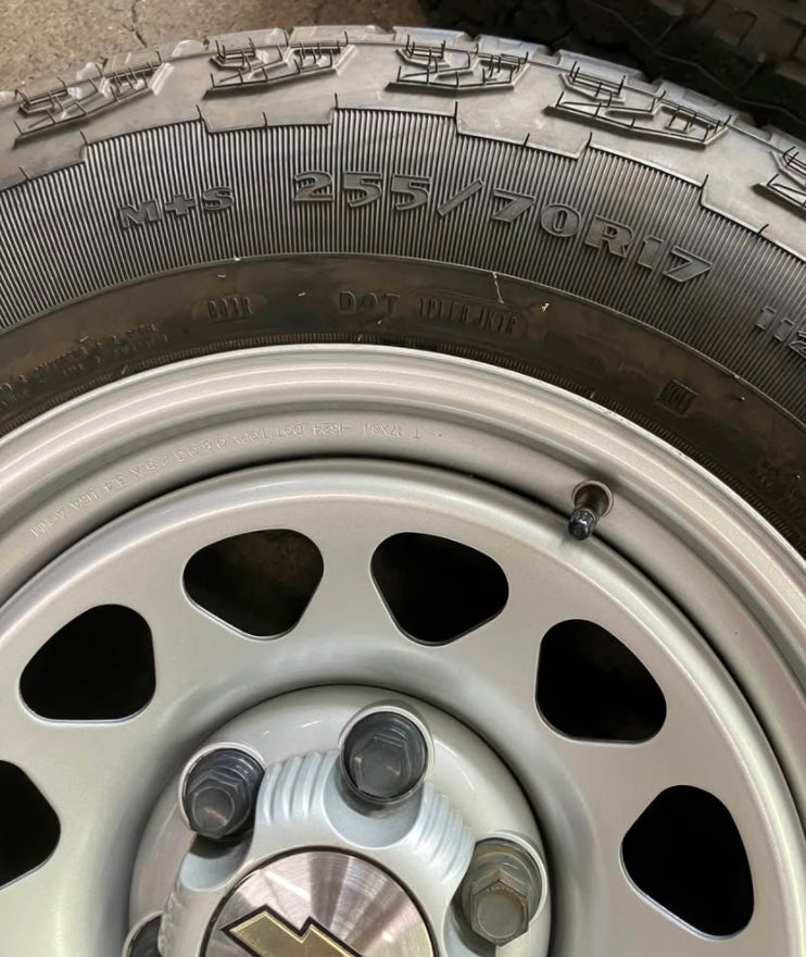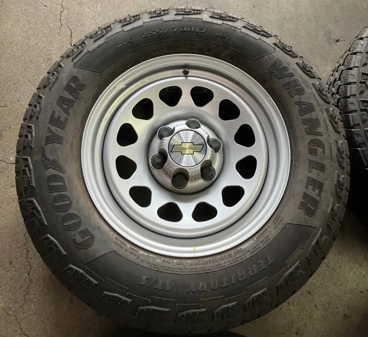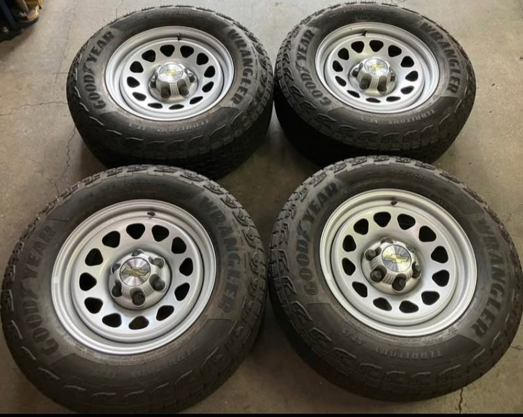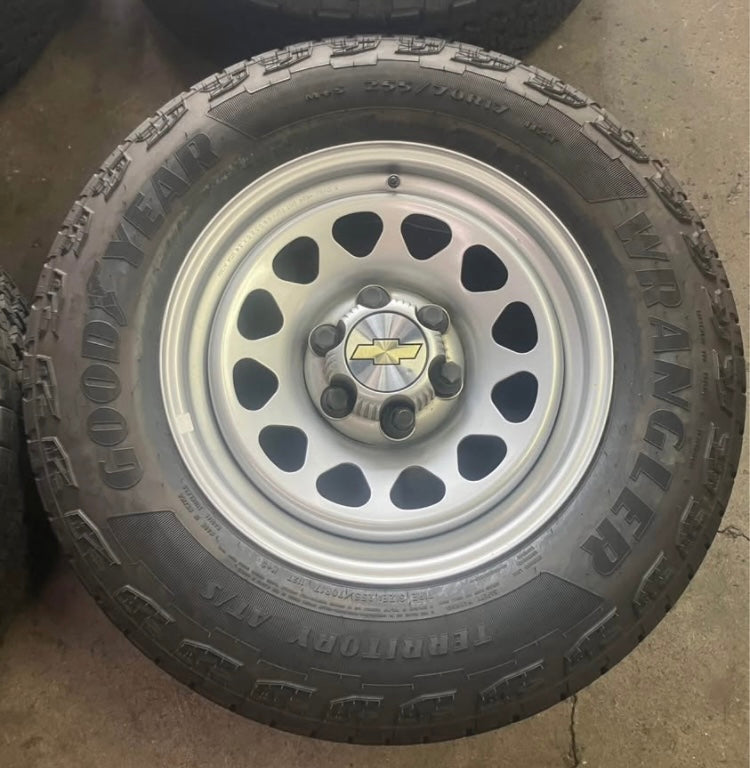 Up for sale is a nice set of 2025 Silverado 1500 17" steel wheels on 255/70R17 Goodyear Territory All Terrain tires. The wheels are in take off condition and the tires have 9 32nds left out of 10 (90% tread left with a 0124 DOT). These will fit Chevy and GMC 1500 Trucks and SUV from 2000-2025. Chevy Caps included, Lug Nuts included (required to hold the caps) No sensors. Note: All used wheels may have blemishes not visible in pictures when looking up close.