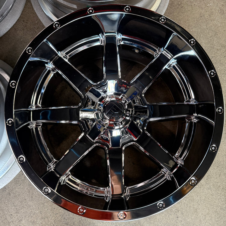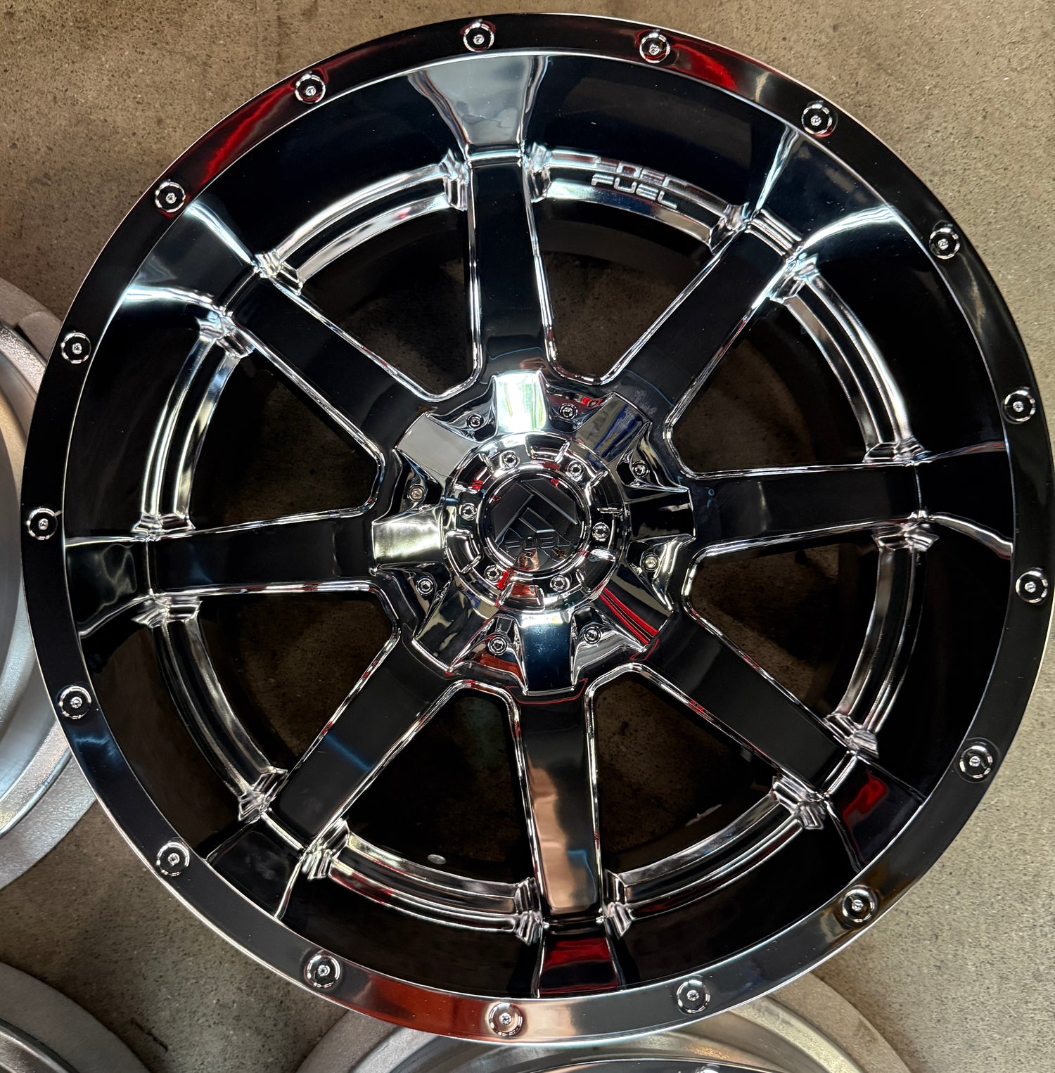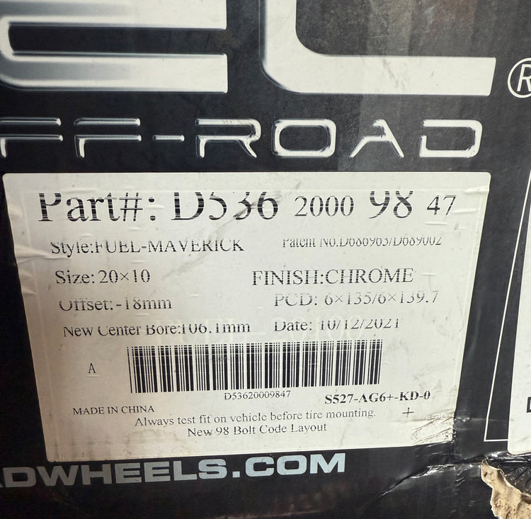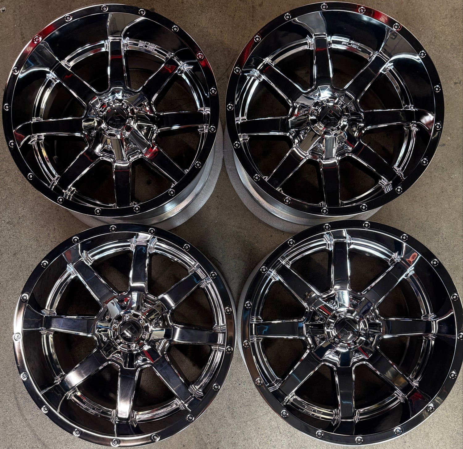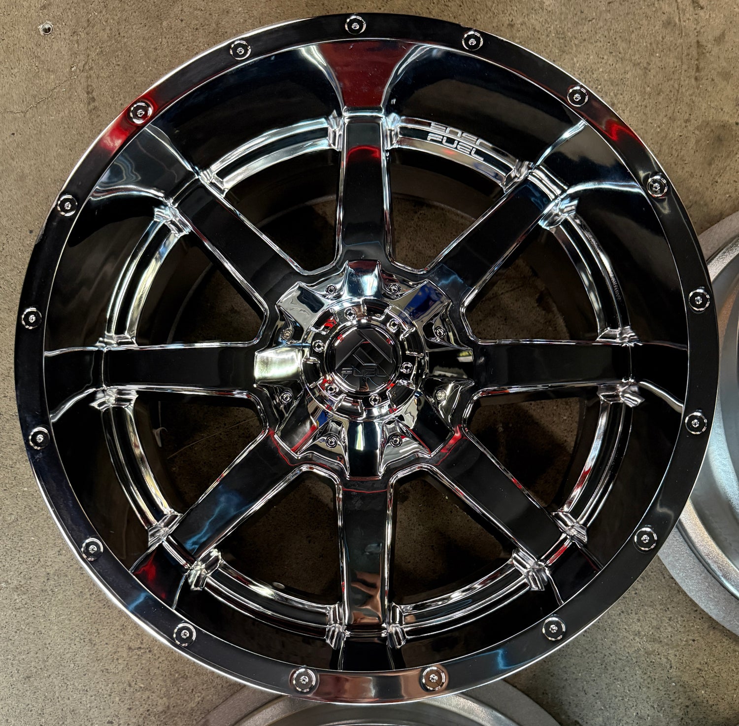 Mounted / Displays / Inventory clearance / Sold as is / No warranty / No returns. This is a set of Fuel Maverick 20x10 -18mm chrome wheels, Mounted displays / never driven. (-25% from List with free shipping) Dual drilled 6x135 6x5.5 to fit your lifted F150 Silverado Tahoe Suburban GM 1500, Sierra Yukon... Requires a lift Kit !!! Caps and hubrings included, No sensors. (Note: The Maverick in that size has 2 stem holes, one for the stem, one for the sensor)