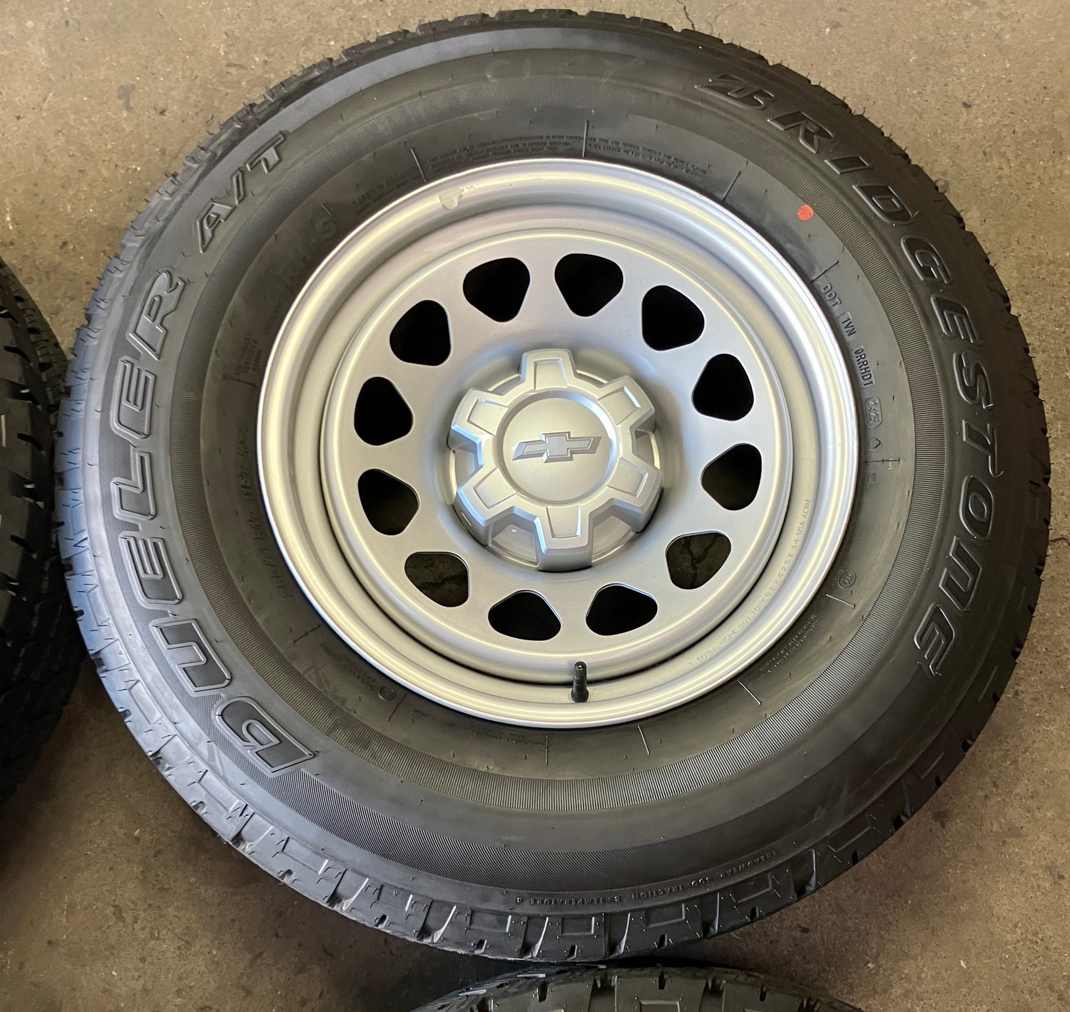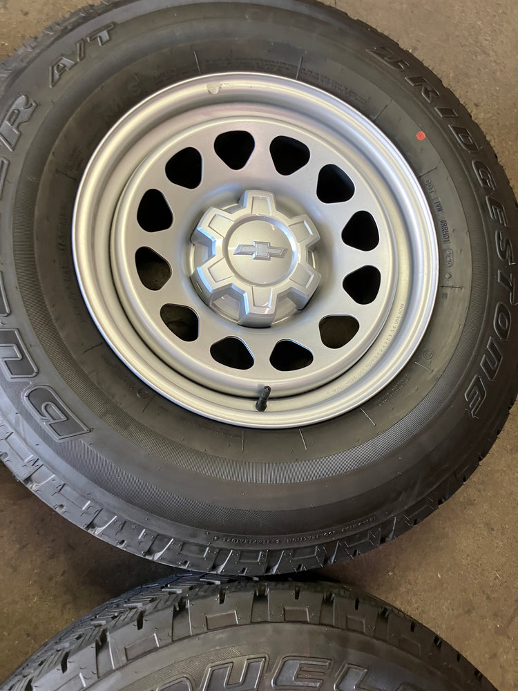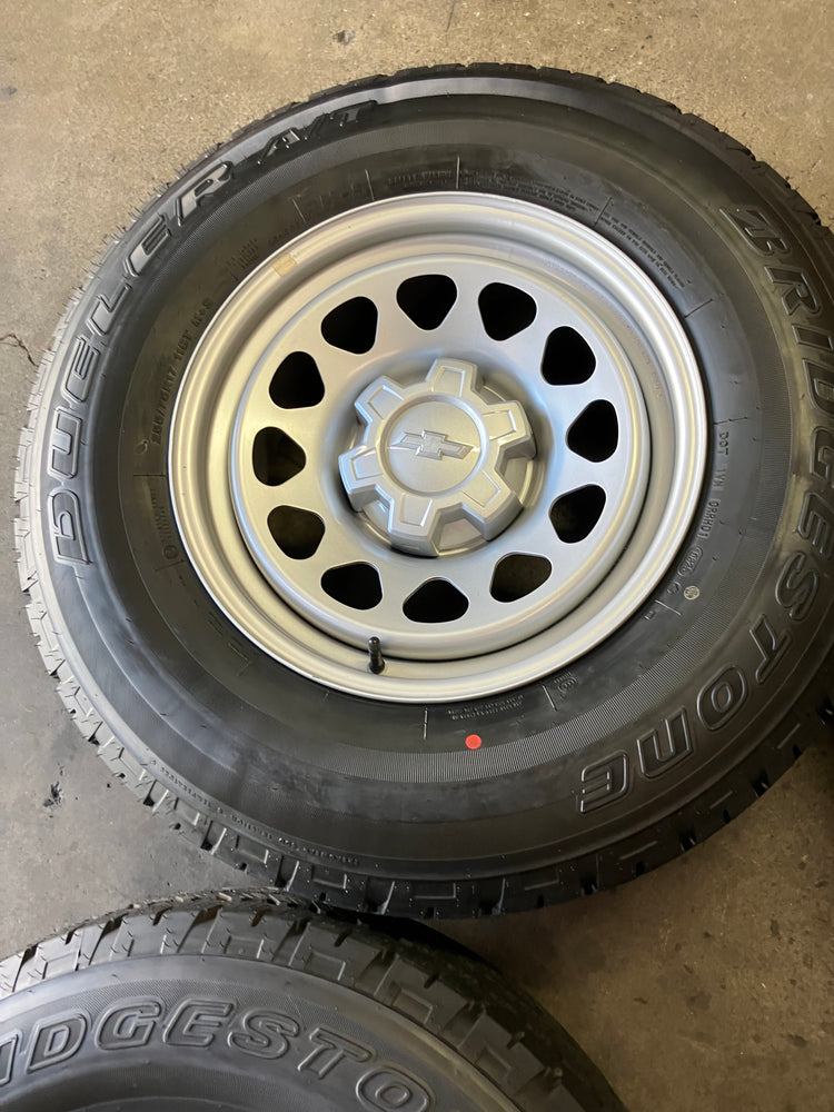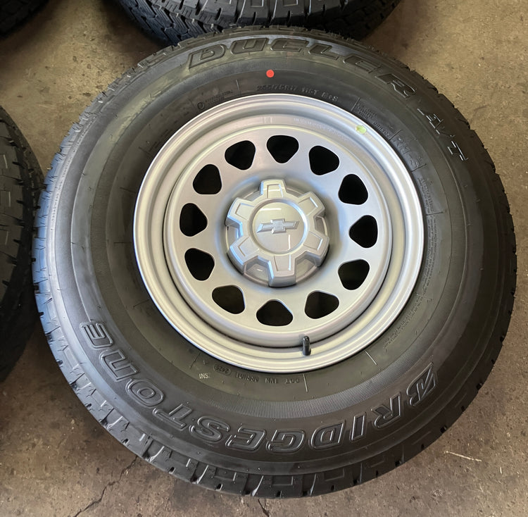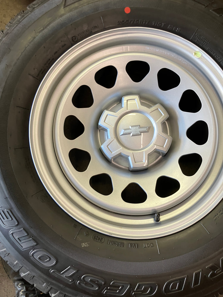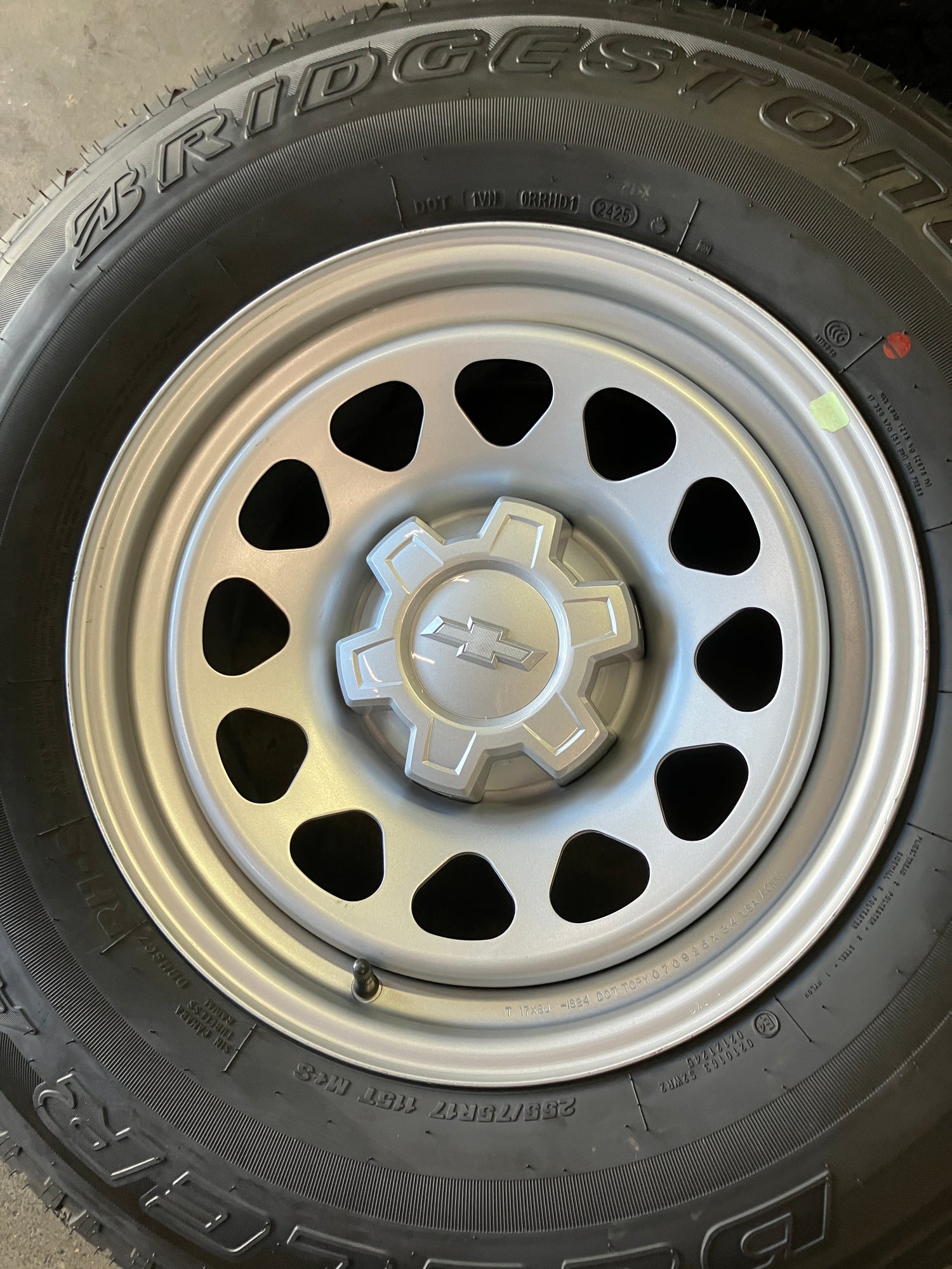Up for sale is a nice set of factory 2025 Chevy Silverado 1500 17" steel wheels on 255/75R17 Bridgestone Dueler All Terrain tires. The wheels are in take off condition and the tires have 99% tread left with a 0825 DOT. These will fit Chevy and GMC 1500 Trucks and SUV from 2000-2025. Chevy Caps included, Lug Nuts included (required to hold the caps), sensors which are compatible with 2022-2025 Silverado, Tahoe, Sierra, and Yukon 1500 are included and installed. Note: sensors are free, no cash value, no guarantee they are compatible with your vehicle. Note: All used wheels may have blemishes not visible in pictures when looking up close.
