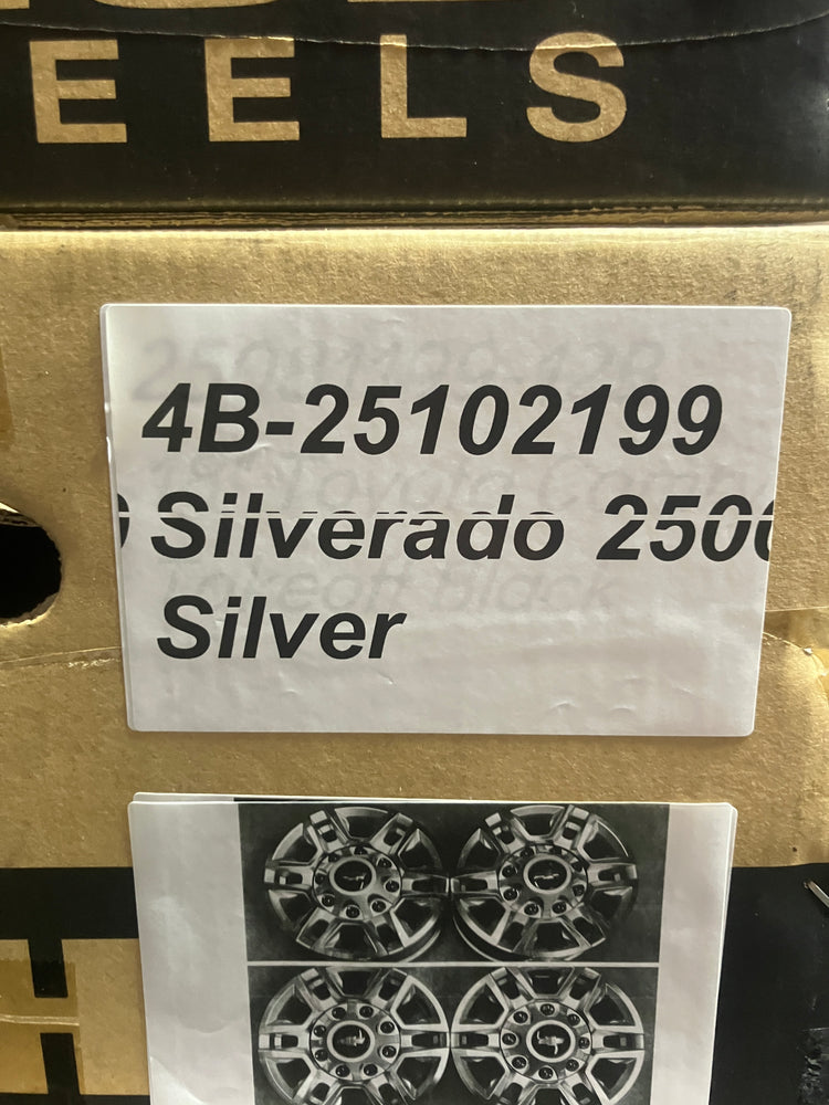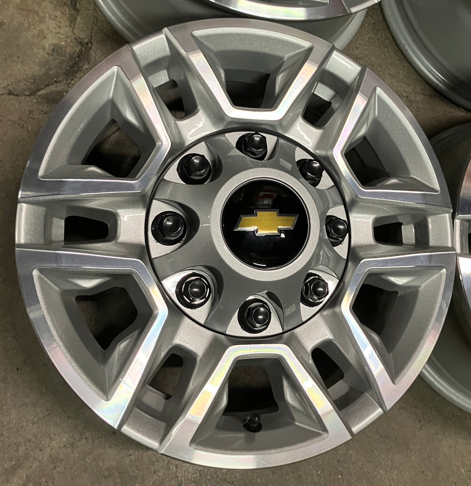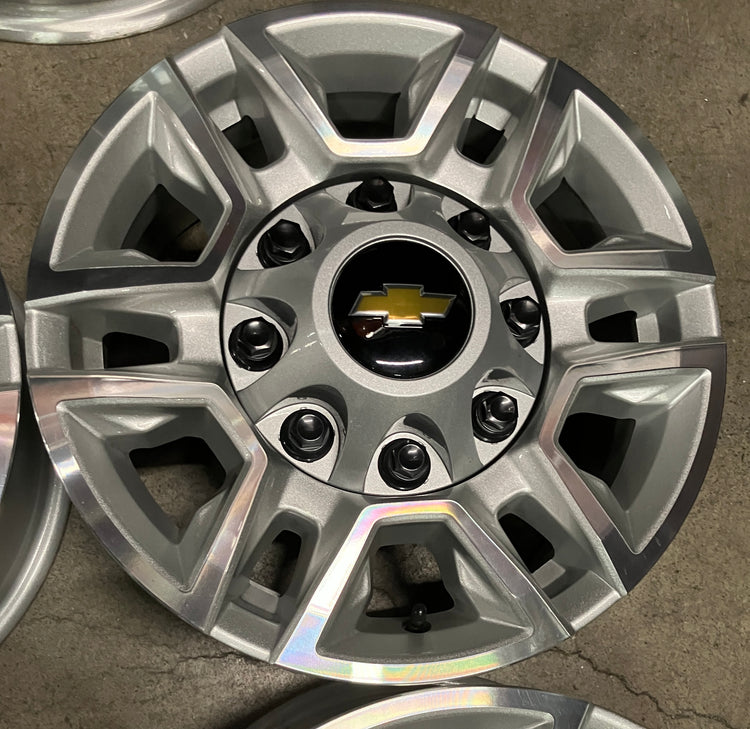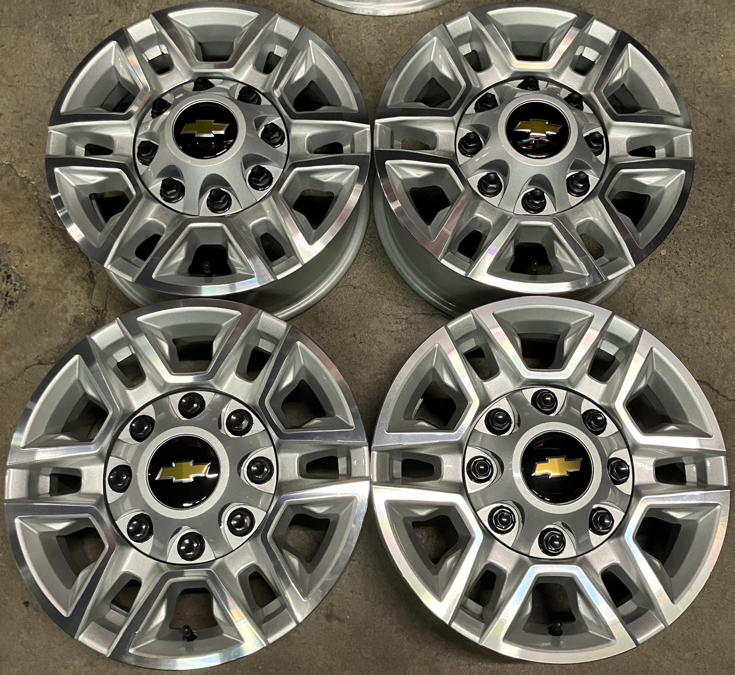 Up for sale we have a clean take Off set of 2025 Chevrolet Silverado 2500 OEM 17 inch  wheels. These are in very good condition. These are original wheels for Silverado and Sierra 2500 trucks from 2020-2025. Chevy caps included, no sensors. Note" All used wheels may have blemishes not visible in pictures when looking up close.