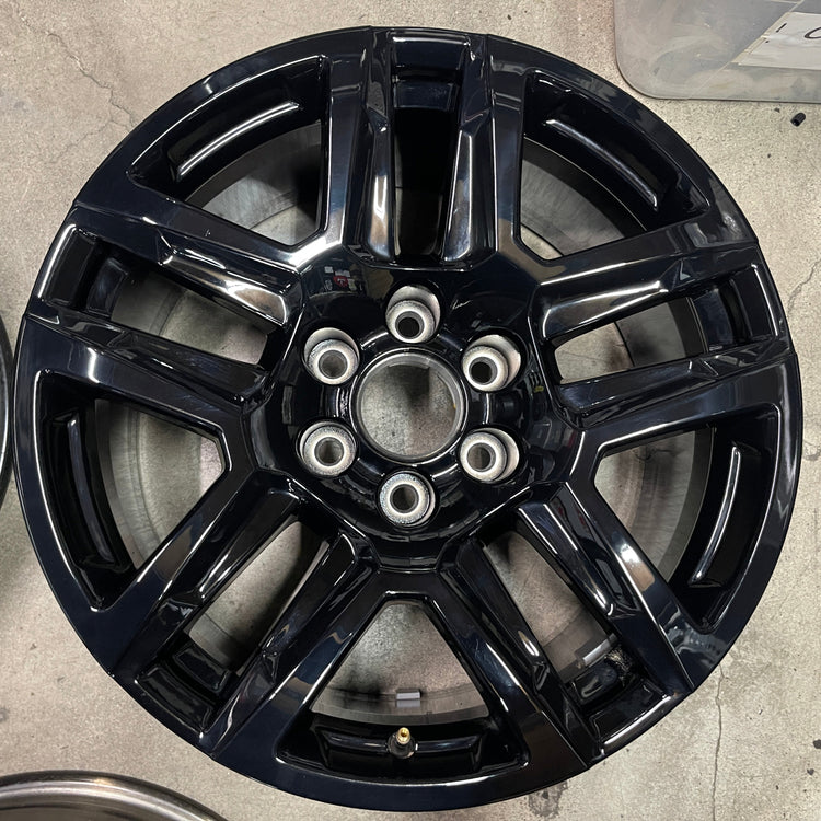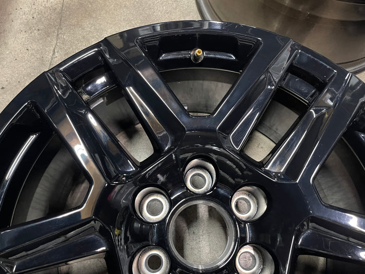 This is a gently used, single (1) factory 2019 2020 2021 2022 2023 2024 2025 Chevy Silverado 20 inch wheel. Factory gloss black oem finish. no cap, no sensors. Fits GMC Sierra as well.... (All used wheels can show some light scuffs not visible in pictures when looking up close)