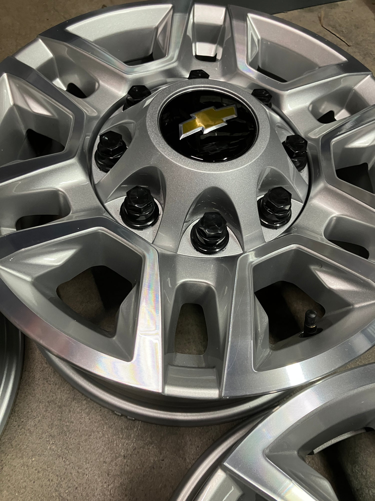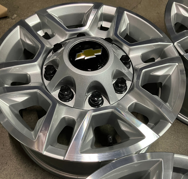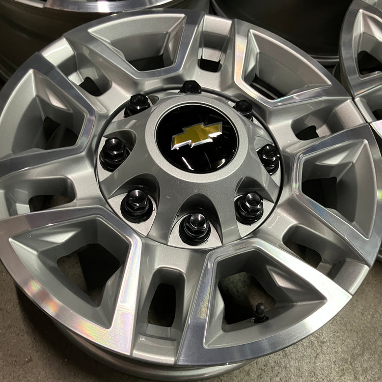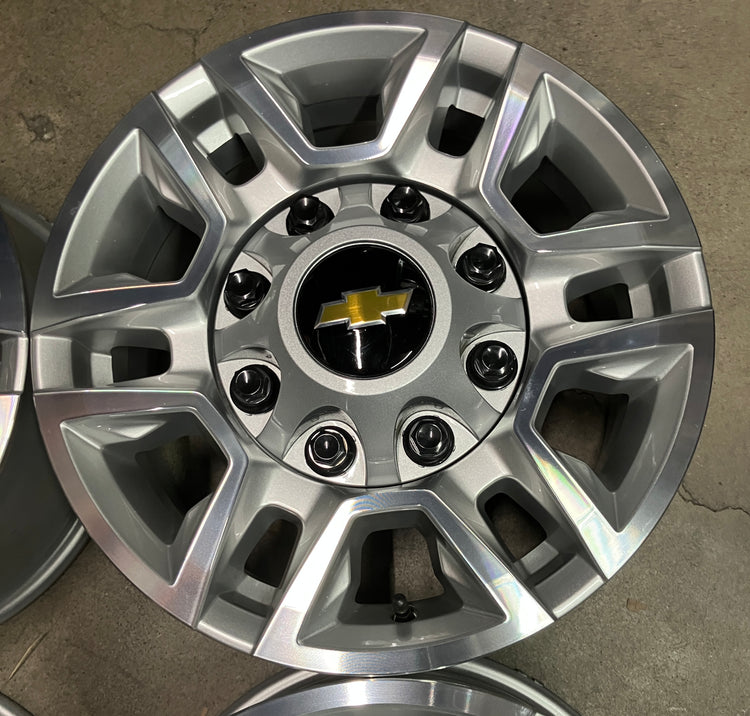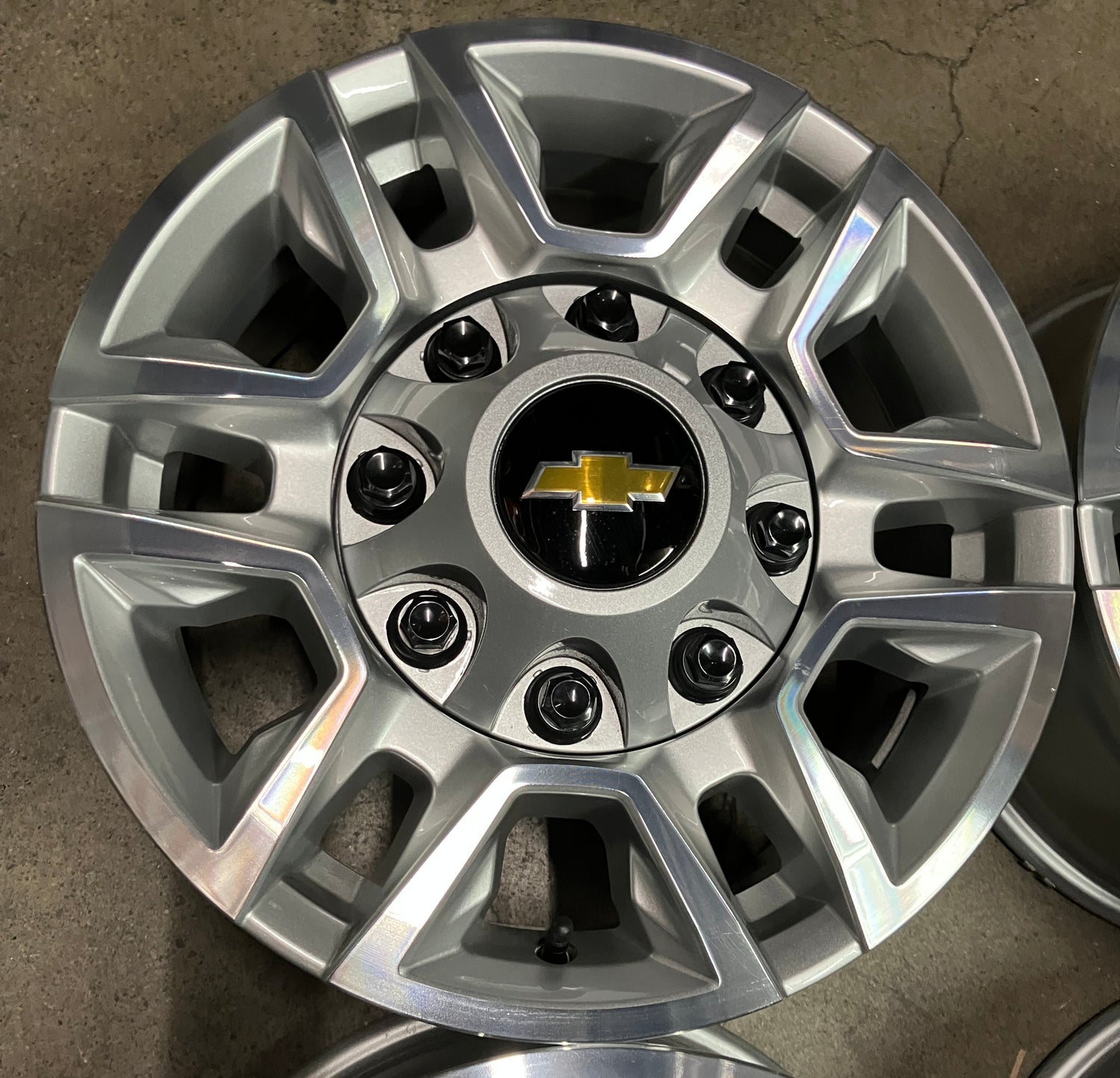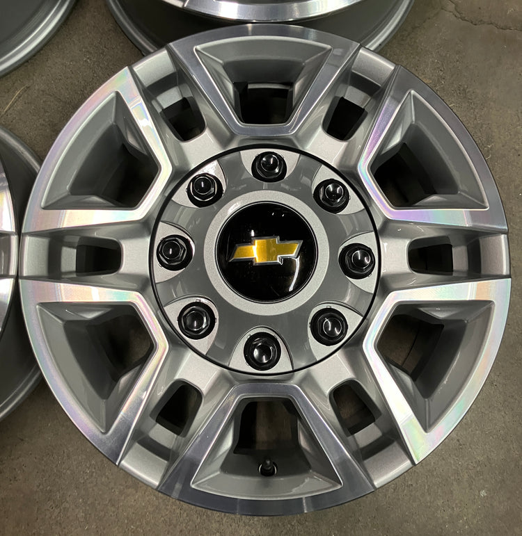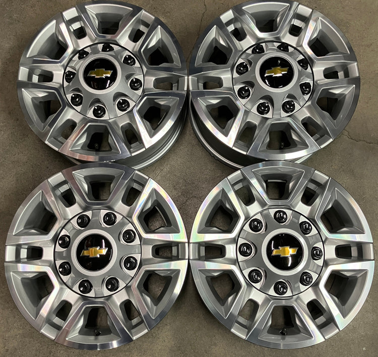 Up for sale we have a clean take Off set of 2025 Chevrolet Silverado 2500 OEM 17 inch  wheels. These are in very good condition. These are original wheels for Silverado and Sierra 2500 trucks from 2020-2025. Chevy caps included, no sensors. Note" All used wheels may have blemishes not visible in pictures when looking up close.