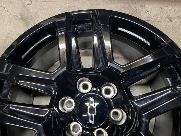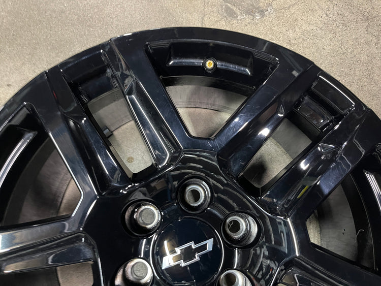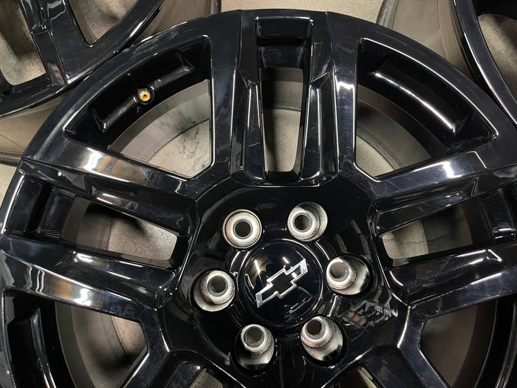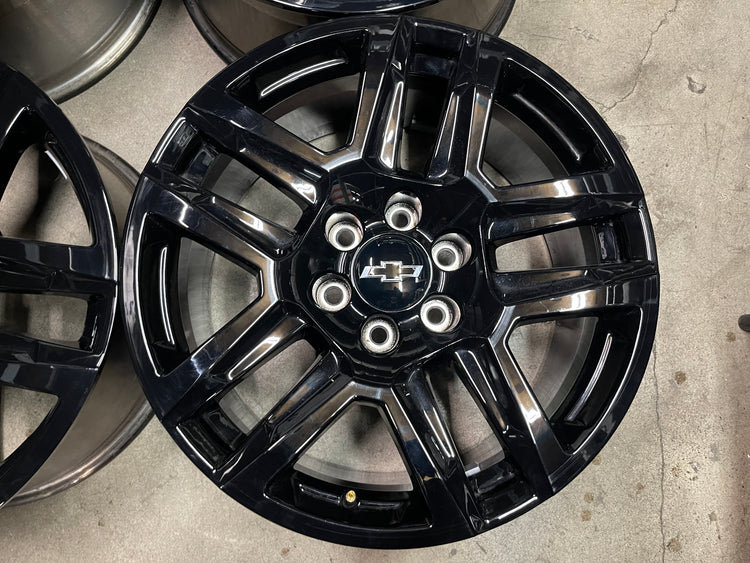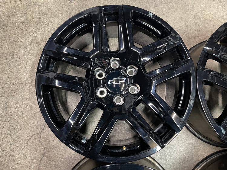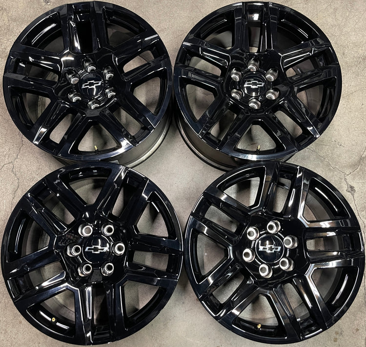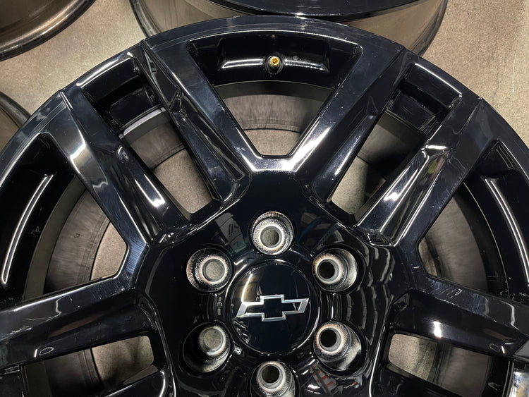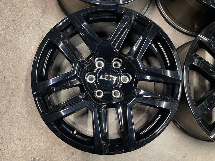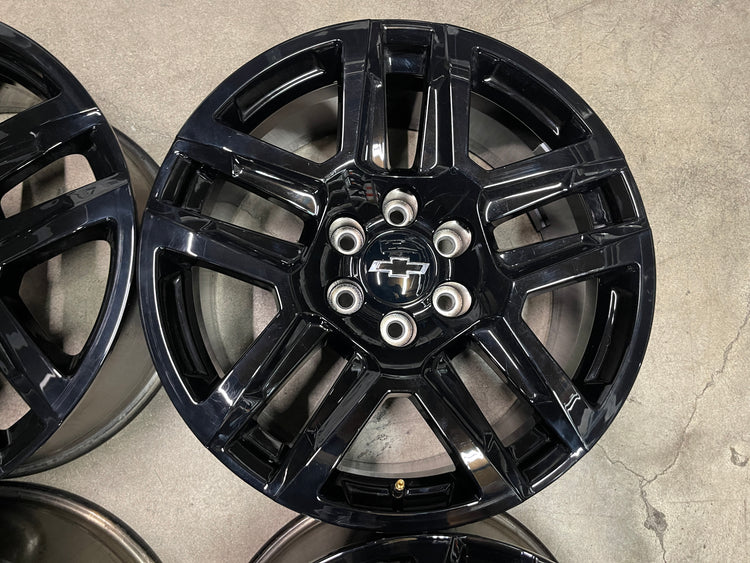 This is a take-off set of factory 2019 2020 2021 2022 2023 2024 2025 Chevy Silverado 20 inch wheels. Light surface scratches. Factory gloss black oem finish. Chevy Caps included, no sensors. Fits GMC Sierra as well....