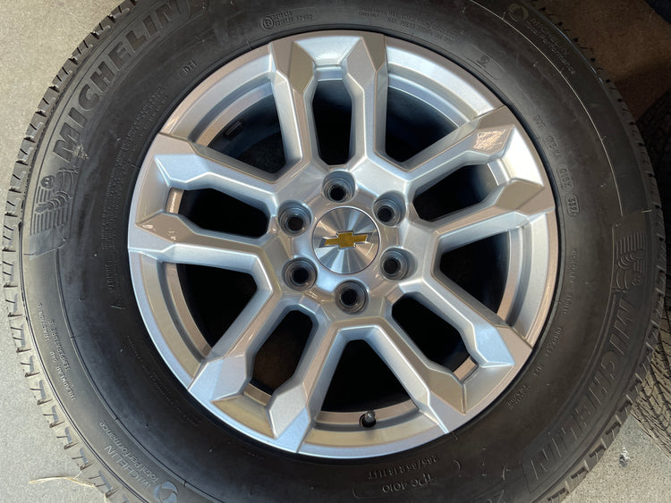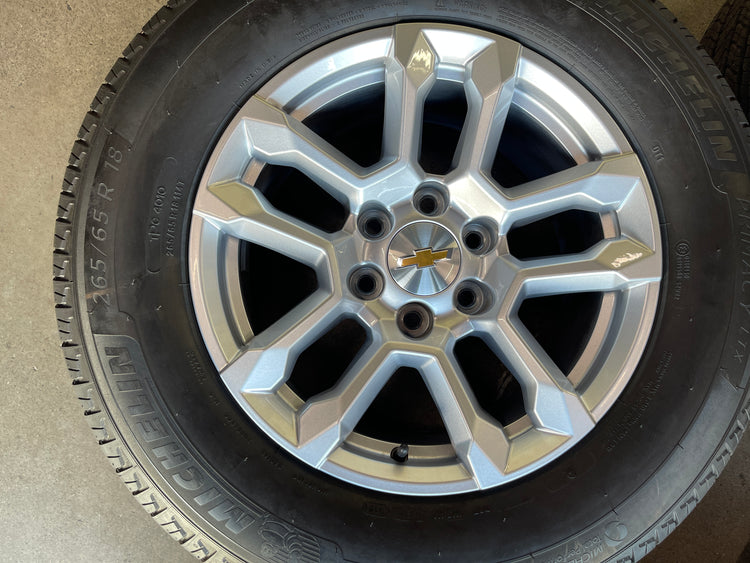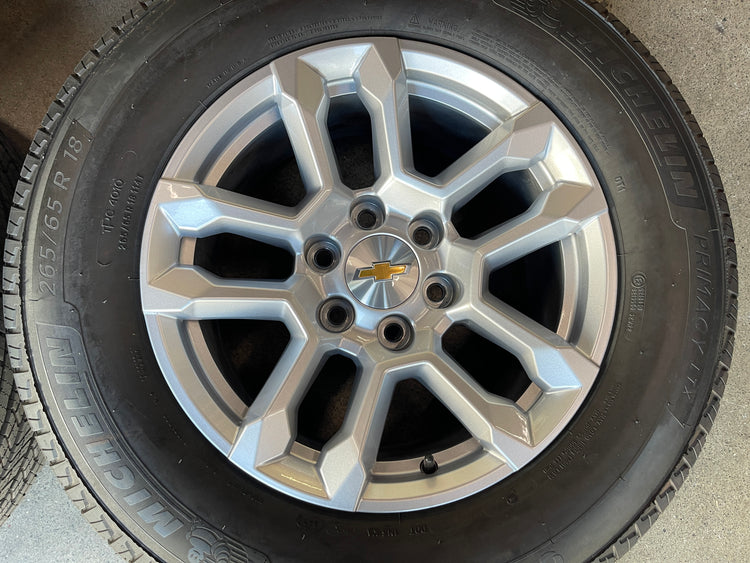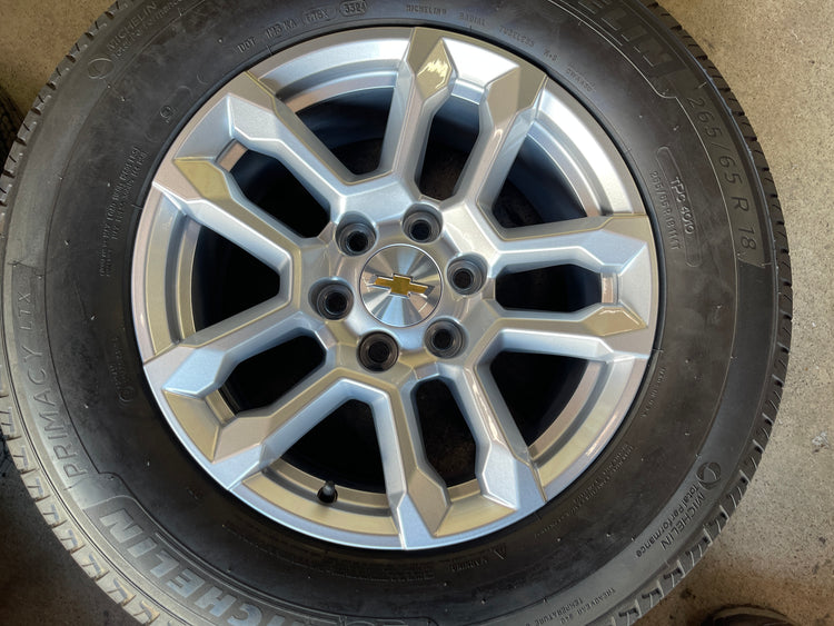 This is a clean Take Off set of factory 2024 2025 Chevy Silverado / Tahoe / 1500 18 inch wheels and tires. The Michelin Primacy LTX 265/65TR18 tires have 99% tread remaining with (DOT 3324). Caps included. No sensors.