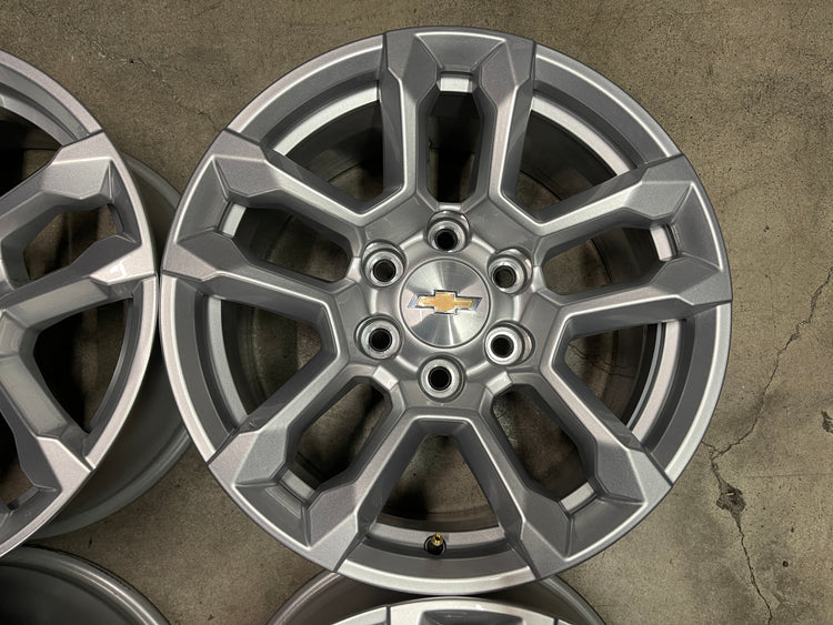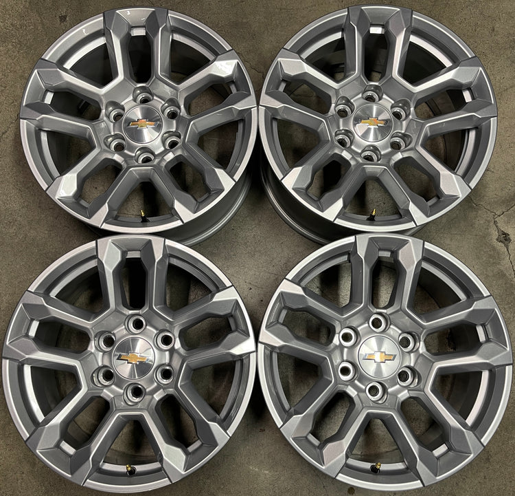 This is a clean Take Off set of 2022 2023 2024 2025 Chevy Silverado 18 inch wheels. Caps included. No sensors. Fits all previous years 1999 and newer.