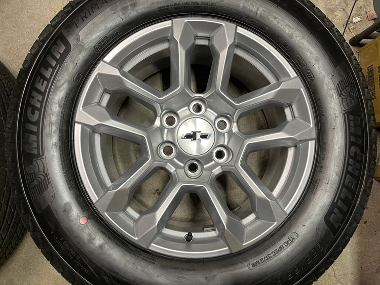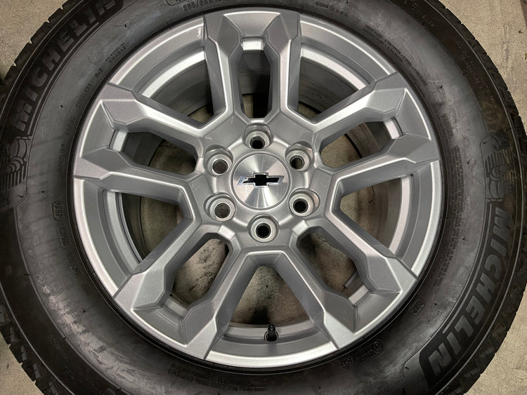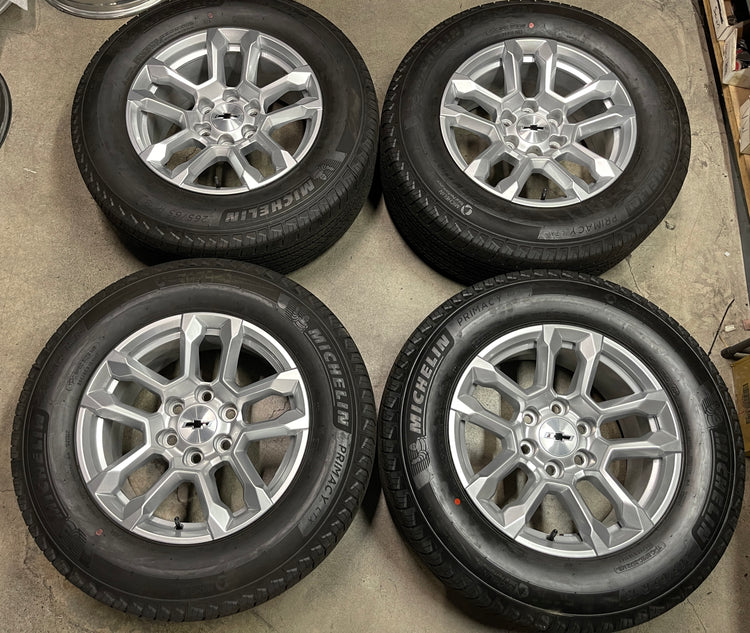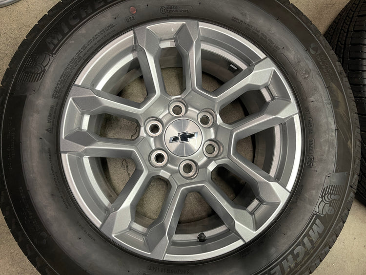This is a clean Take Off set of factory 2024 2025 Chevy Silverado / Tahoe / 1500 18 inch wheels and tires. The Michelin Primacy LTX 265/65TR18 tires have 99% tread remaining with (DOT 4524). Caps included. No sensors.