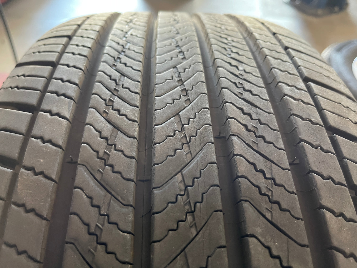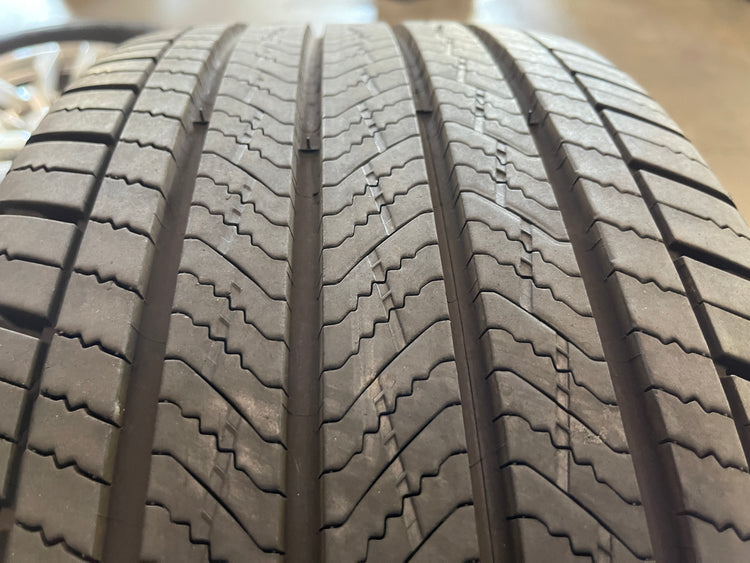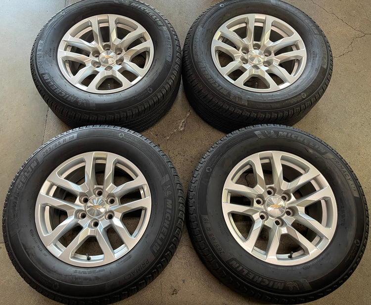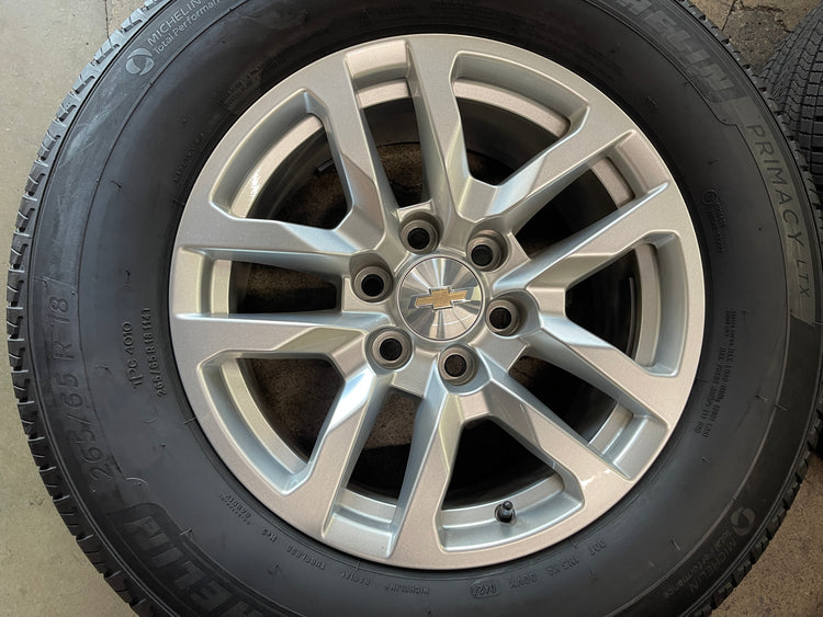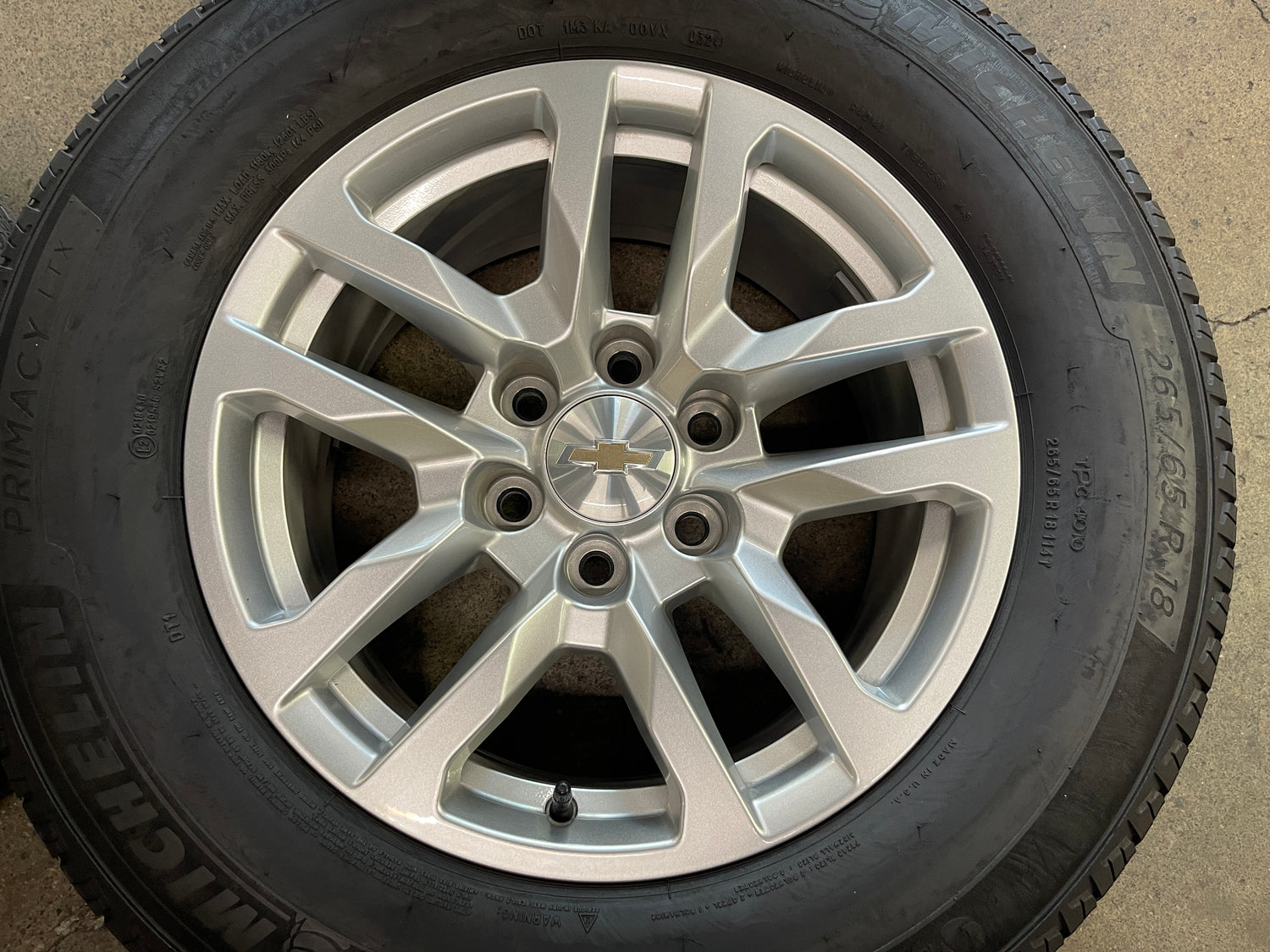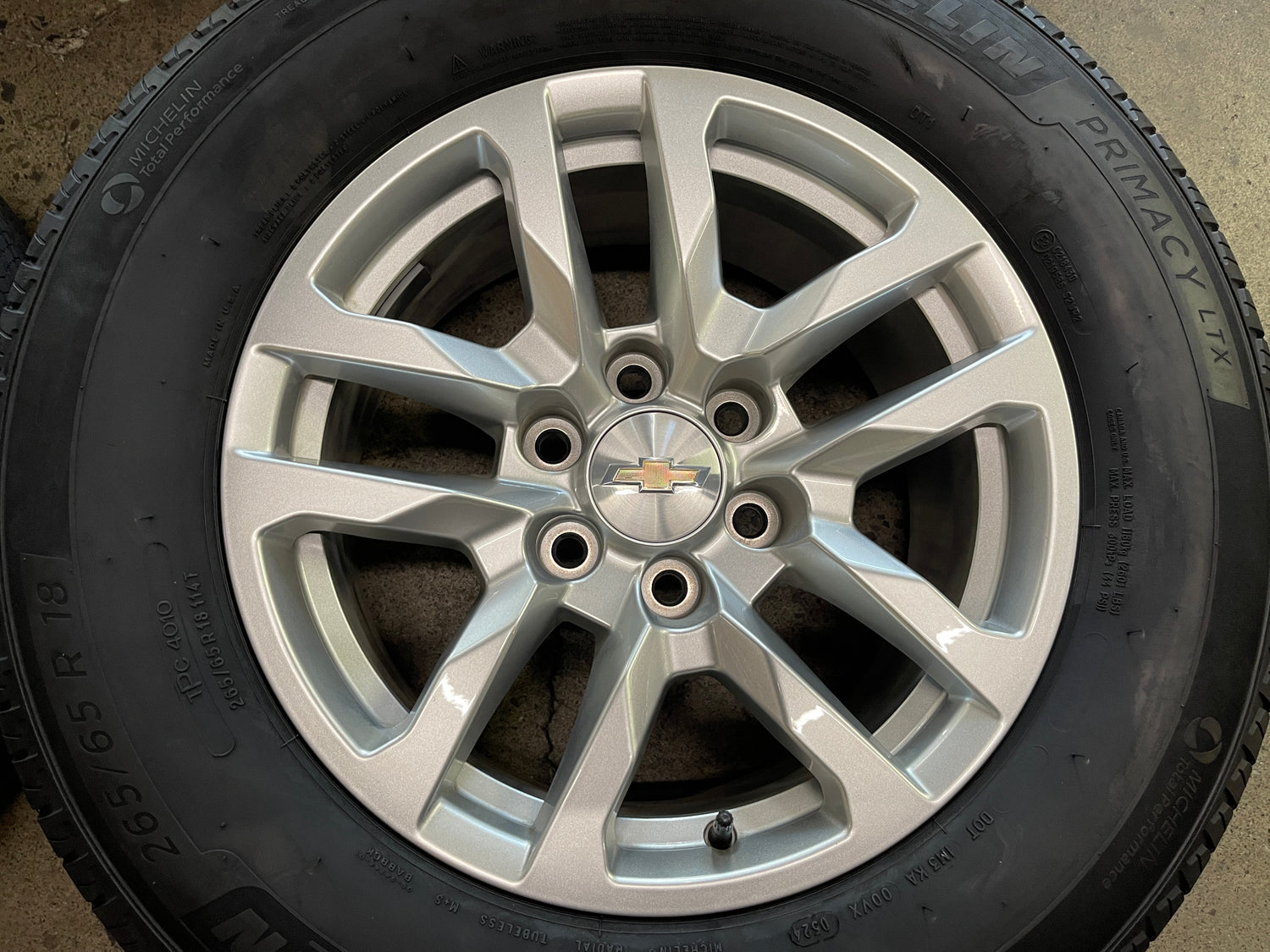 This is a gently used set of factory 2019 2020 2021 2022 2023 2024 Chevy Silverado / Tahoe / 1500 18 inch wheels and tires. The Michelin Primacy LTX DT1 265/65TR18 tires have 98% & 95% tread remaining (9.5/32nd & 9/32nd out of 9.5/32nd new) DOT 0424 . Caps included. No sensors.