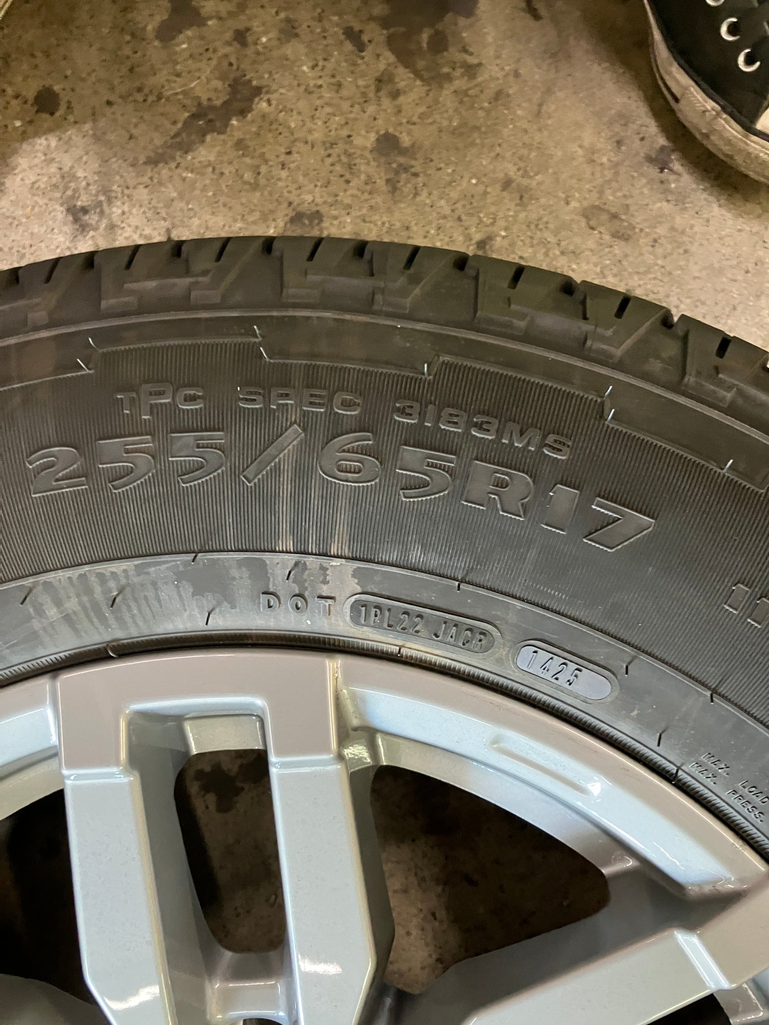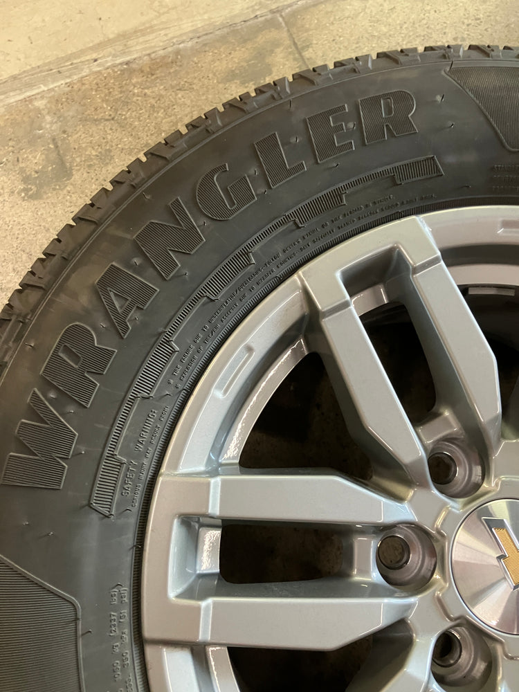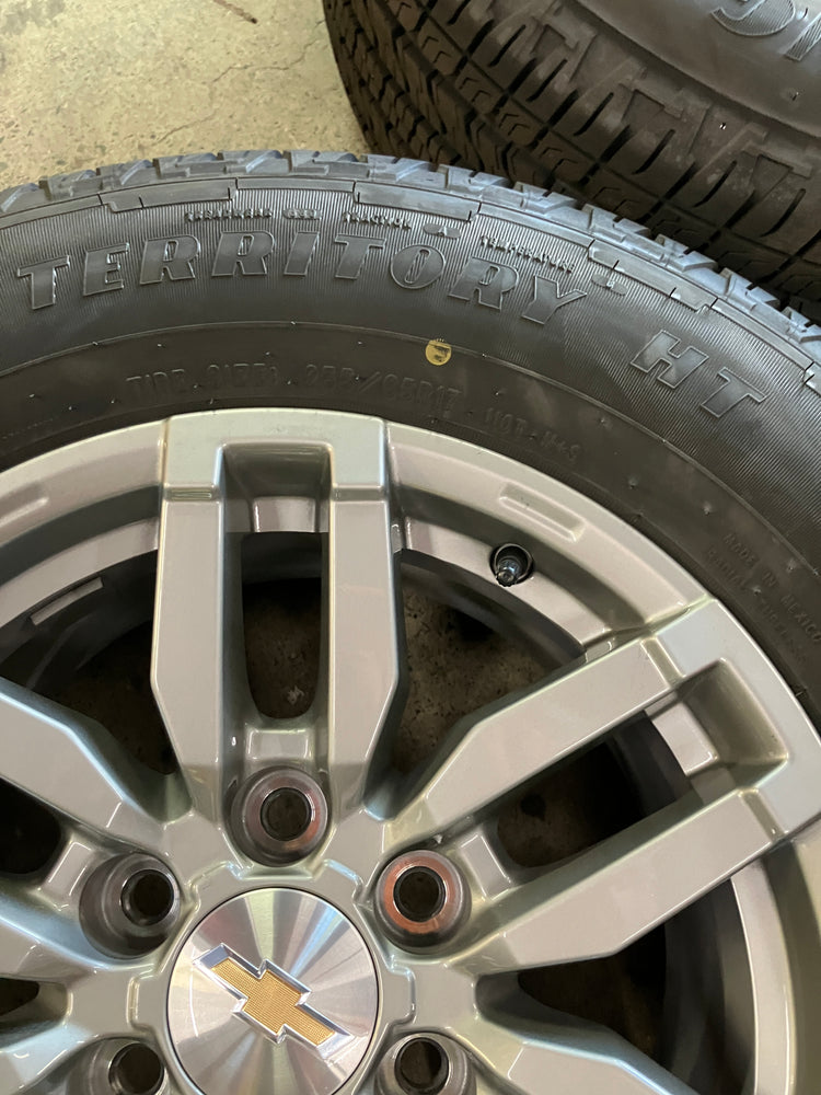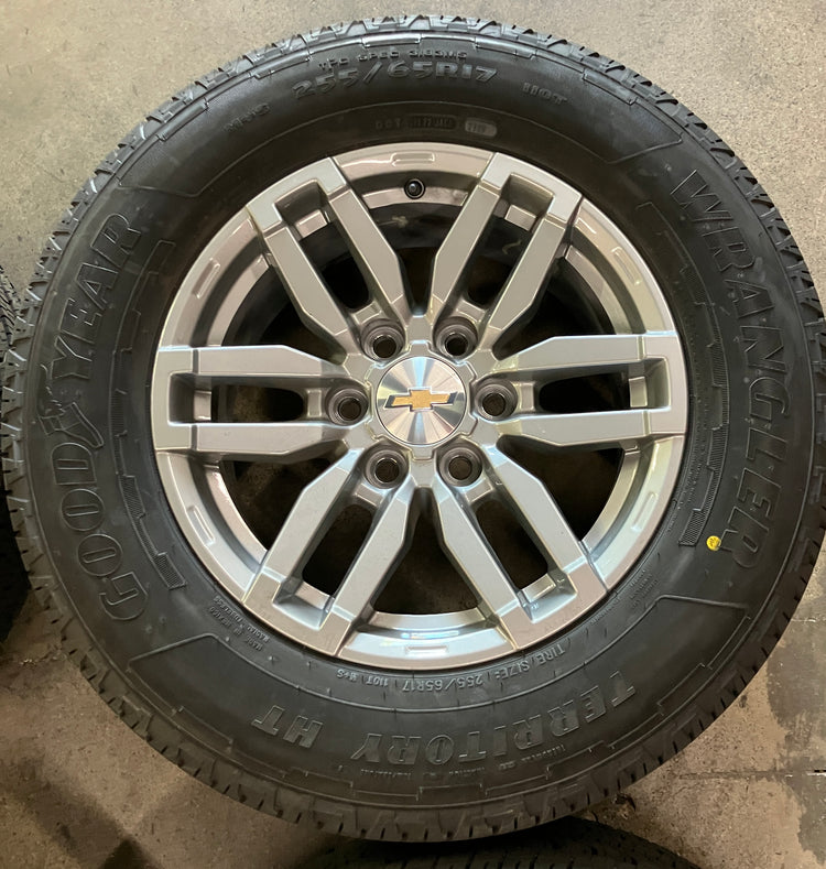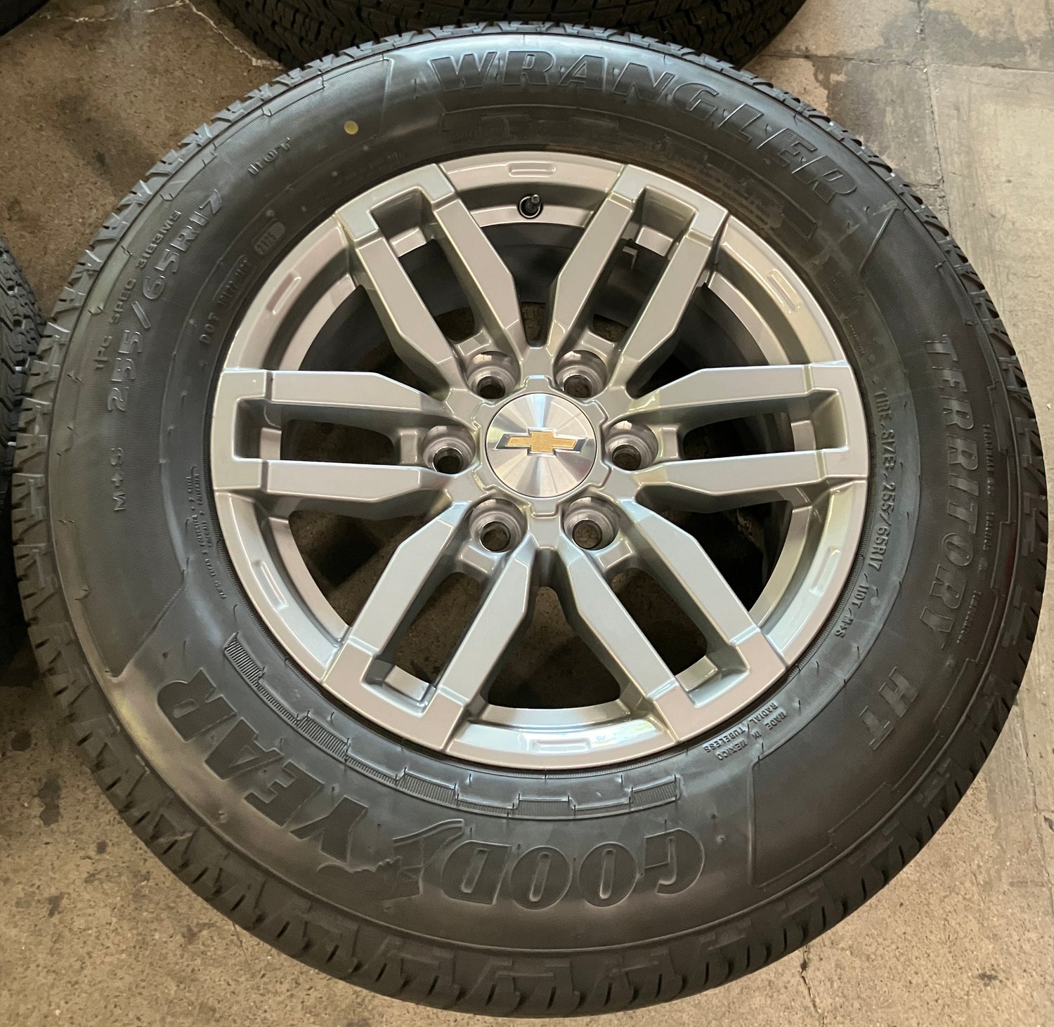 This is a Take Off set 2025 Chevy Colorado factory OEM 17 inch wheels and tires. These wheels and tires are in takeoff condition. The 255/65R17 Goodyear Territory HT have 99% tread left with a 1425 DOT. Fits 2023-2025 Colorado (only ! previous Colorado models are a different bolt pattern). Also fits Chevy and GMC 1500 trucks and SUV although the tire is shorter. Note: All used wheels may have light blemishes not visible in pictures when looking up close.