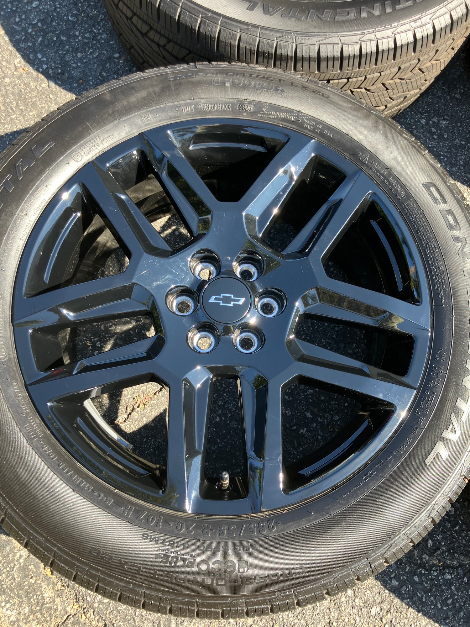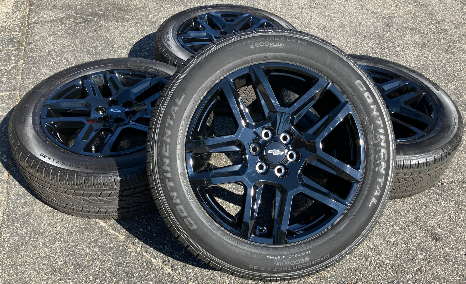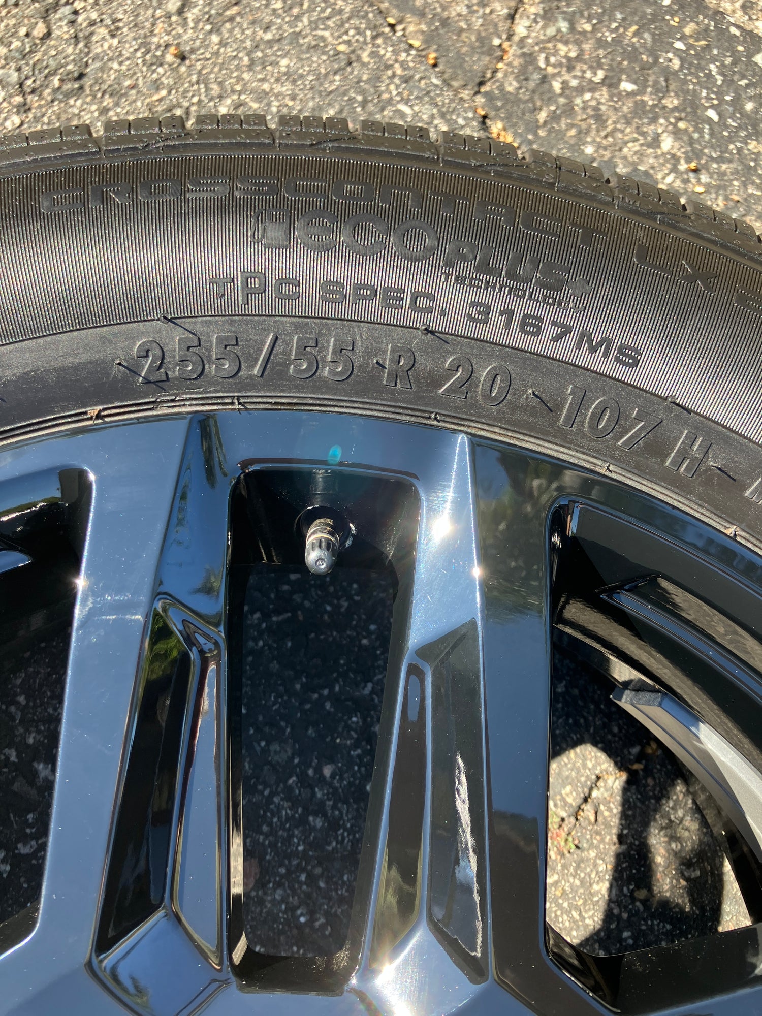 This is a takeoff set of 2024 Chevy Traverse / Blazer 20 inch wheels and tires. Original gloss black finish. The 255/55HR20 Continental Cross Contact LX 20 have 99% tread left with a 2023 DOT. Caps included, Sensors included. (Note: Sensors should fit 2018 to 2024 years, do NOT match 2025 models, However, sensors are free, we make no guarantees that they are compatible with your model year, no cash value, not responsible for sensor reset fees) Fits 2018 to 2025 Traverse, Blazer. Note: All used wheels may have light blemishes not visible in pictures when looking up close.