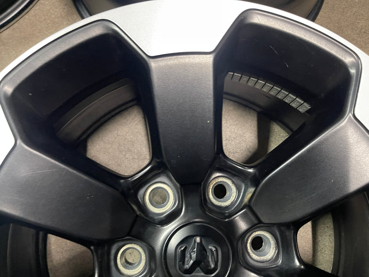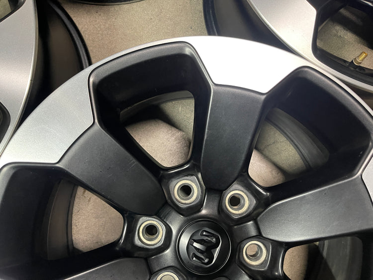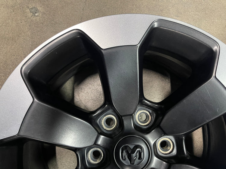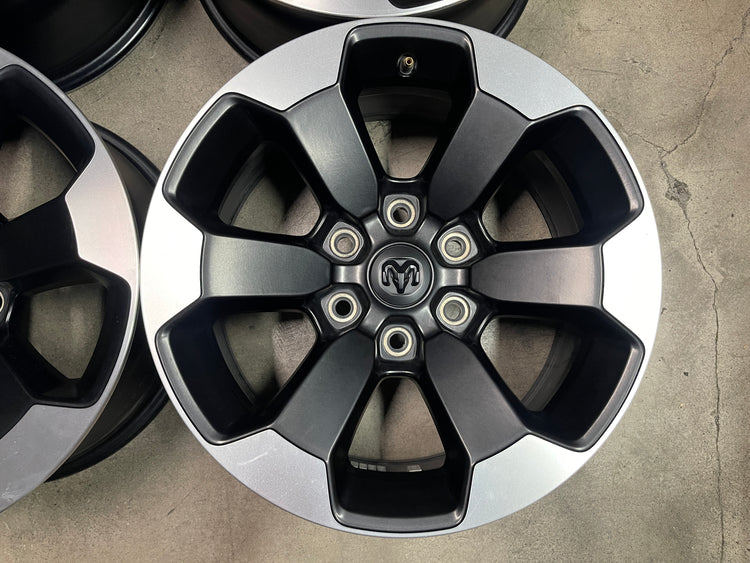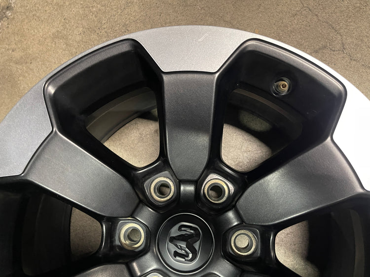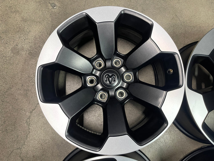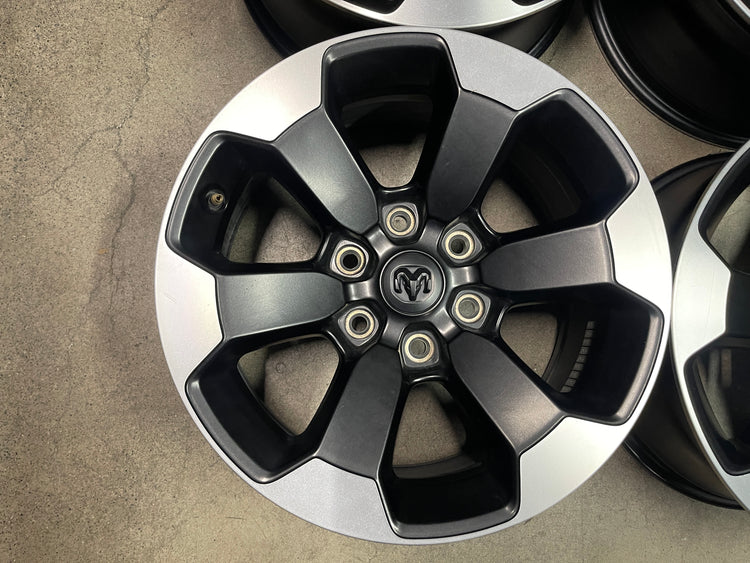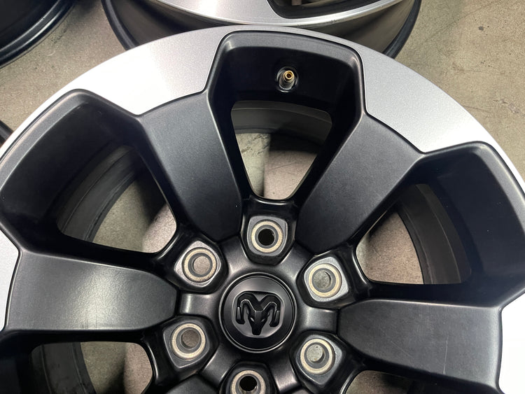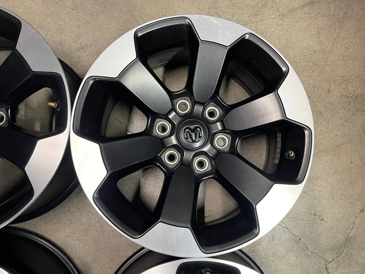 This is a clean, gently used, set of factory 2019 2020 Dodge Ram REBEL 1500 18 inch wheels. Caps included. No sensors. Note: Does NOT fit prior years due to bolt pattern change to 6 lug. Does NOT fit classic model (5 lug)