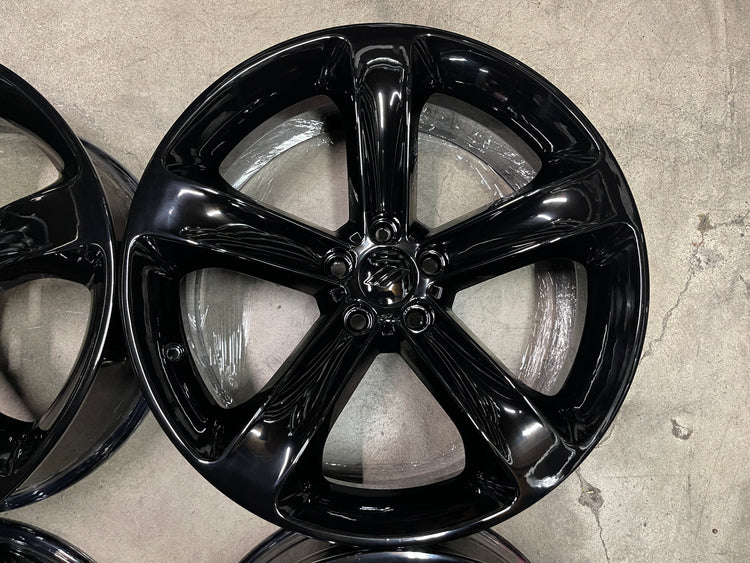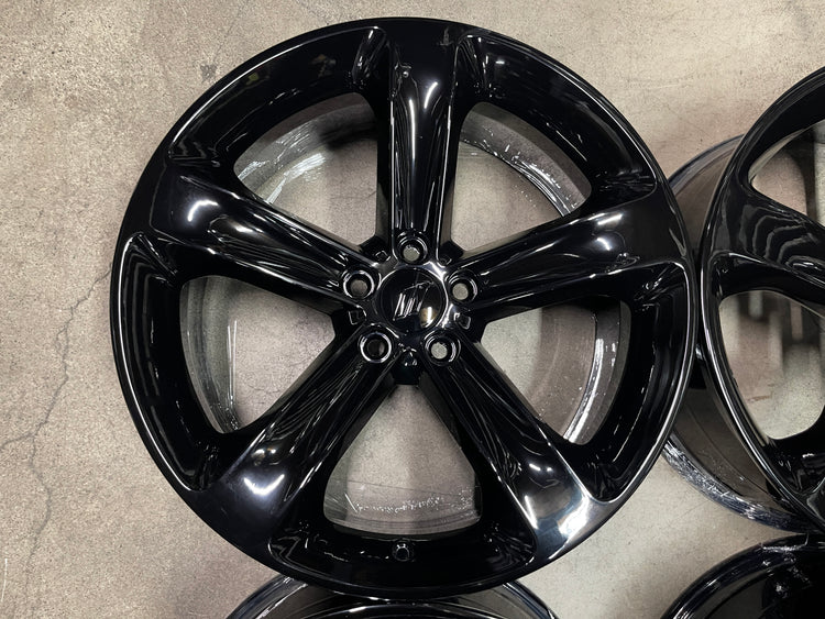 This is a set of 2015 2016 2017 2018 2019 Dodge Charger / Challenger Factory 20 inch Wheels Refinished with a gloss black powder coat finish. Painted caps included, No sensors. (OEM Rims 2529 5PE92TRMAB)