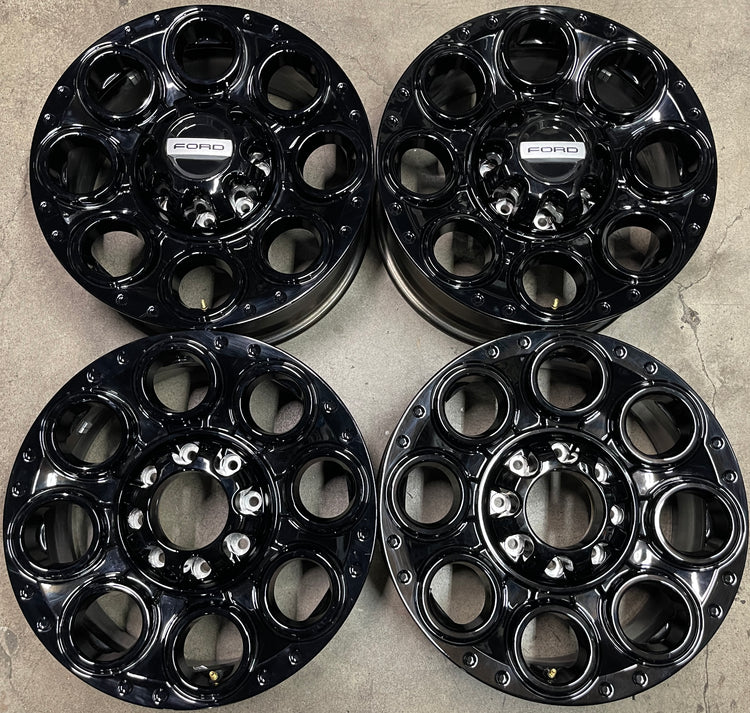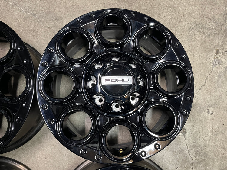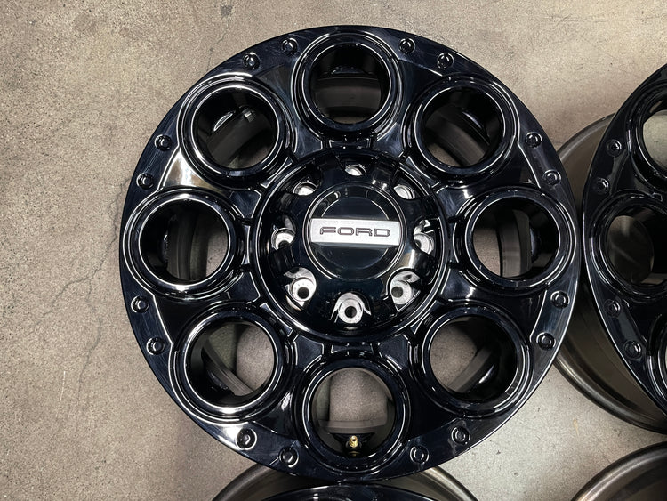 This is a clean Take Off set of factory 2023 2024 2025 F250 / F350 20 inch wheels. Tall rear caps included (2 open , 2 closed). No sensors, no lug nuts. NOTE: This set will fit the "12 bolt differential" rear axle due to the Tall rear caps.