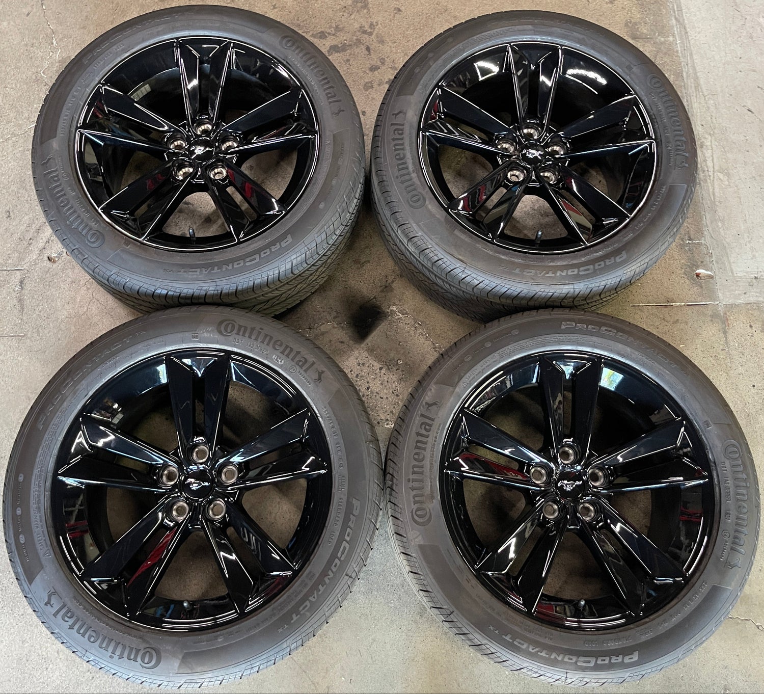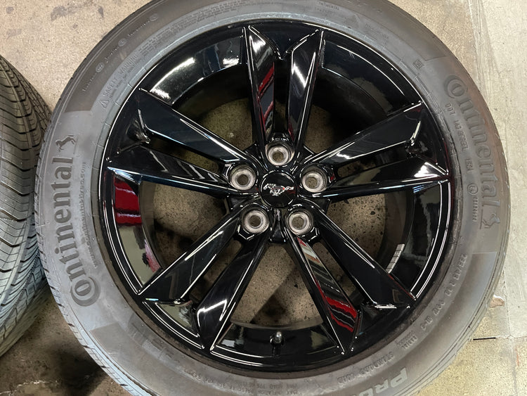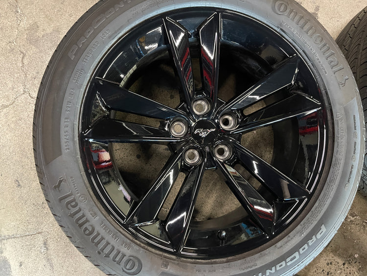 This is a Take-off set of 2024 2025 Ford Mustang GT factory 18 inch wheels and tires. Factory gloss black finish. One wheel has been touched up on the edge/lip, light scuffs, as shown in pictures. The Continental Procontact TX P255/45WR18 tires have 99% tread remaining with a 0625 DOT. Caps included. NO sensors. Fits your 2006 2007 2008 2009 2010 2011 2012 2013 2014 2015 2016 2017 2018 2019 2020 2021 2022 2023 2024 2025 Mustang. Note: (All used wheels may have light blemishes not visible on pictures when looking up close).