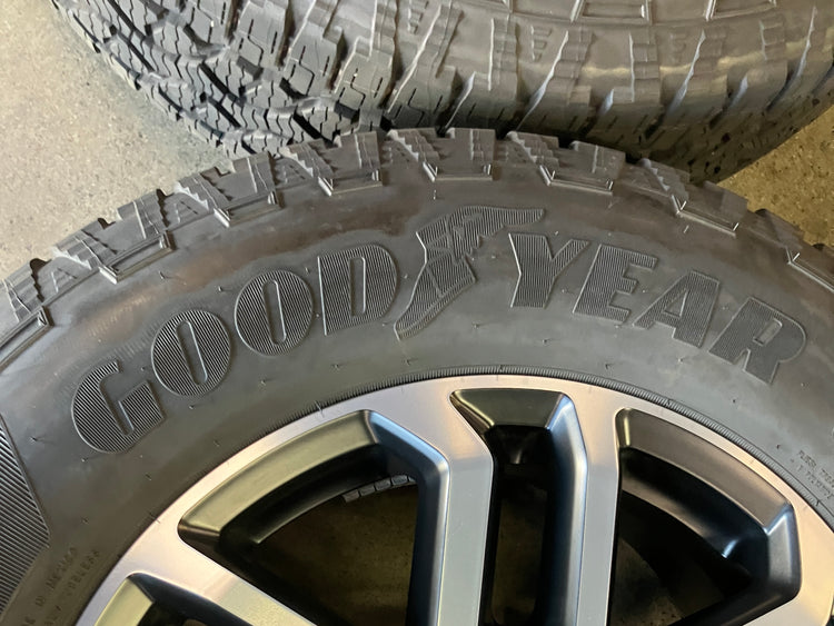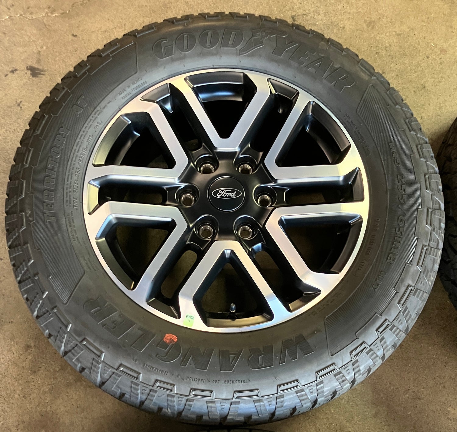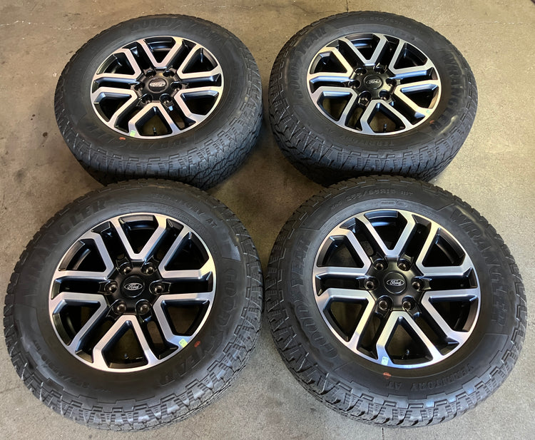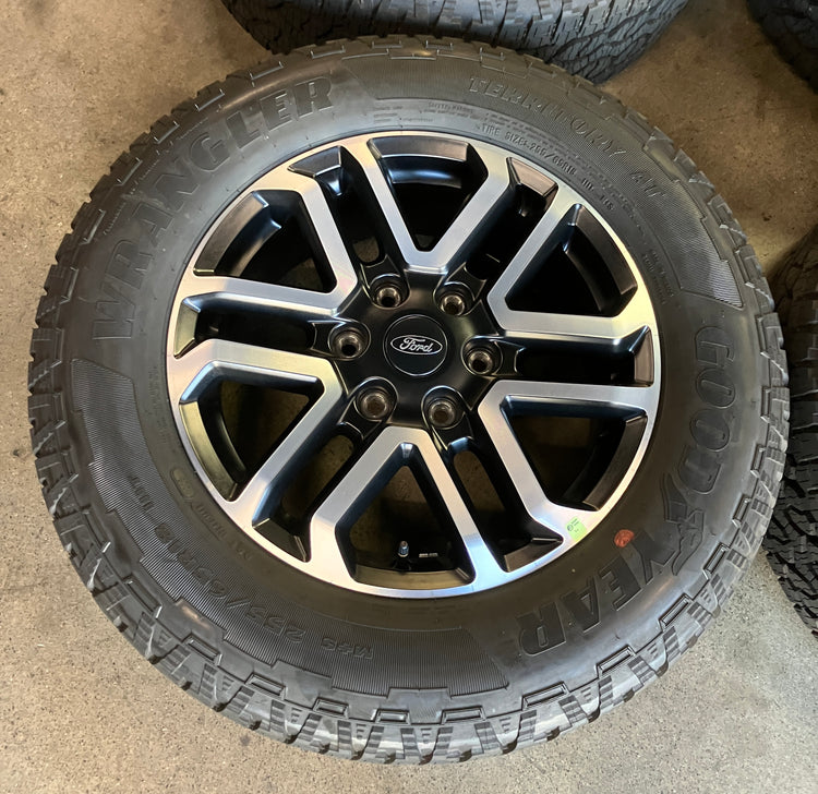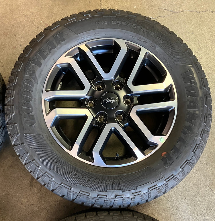 This is a clean Take Off set of of factory 2025 Ford Ranger 18 inch wheels and tires. OEM / factory Black/Machined finish. The Goodyear Wrangler Territory AT 255/65TR18 tires have 99% tread remaining with a 1325 DOT. Caps included, no sensors. (Note: Only fits 2019 to 2025 Ford Ranger 6x5.5 bolt pattern. Does NOT fit prior years) (Note: All used wheels may have blemishes not visible in pictures when looking up close)