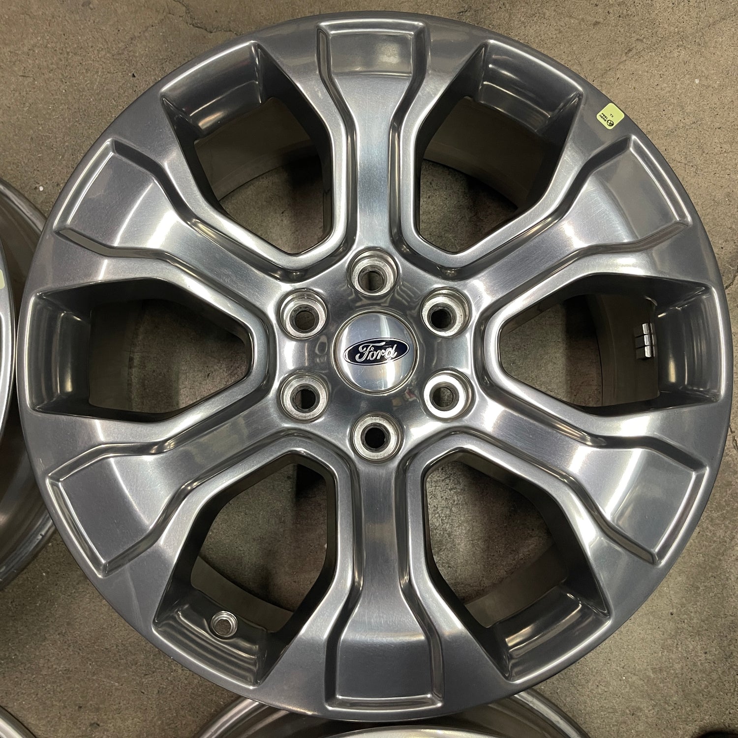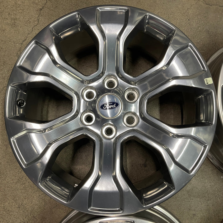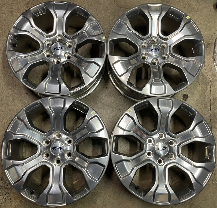 This is a gently used set of factory 2021 2022 2023 Ford F150 Platinum 20 inch wheels. OEM polished finish with clear coat. Wheels have a few light scuffs, see pictures. Caps included. No sensors. Fits your 2005 2006 2007 2008 2009 2010 2011 2012 2013 2014 2015 2016 2017 2018 2019 2020 F150. FX2 and FX4. (Note: All used wheels may have blemishes not visible in pictures when looing up close)