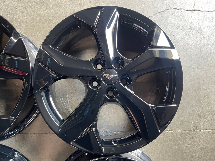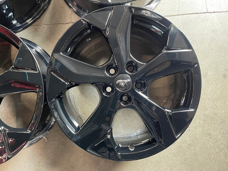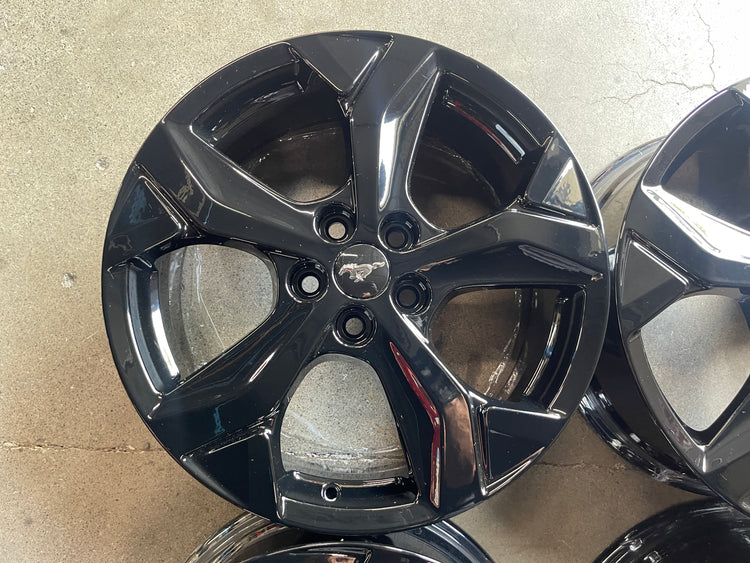 This is a set of 2021 2022 2023 Ford Mustang Mach-E factory 18 inch wheels. Refinished with a gloss black powder coat finish. Note: 5x108 bolt pattern does NOT fit regular Mustangs..... Caps included. No sensors.