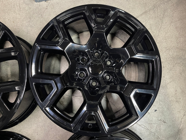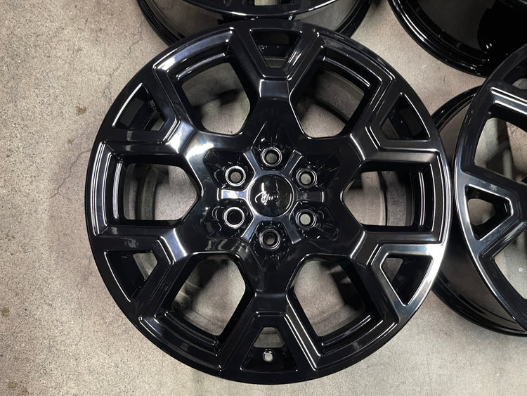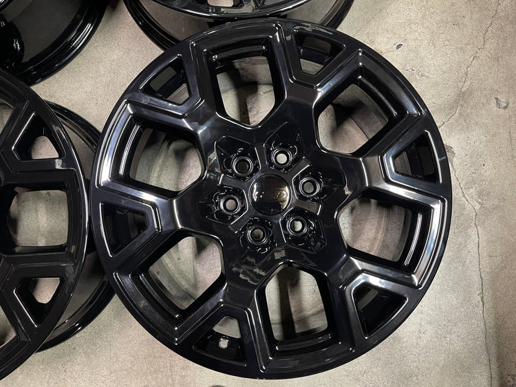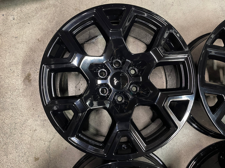 This is a set of factory 2025 Ford F150 20 inch wheels. Refinished with gloss black powder coating. Caps included. No sensors.