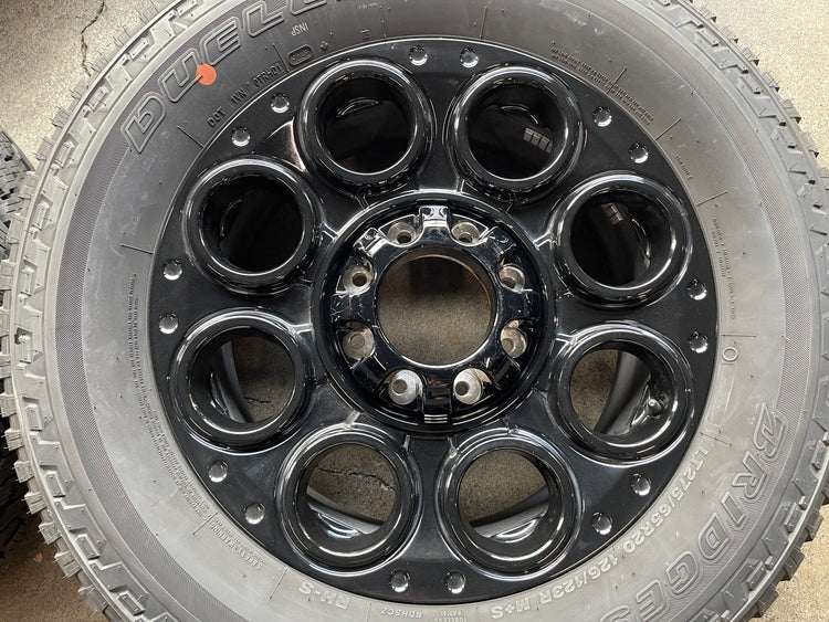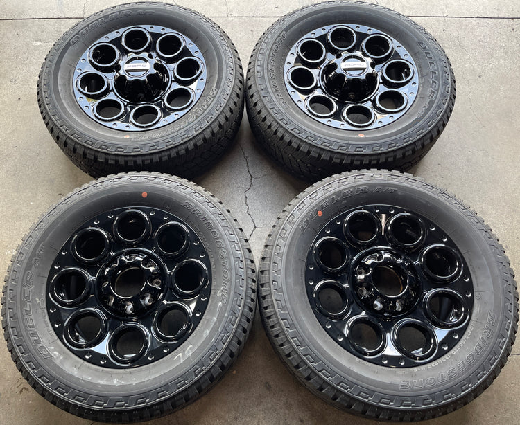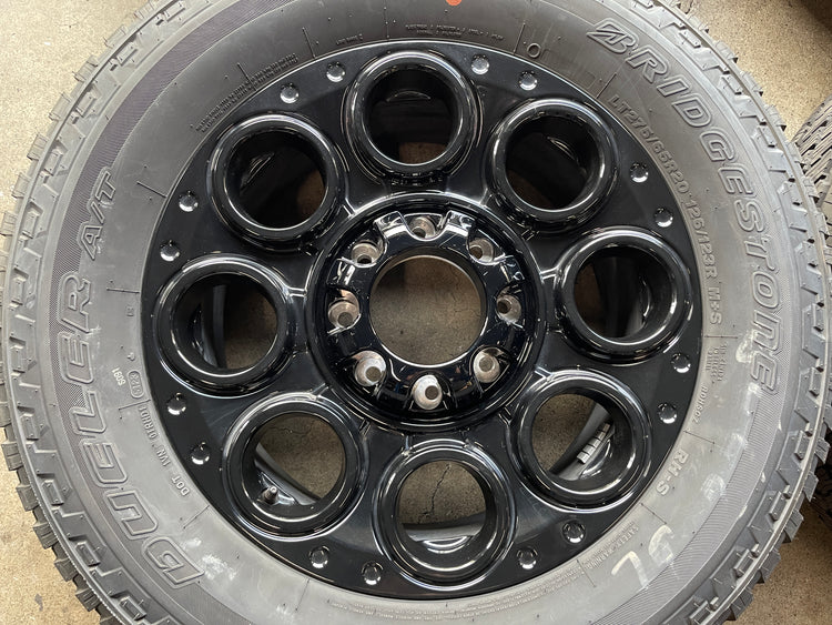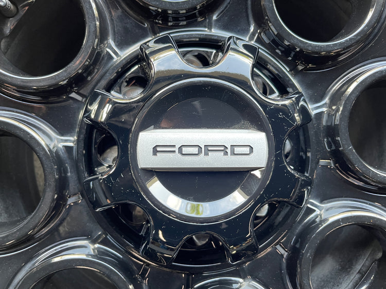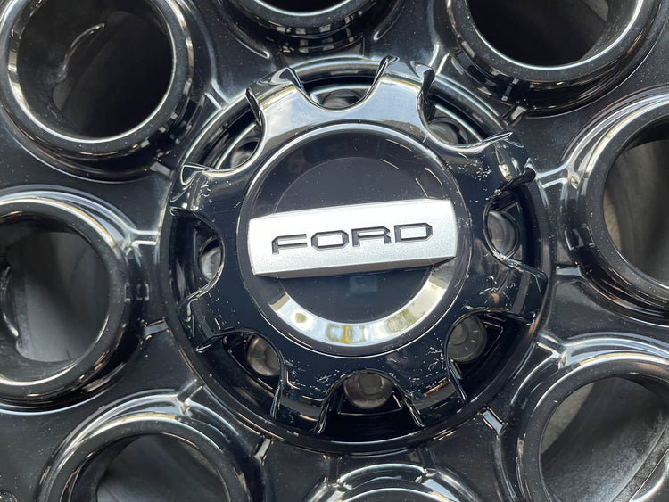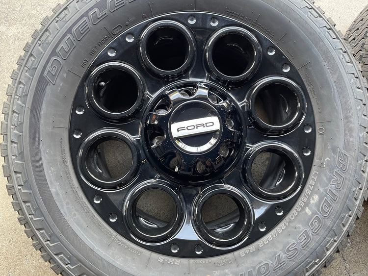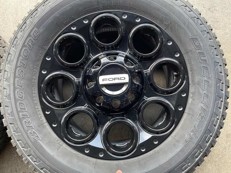 This is a clean take-off set of factory 2024 2025 F250 / F350 Tremor 20 inch wheels and tires. The Bridgestone Dueler A/T RH-S LT275/65RR20 10 ply tires have 99% tread remaining with a DOT of 5023 . Wheels and caps have a few scuffs, as shown in pictures. Tall rear caps included (2 open , 2 closed). No sensors. (Note: Lug nuts NOT included with this set). NOTE: This set WILL fit the 12 bolt rear axle due to the Tall rear caps.