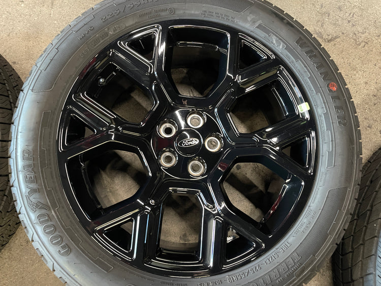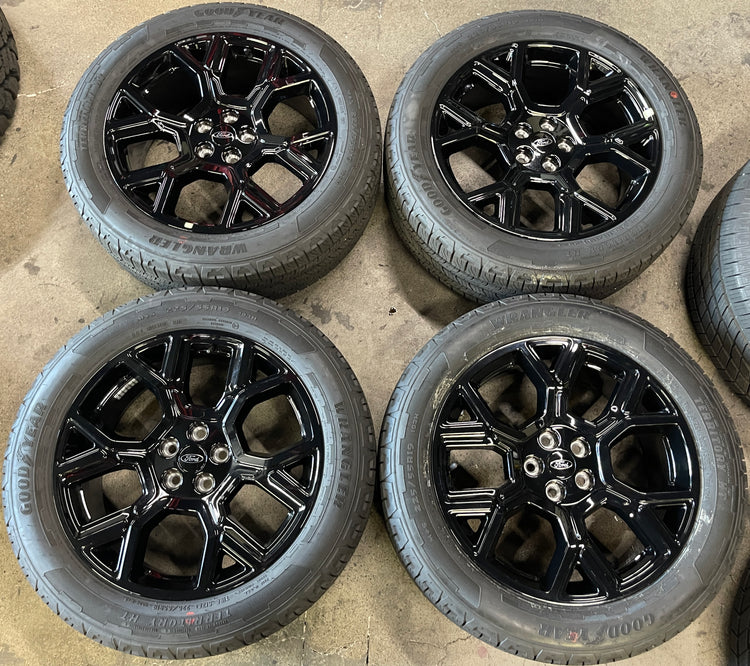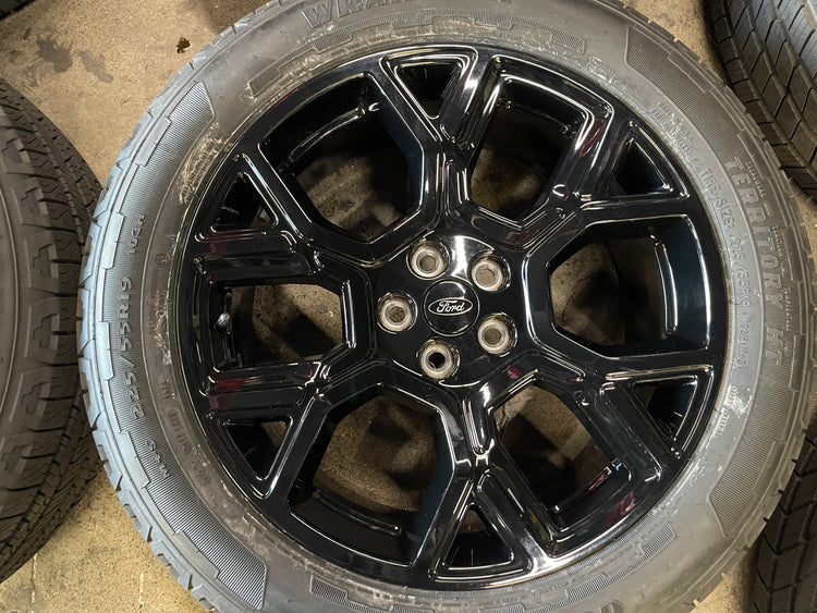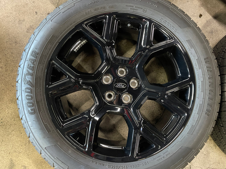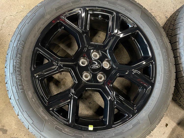 This is a clean Take Off set of 2025 Ford Maverick 19 inch factory wheels and tires. OEM gloss black powder coat finish. Also fits your Bronco Sport. The Goodyear Wrangler Territory HT 225/55HR19 have 99% tread remaining. Caps included, No sensors. Bolt Pattern: 5x108