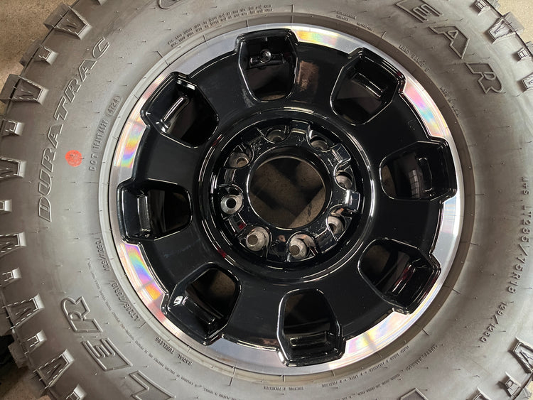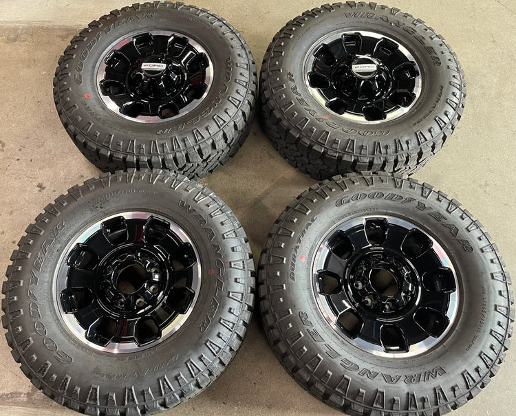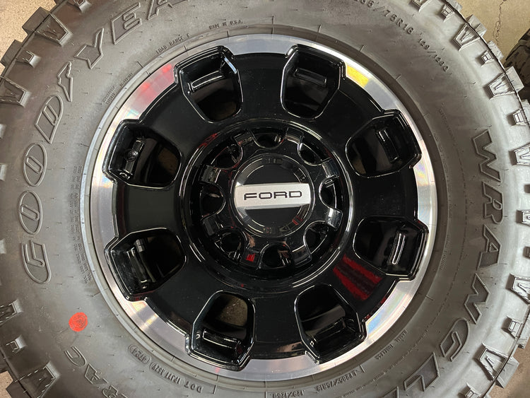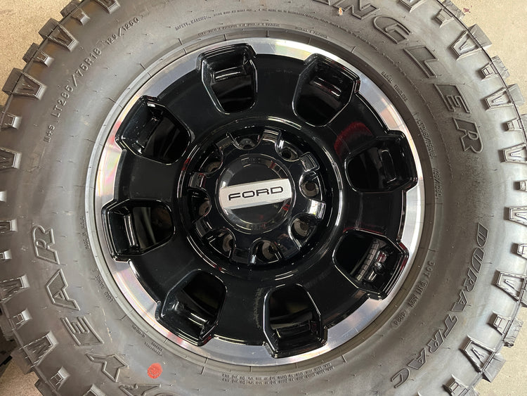 This is a clean Take-off set of 2024 2025 Ford F250 F350 Tremor lariat Factory 18 wheels and tires. One wheel has a couple scuffs, caps also have scuffs, as shown in pictures. The Goodyear Duratrac LT285/75QR18 tires have 99% tread remaining (18/32nd new) Note: taller tires on 2021 and newer models, will require a leveling or lift kit on some earlier models. Inquire with us for a fitment guarantee. OEM black caps included (2 open and 2 closed for 4x4). NO sensors. (Lug nuts NOT included with this set) Tall rear caps fit the 12 bolt rear axle.
