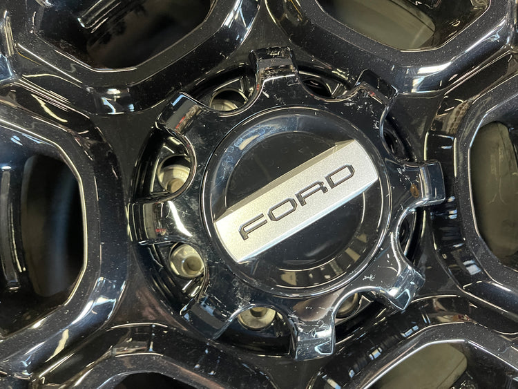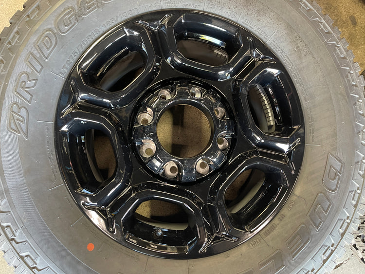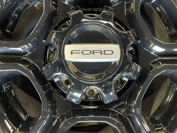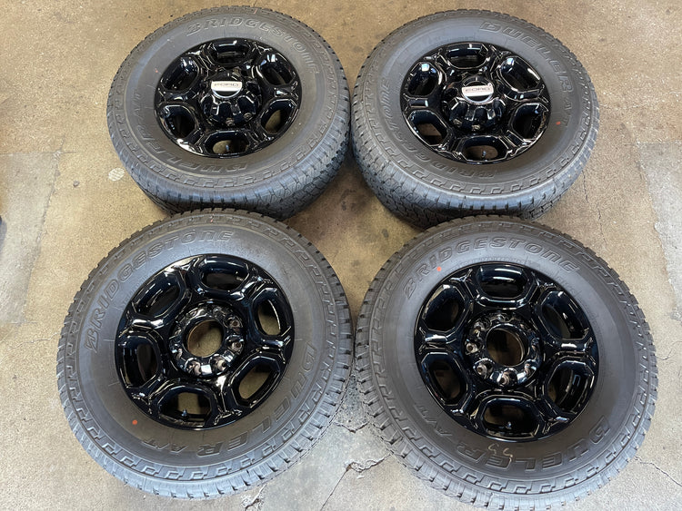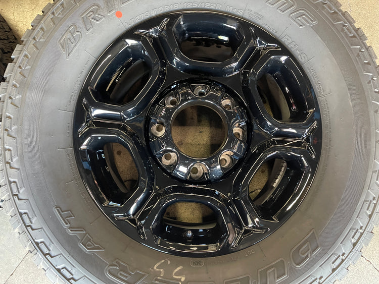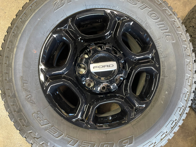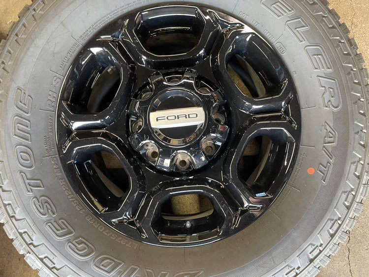 This is a Take-off set of factory 2024 2025 Ford F250 / F350 SRW 18 inch wheels and tires. OEM factory Gloss black finish.Center Caps have scuffs, as shown in pictures. The Bridgestone Dueler A/T RH-S LT275/70RR18 10ply tires have 99% tread remaining. Tall caps included (2 open , 2 closed). No sensors. NOTE: Lug nuts NOT included with this set. NOTE: Fits 2006 to 2024 F250, unknown whether the rear caps will clear axle on 12 bolt differential.