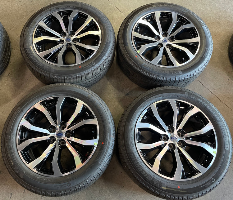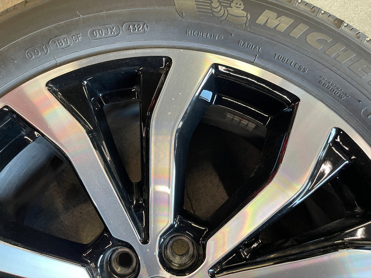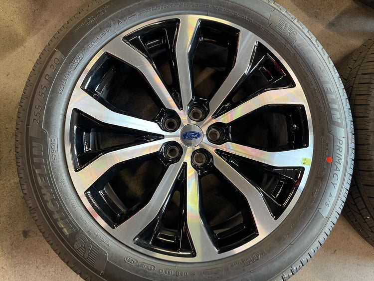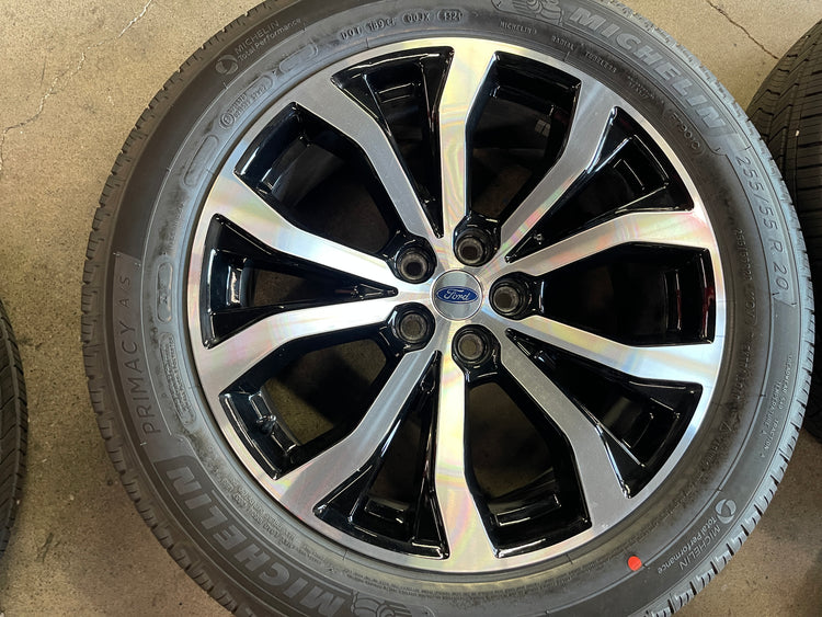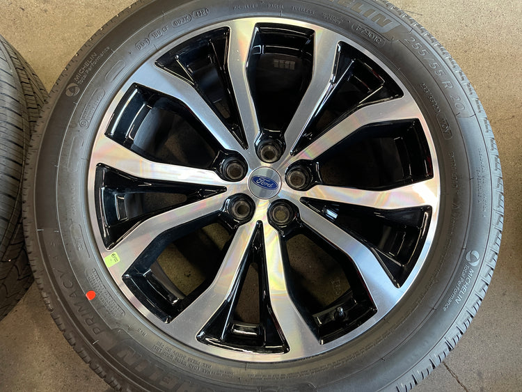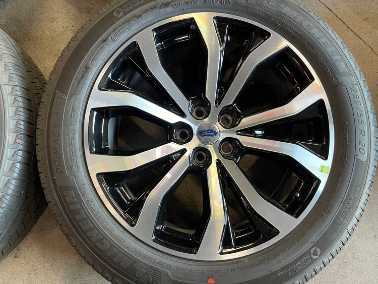 This is a take-off set of factory 2020 2021 2022 2023 2024 Ford Explorer 20 inch wheels and tires. Ove wheel has a couple scuffs, as shown in pictures. The Michelin Primacy A/S 255/55/R20 tires have 99% tread remaining ( DOT 4324). Caps included. No sensors.