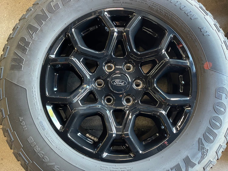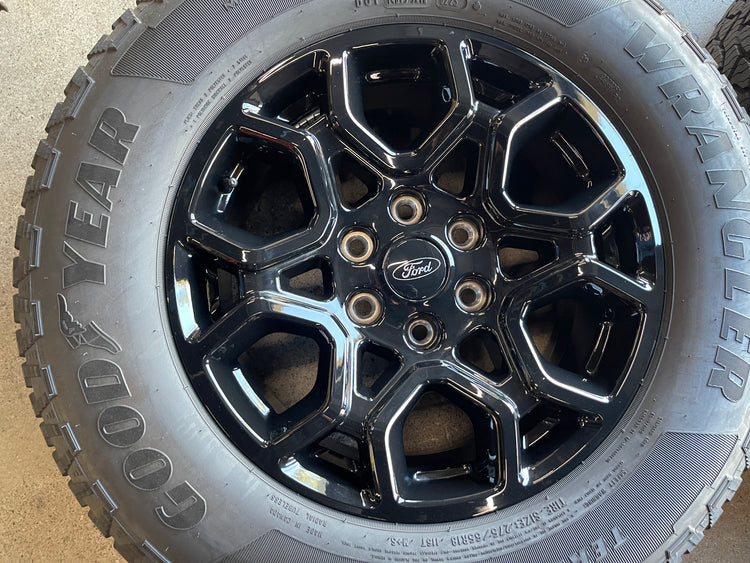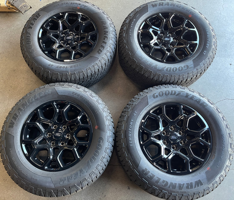 This is a clean Take Off set of factory 2025 Ford F150 18 inch wheels and tires. Factory gloss black finish. The Goodyear Territory A/T 275/65TR18 have approx 99% tread remaining.(DOT 0225 ) Caps included, No sensors.