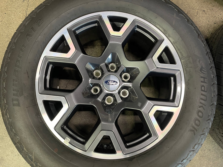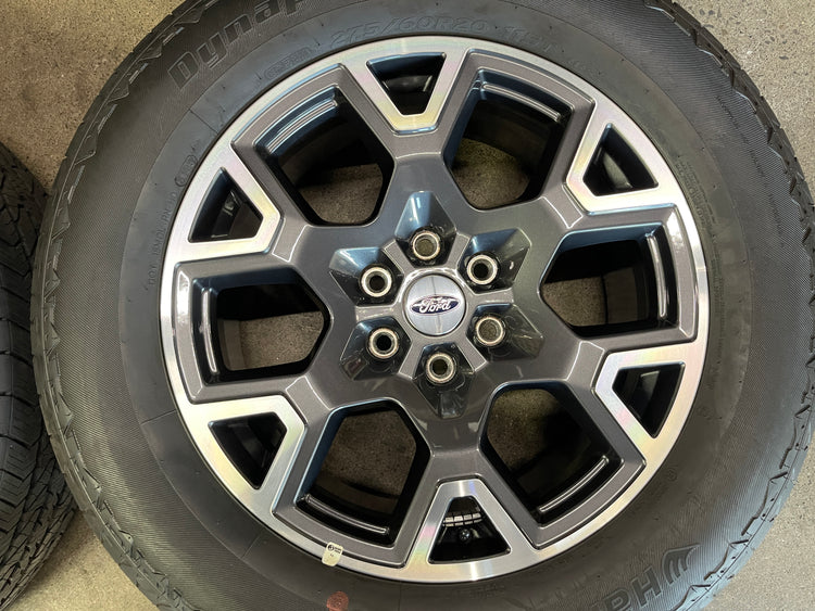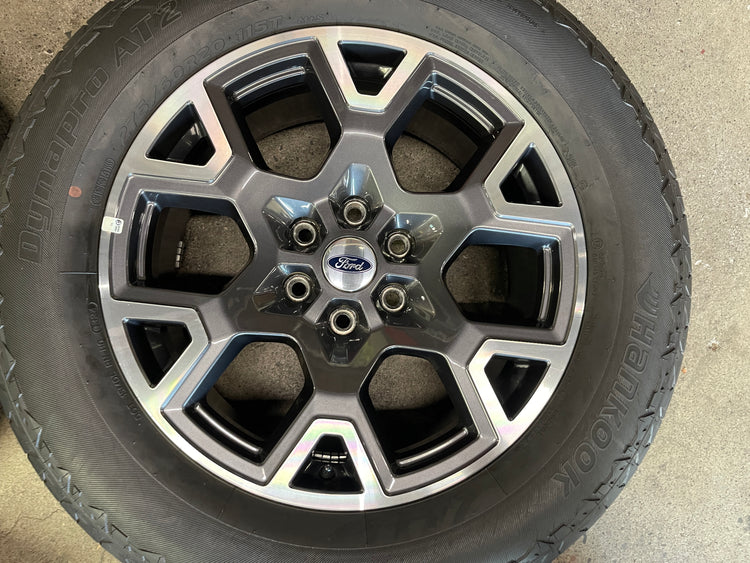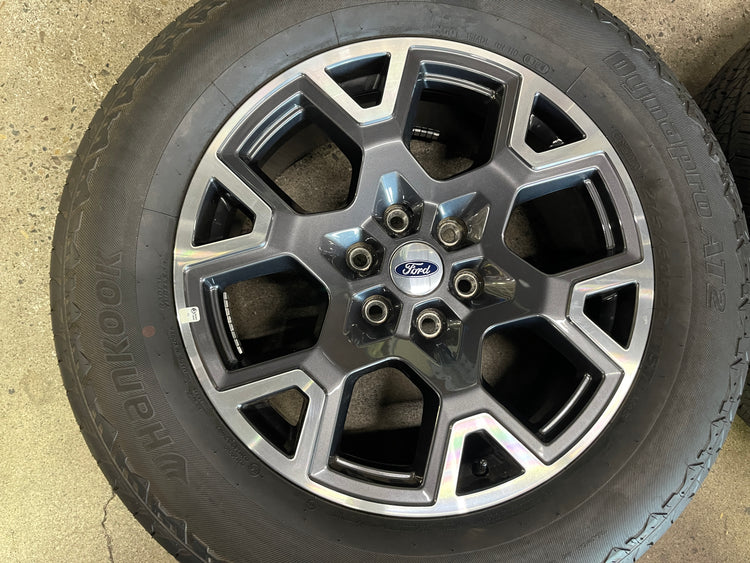 This is a clean Take off set of factory 2024 2025 Ford F150 20 inch wheels and tires. The Hankook Dynapro AT2 275/60TR20 tires have 99% tread remaining with a  DOT 5123. Caps included. No sensors. Fits your 2005 to 2025 F150. FX2 and FX4. Note: The 2021 to 2025 have taller tires than previous years, fits without a lift kit.