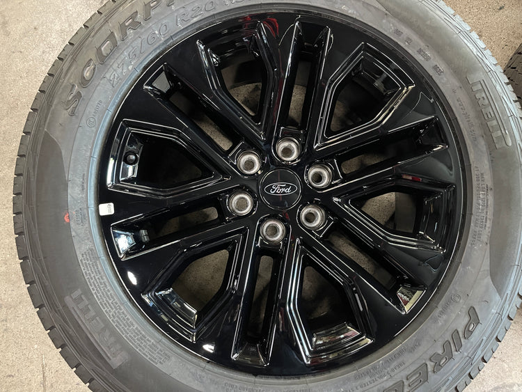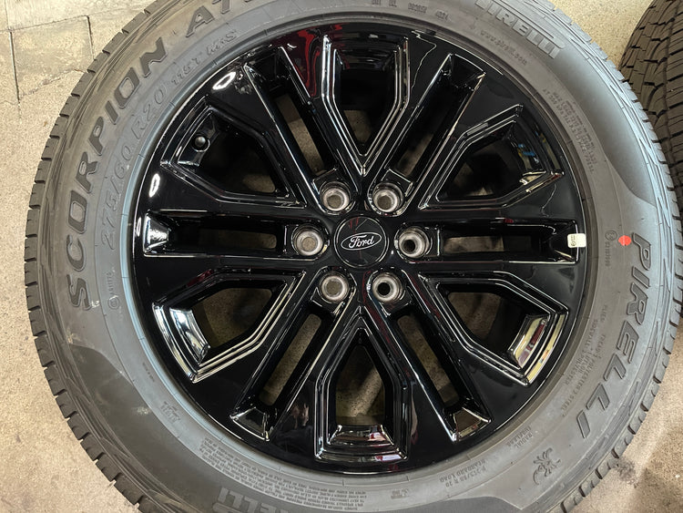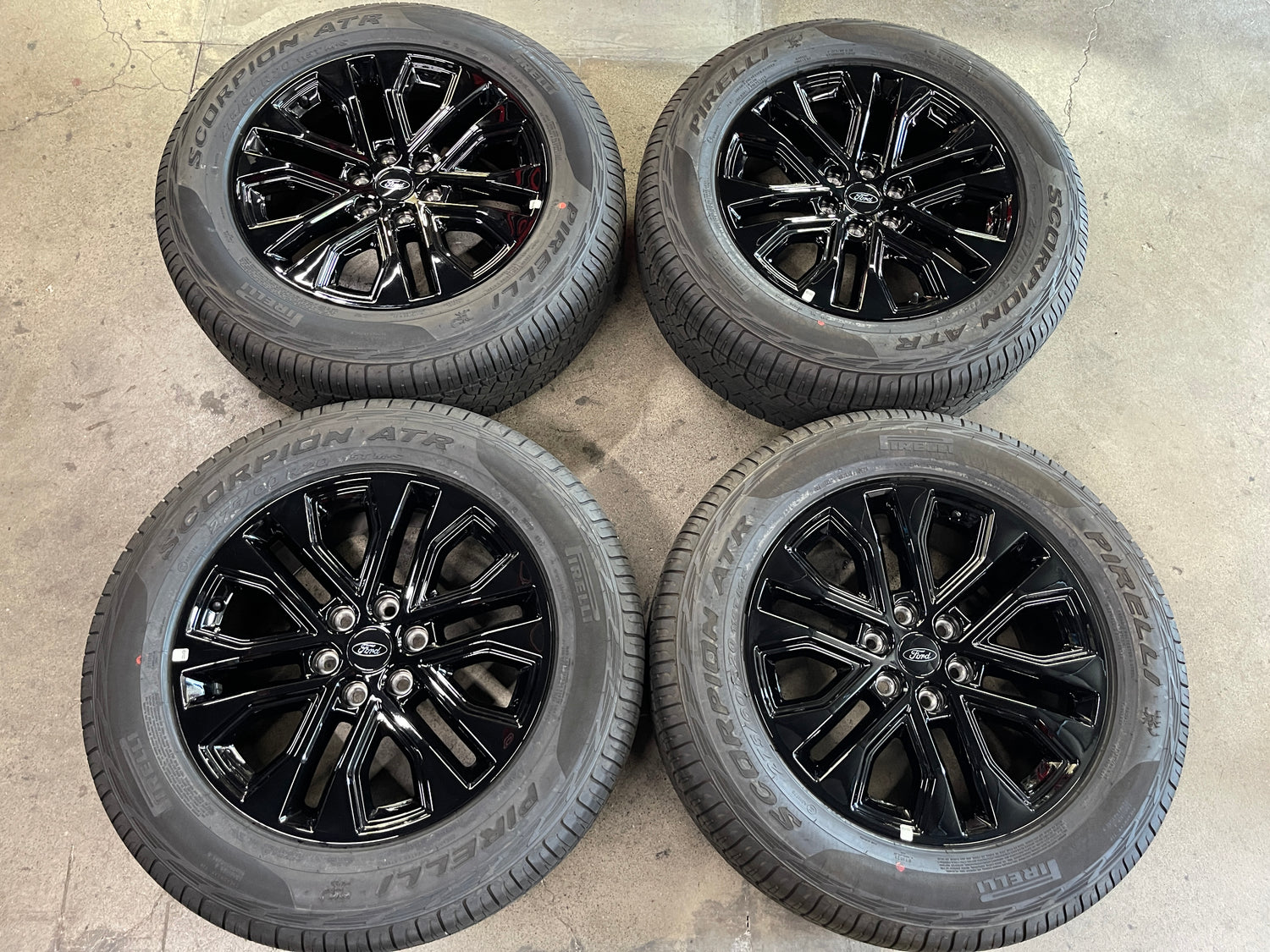 This is a Take off set of factory 2025 Ford F150 Lariat 20 inch wheels and tires, OEM Gloss Black finish. The Pirelli Scorpion ATR 275/60TR20 tires have 99% tread remaining with a 4224 DOT. Caps included. No sensors. Fits your 2005 to 2025 F150. FX2 and FX4.