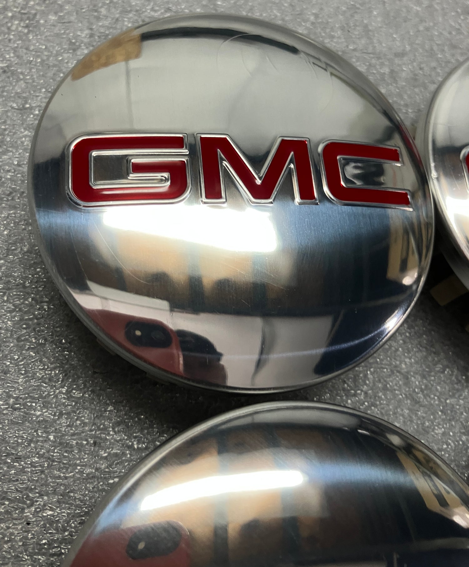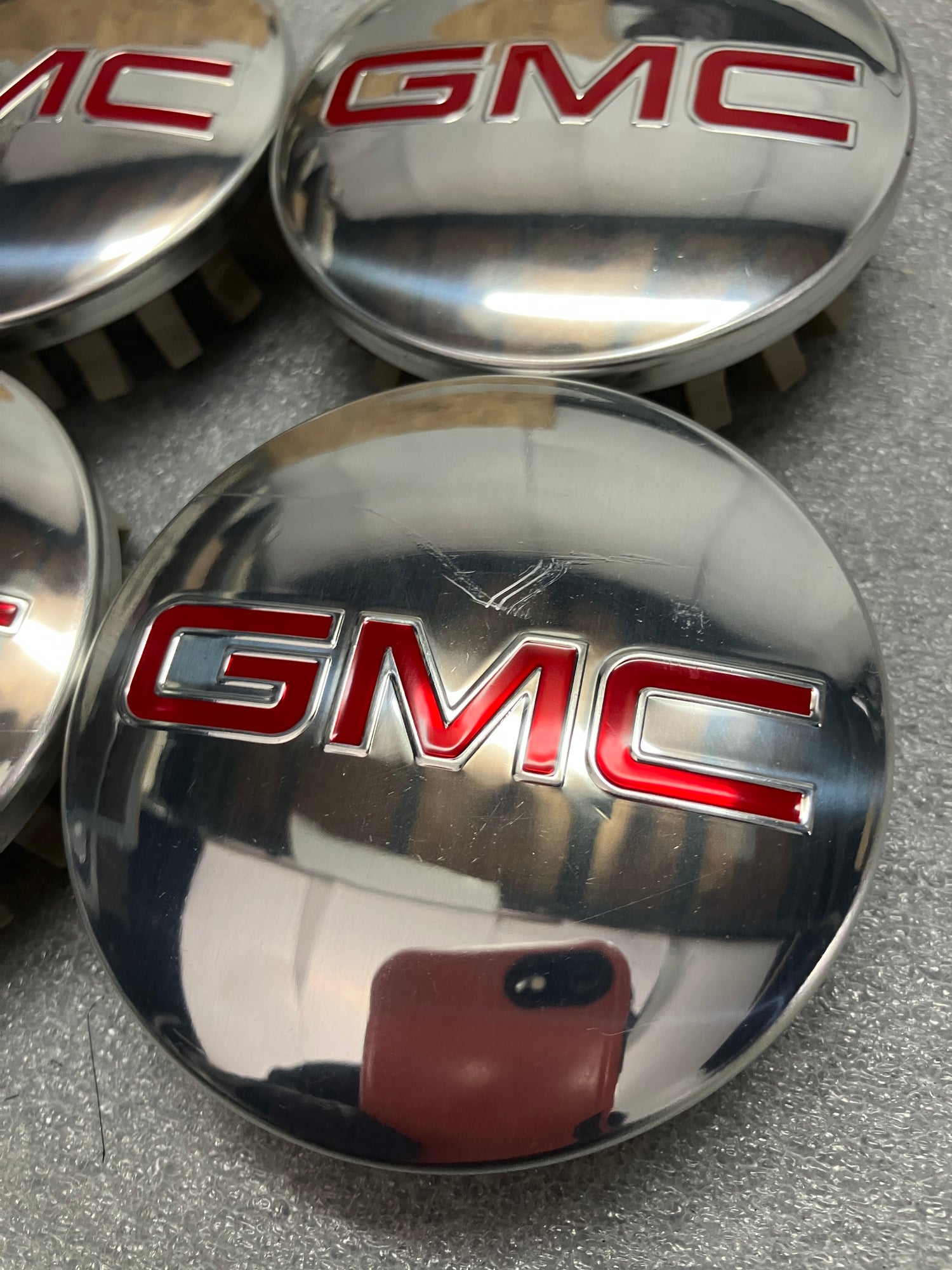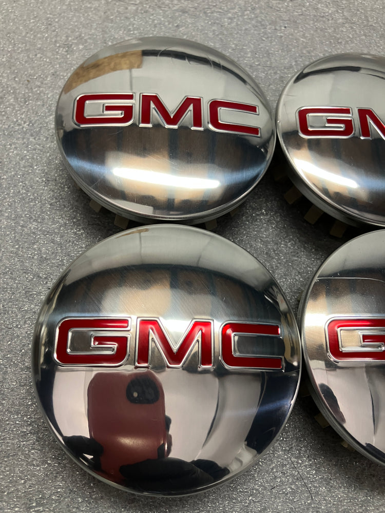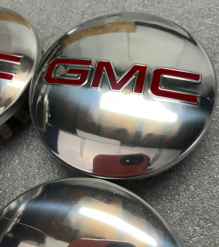 Authentic, Set of 4, OEM, GMC center caps in take off condition. One of the caps has some scratches so please look at the pictures. GMC part number 22837060. Fits most, but not all, GMC 1500 alloy wheels from 2015-2026. These caps are Polished finish with the red GMC logo.