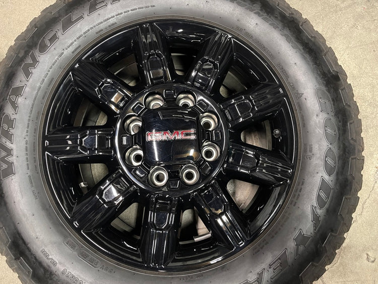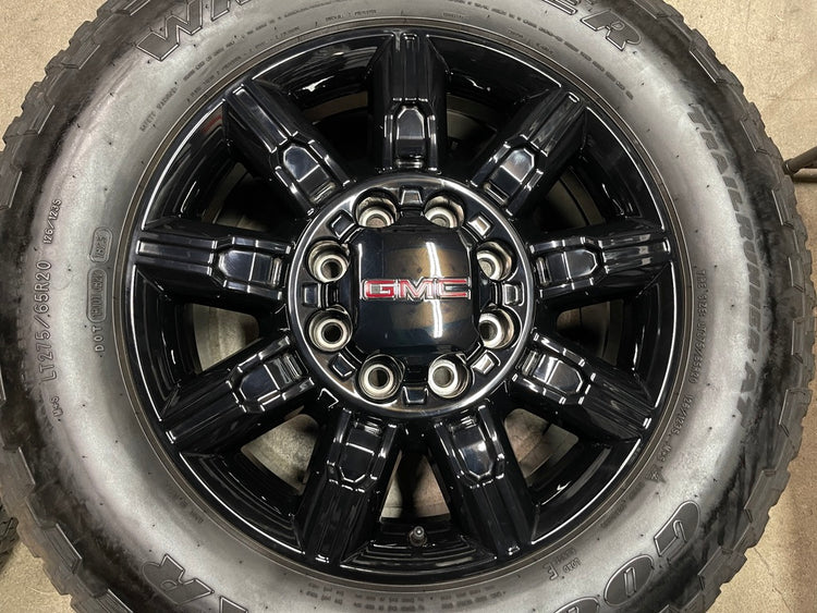 This is a gently used set of factory 2022 2023 2024 GMC Sierra Denali HD2500 / HD3500 20 inch wheels and tires. Light scuffs possible when viewed up close... The Goodyear Wrangler Trailrunner A/T LT275/65SR20 have 83% tread remaining (10/32nd out of 12/32nd new with a DOT 1823). Caps included. NO sensors. Fits 2011 to 2024 HD2500 (Chevy and GMC, but caps are GMC).