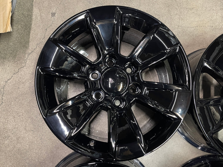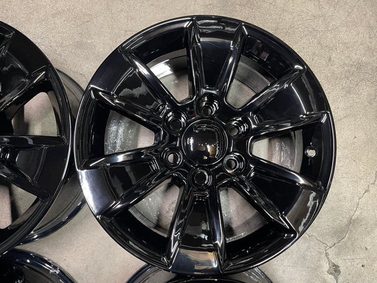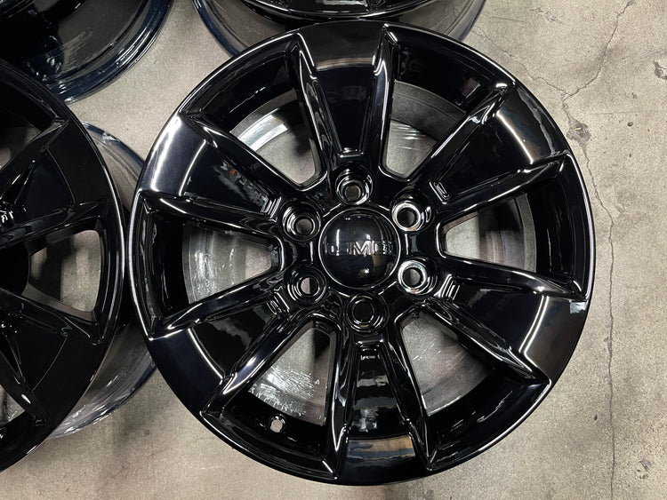 This is a set of factory 2019 2020 2021 2022 2023 2024 2025 GMC Sierra /Chevy Silverado / 1500 17 inch wheels refinished with a Gloss Black powder coat finish. Painted caps included. NO sensors. Note: Fits 1999 to 2022 models that came with 16" or 17" wheels only.... Exchange available only at our store, no shipping on exchanges.