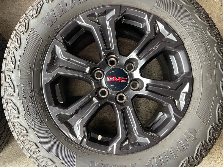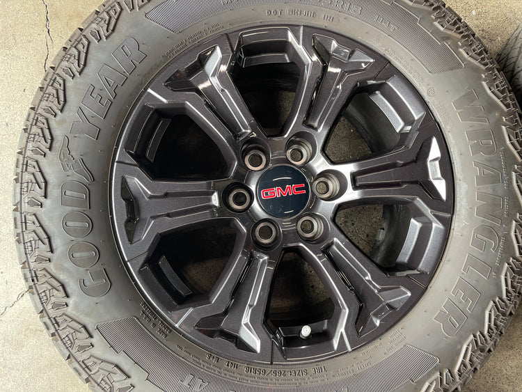 This is a gently used set of factory 2023 2024 GMC Canyon/ Yukon / Sierra 1500 18 inch wheels and tires. The Goodyear Territory AT 265/65TR18 have 91% & 82% tread remaining (10/32nd & 9/32nd out of 11/32nd new). Caps included. No sensors.( Note: Bolt pattern 6x139.7 / 6x5.5, will not fit any Canyon or Colorado before 2023 model). Fits all 1999 and newer Sierra , Yukon , 1500 6x5.5