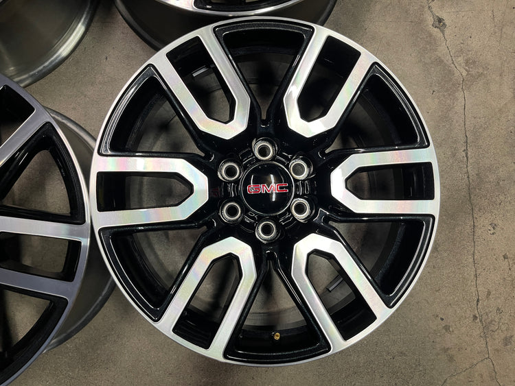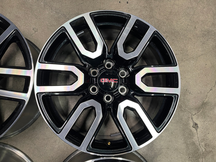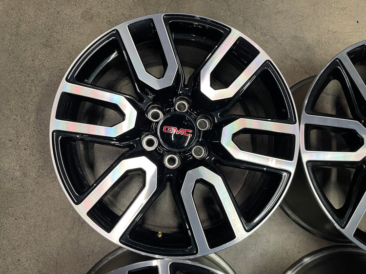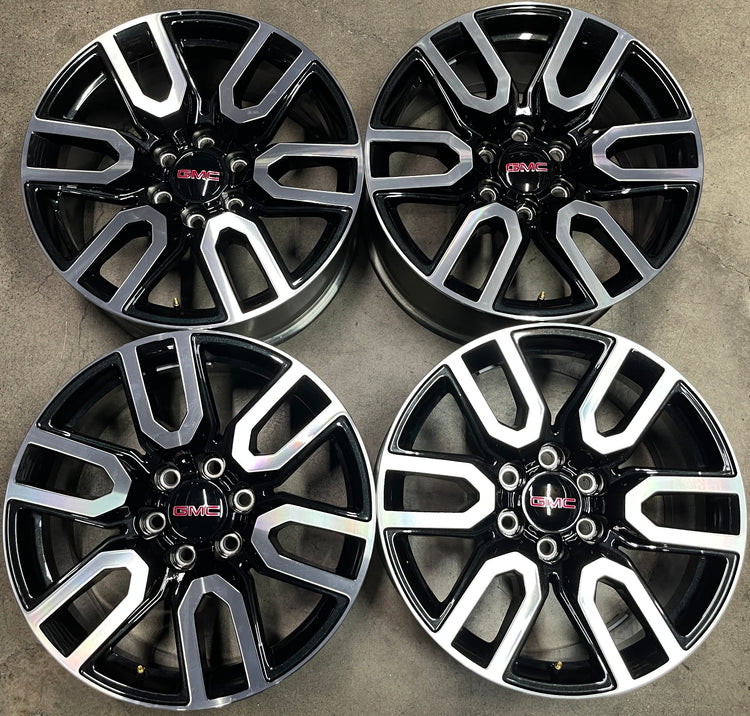 This is a Take-off set of factory 2023 2024 2025 GMC Sierra / Yukon AT4 20 inch wheels. GMC caps included, No sensors. Note: All used wheels may have blemishes not visible in pictures when looking up close.