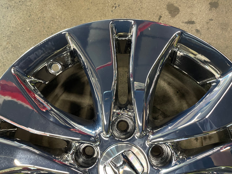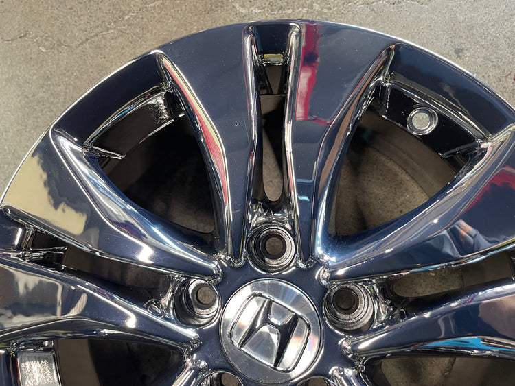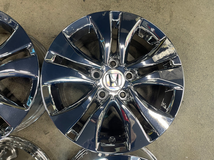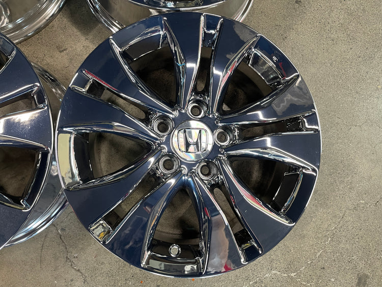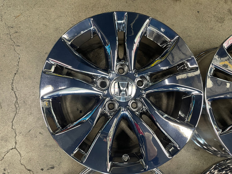 This is a set of factory 2013 2014 2015 Honda Accord 16 inch wheels. Refinished in bright chrome PVD , a few light scuffs. Caps included. No sensors. Inventory clearance item, no warranty on PVD finish, sold as is.