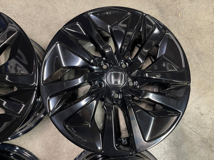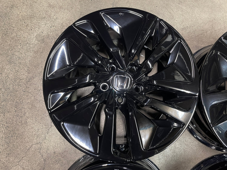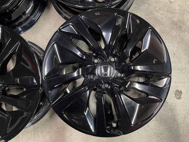 This is a set of factory 2018 2019 2020 2021 2022 Honda Accord 17" wheels. Refinished with a gloss black powder coat. Caps included. No sensors. Fit most older accord, civic, CRV, Contact us for a fitment guarantee.