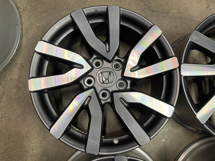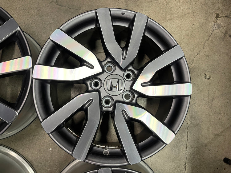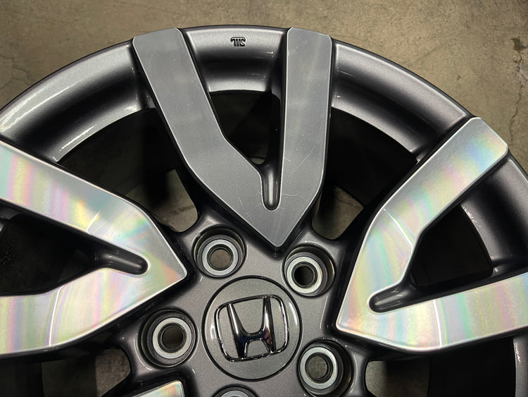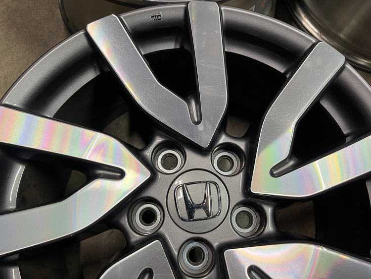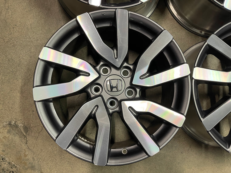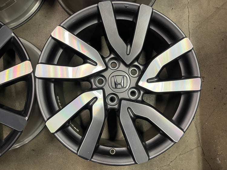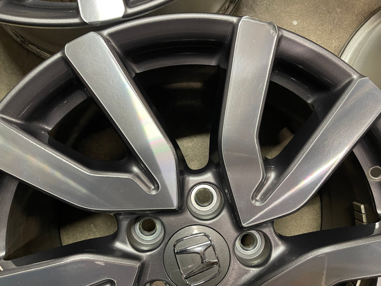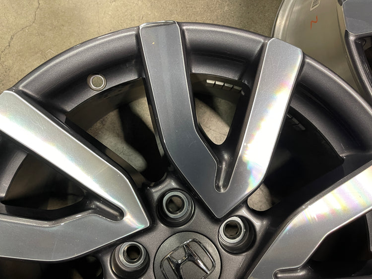 This is a used set of factory 2019 2020 2021 Honda Pilot 18 inch wheels. Has light surface scratches and two wheels have filled edges, as shown in pictures. Caps included. No sensors.