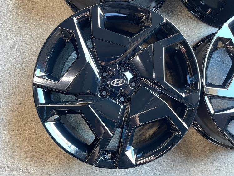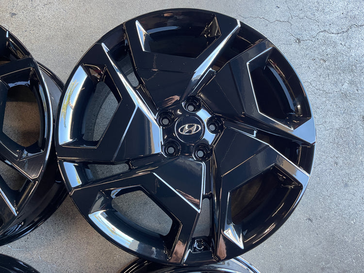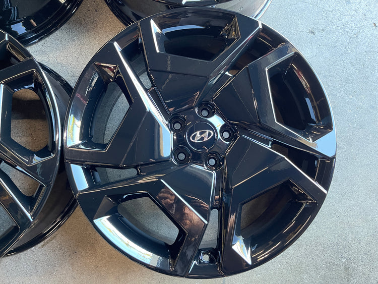 This is a set of 2020 2021 2022 2023 Hyundai Palisade / Santa Cruz 20 inch wheels. Refinished with a gloss black powder coat finish. Caps included. No sensors.