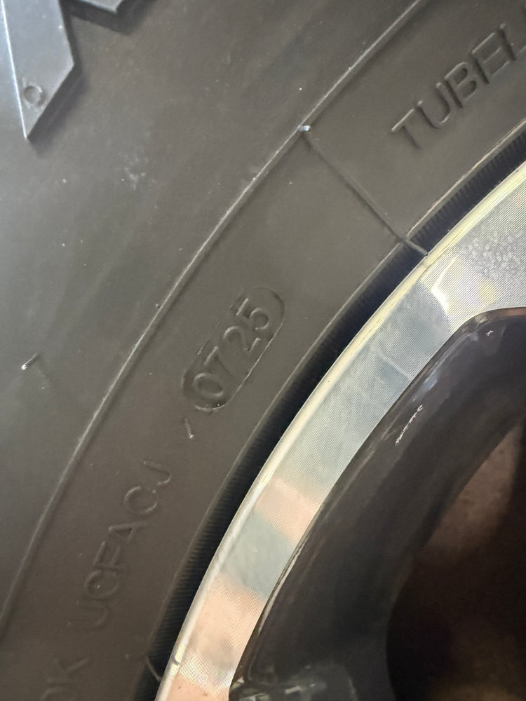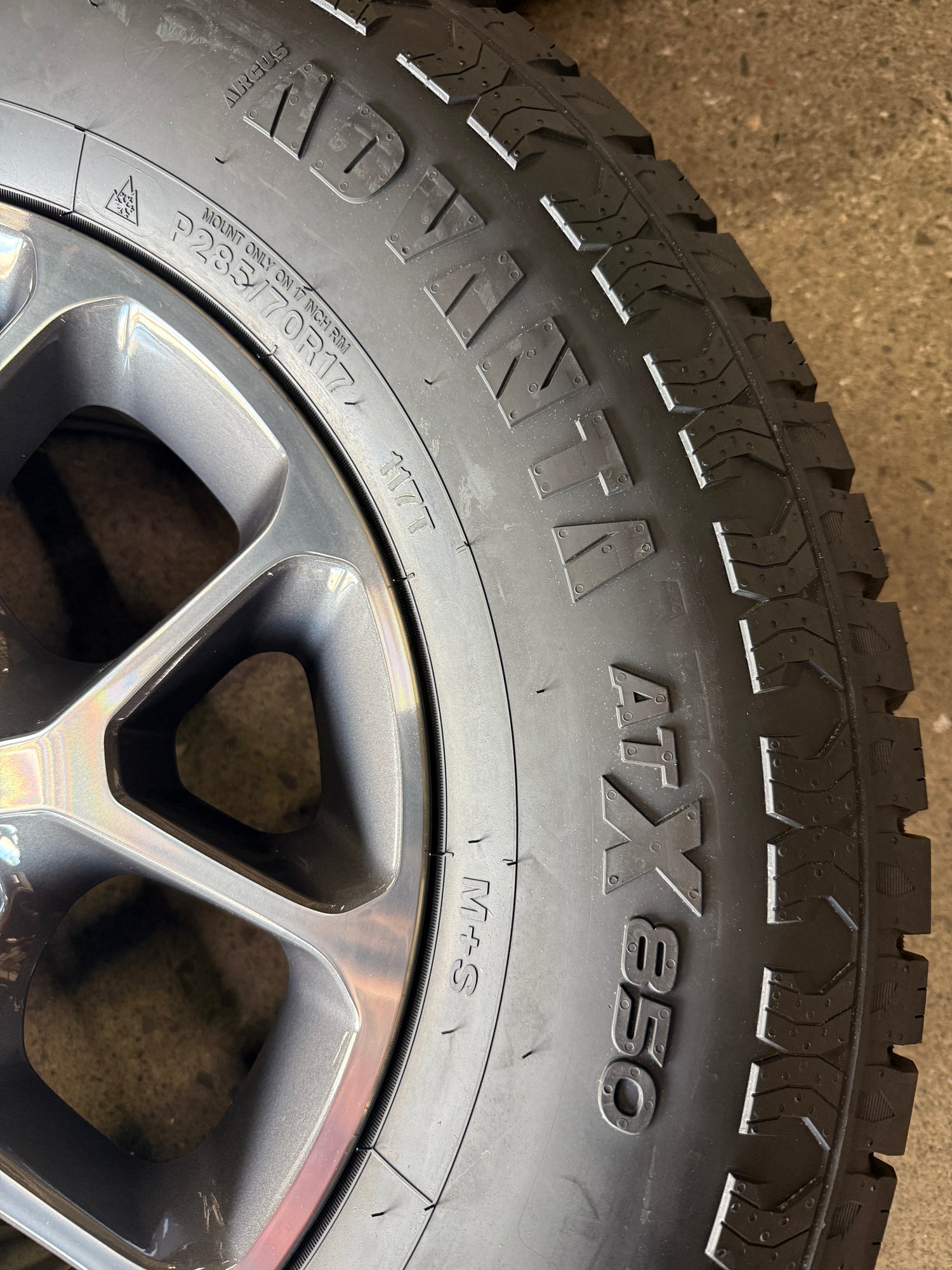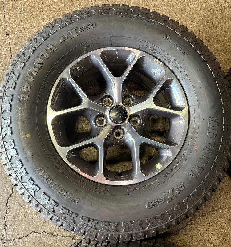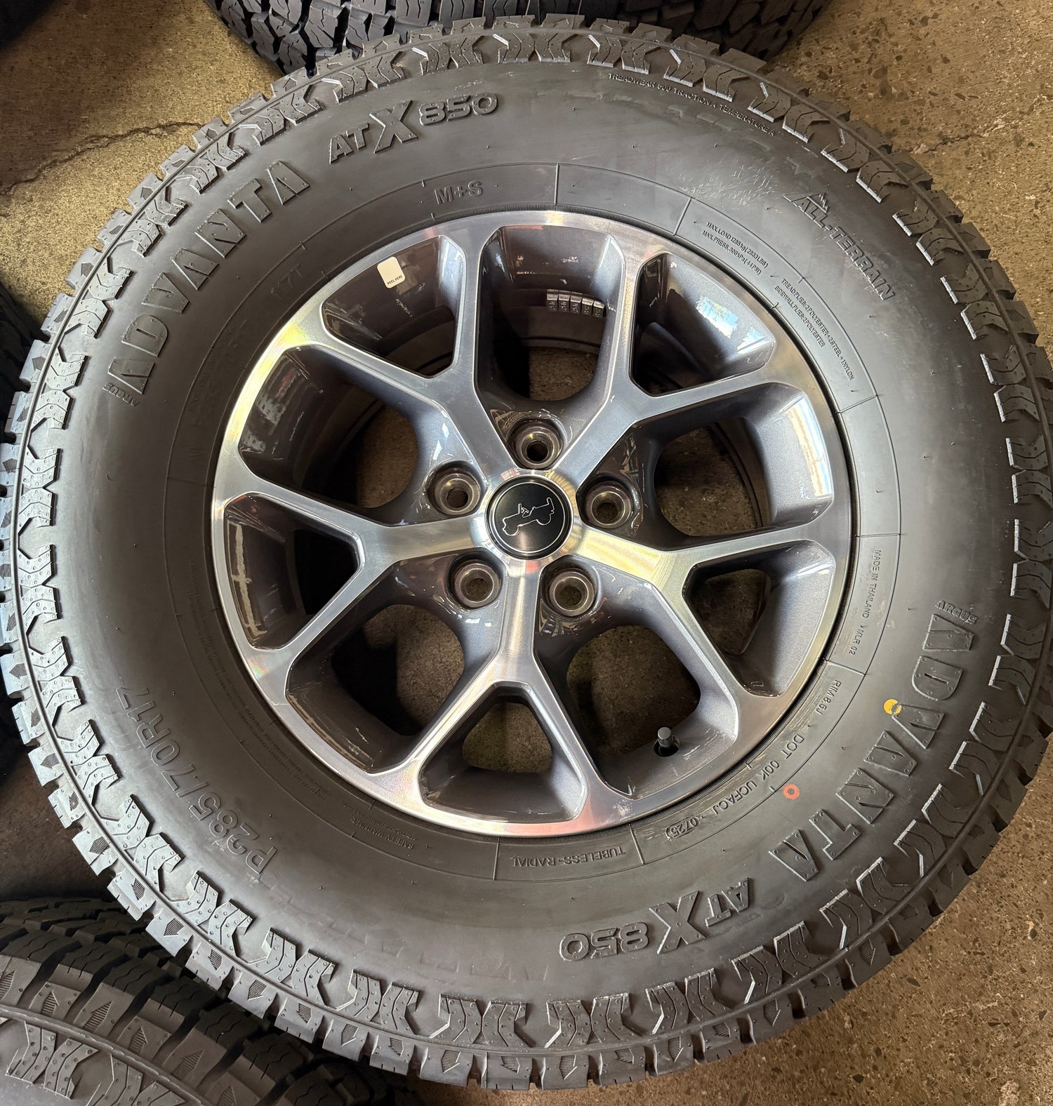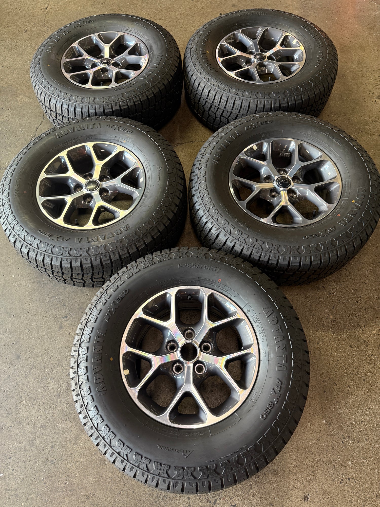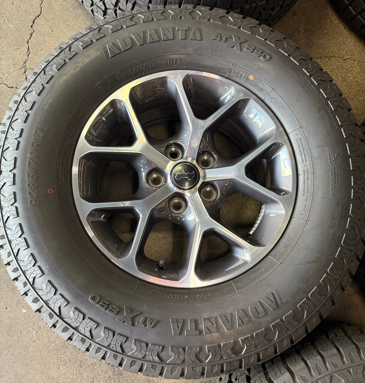 This is a set of 5 factory 2025 JEEP Wrangler 17 inch wheels with AT tires.. The wheels are takeoffs with minor blemishes, please look at the pictures, and the tires are 285/70R17 ADVANTA ATX 580. They have 99% tread left with a 0725 DOT. TPMS sensors included, compatible with 2021-2025 Wranglers and Gladiators. Note: Sensors are free, no guarantee they will be compatible with your vehicle, no cash value. This set will fit 2012 to 2025 Wrangler / Gladiator.