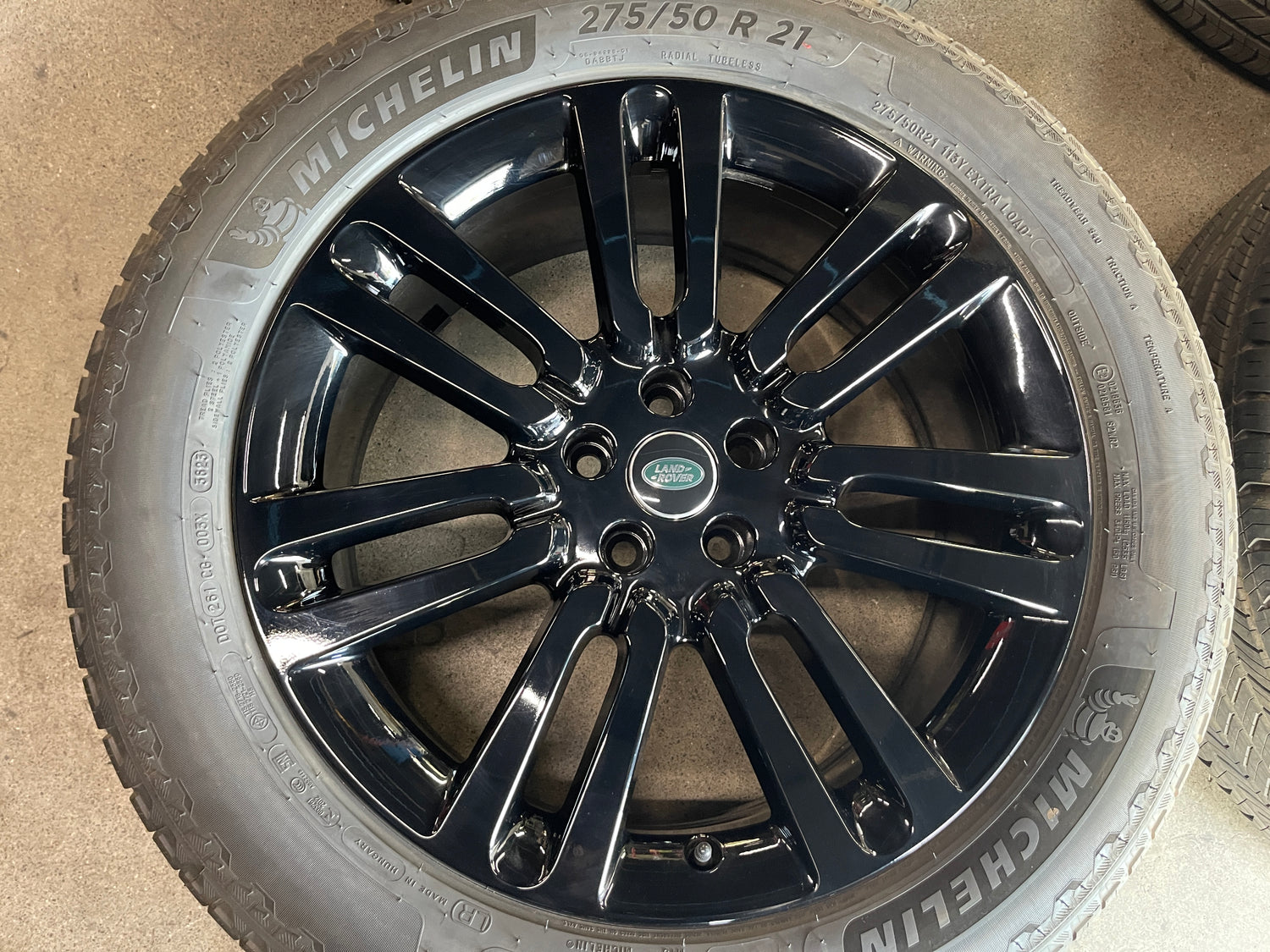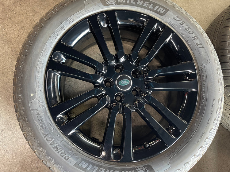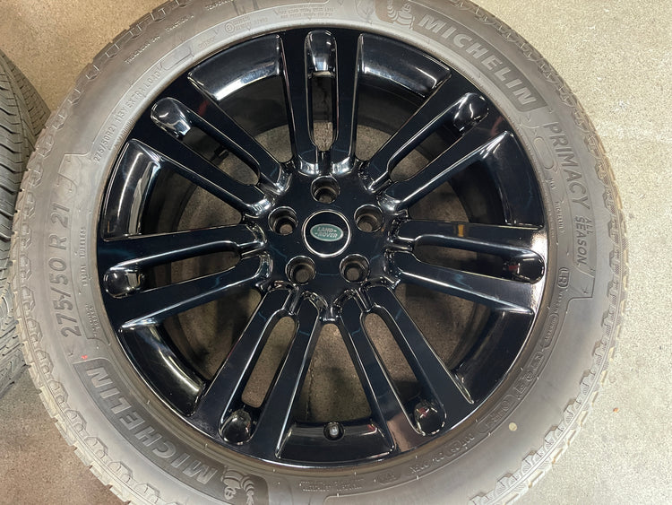 This is a take-off set of 2024 Factory Land Rover 21 inch wheels and tires. Gloss black finish. The Michelin Primacy A/S LR 275/50YR21 tires have approximately 99% tread remaining (DOT 3623) Caps included. No sensors. (Note: all used wheels may have light blemishes not visible in pictures when looking up close)