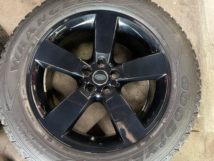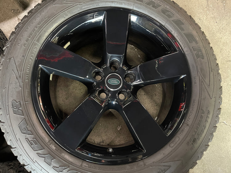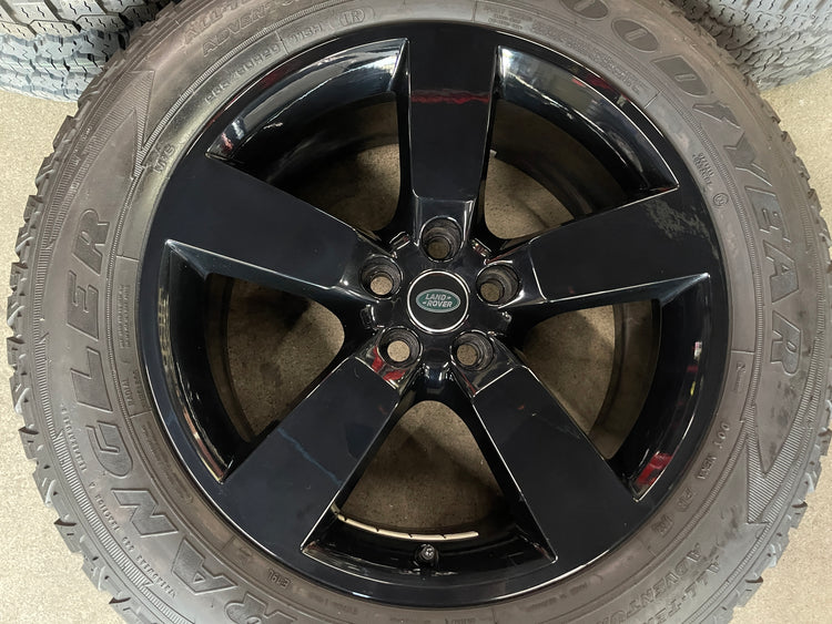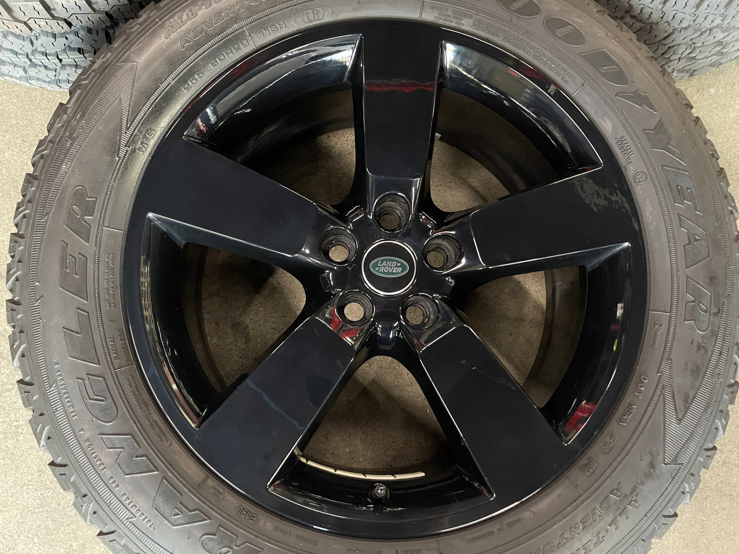 This is a used set of Five (5) 2023 2024 Factory Land Rover Defender 20 inch wheels and tires. Factory gloss black finish. The Goodyear Wrangler A/T Adventure 255/60HR20 have 83% tread remaining the spare has 99% tread remaining (10/32nd out of 12/32nds new) with a 3122 DOT. Caps included. No sensors. (Note: all used wheels may have light blemishes not visible in pictures when looking up close)