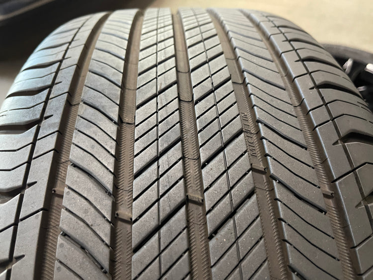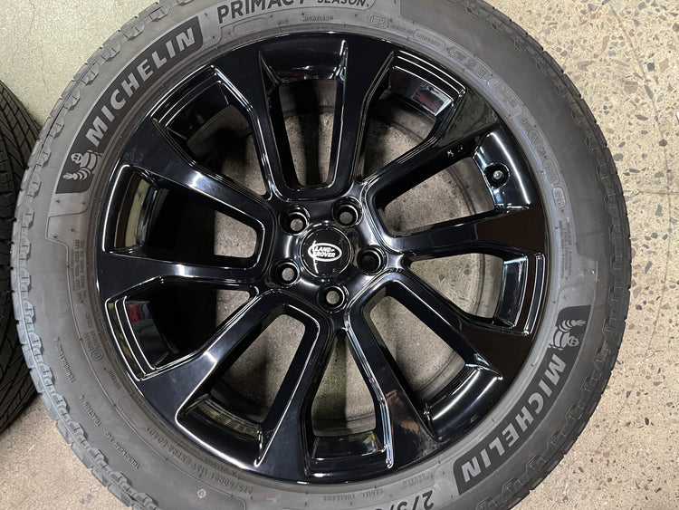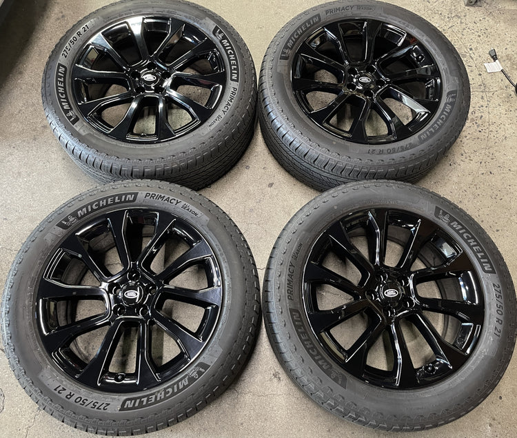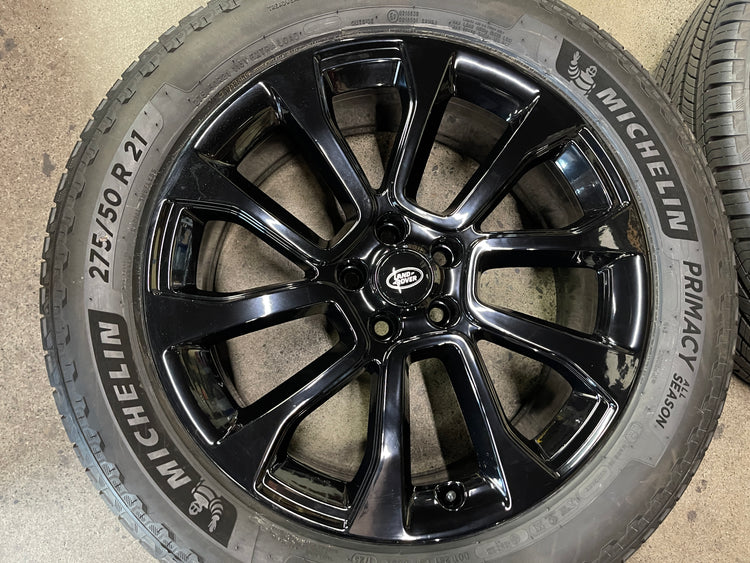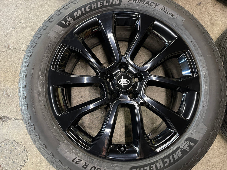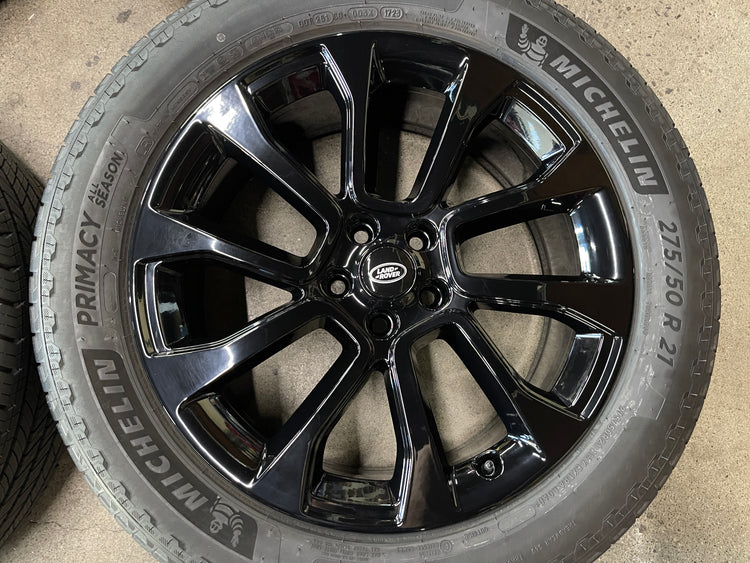 This is a Take-off set of 2022 2023 Factory Range Rover SV 21 inch wheels and tires. Refinished with a gloss black powder coat finish. The Michelin Primacy A/S LR 275/50YR21 tires have approximately 99% tread remaining.(DOT 1723) Caps included. No sensors. Fits your LR3 LR4 Sport model (5x120)