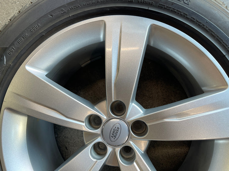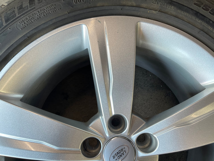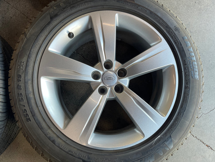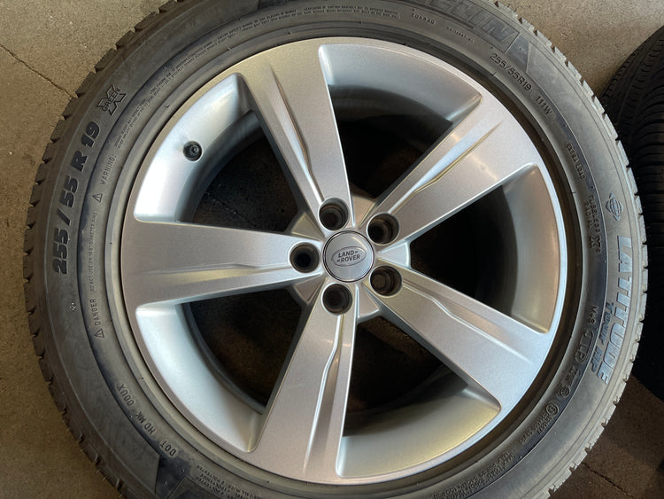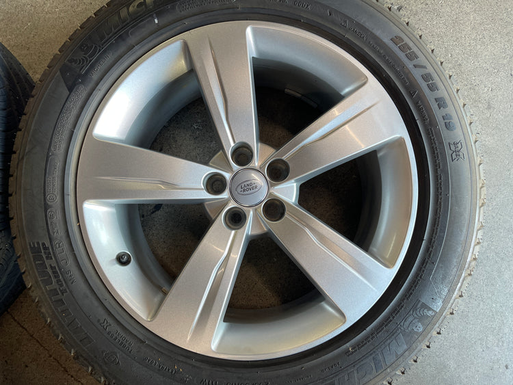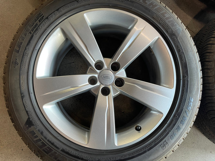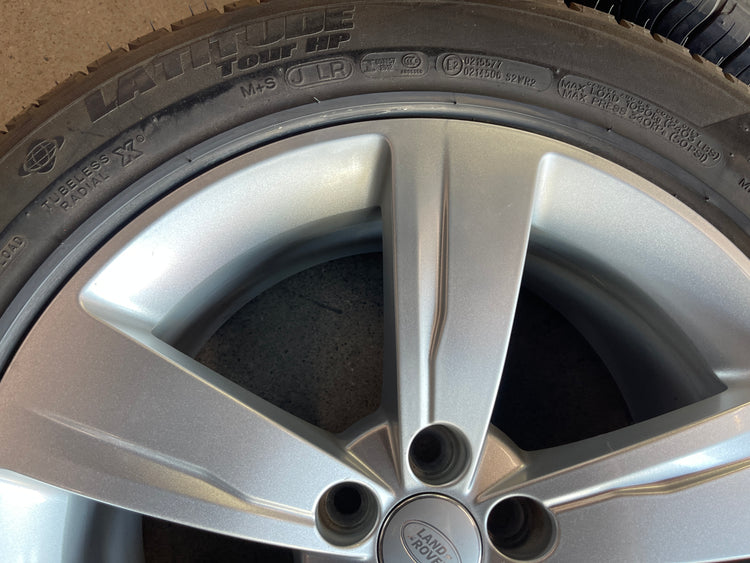 This is a used set of factory 2018 2019 Range Rover Velar 19" wheels and tires. Wheels have scuffs, with partial refinishing, as shown in pictures. The Michelin Latitude Tour HP 255/55WR19 have 70% tread remaining (7/32nd out of 10/32nd new with 0619 DOT). Caps included. No sensors. Bolt Pattern 5x108