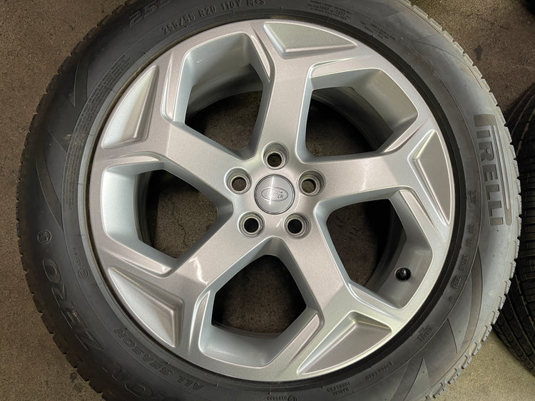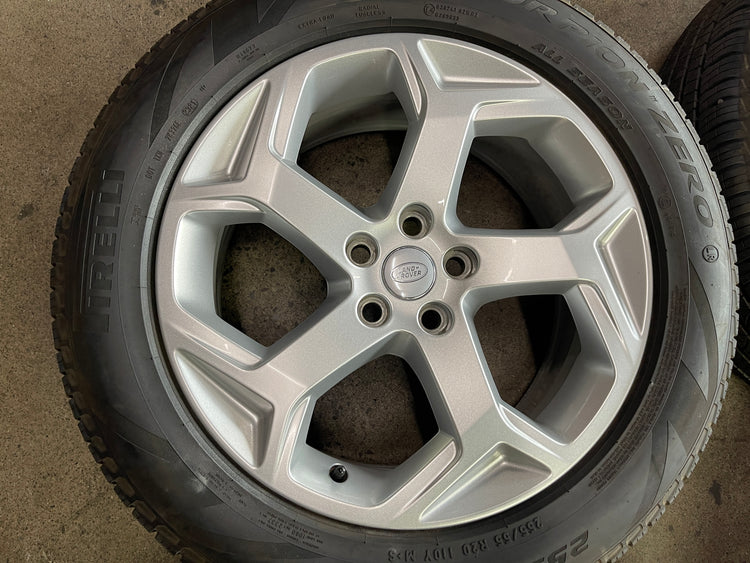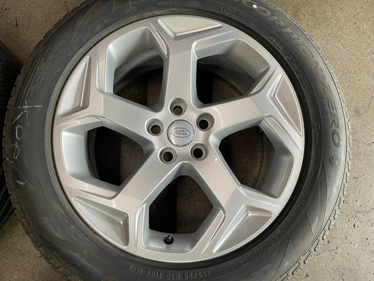 This is a Take-off set of factory 2018 2019 2020 Range Rover Sport 20" wheels and tires. The Pirelli Scorpion Zero A/S 255/55YR20 have 99% tread remaining with a 2321 DOT. Caps included. No sensors.