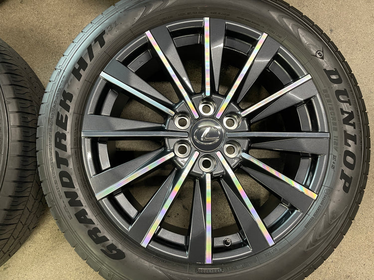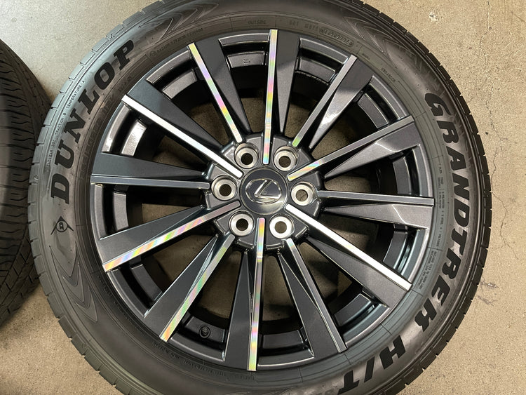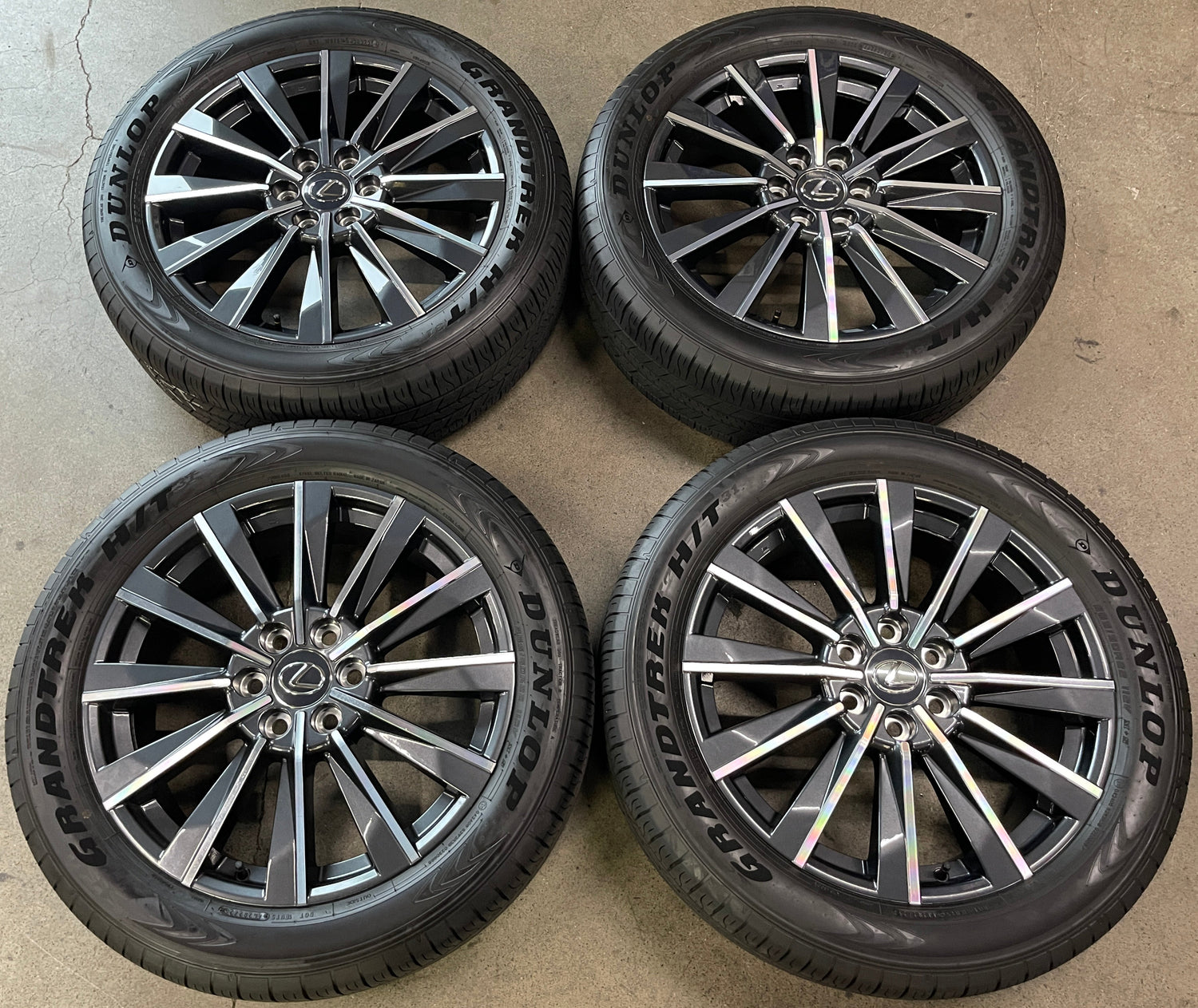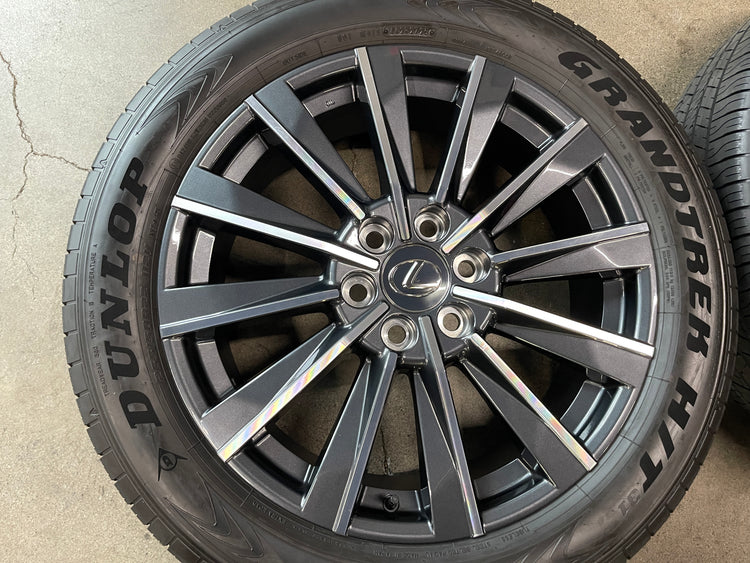 This is a clean Take-off set of factory 2024 2025 Lexus GX550 22 inch wheels and tires. The Dunlop Grandtrek HT31 265/50VR22 have 99% tread remaining with a 2725 DOT. Caps included. No sensors. Note: Bolt Pattern 6x5.5 (Note: All used wheels may have blemishes not visible in pictures when looking up close)